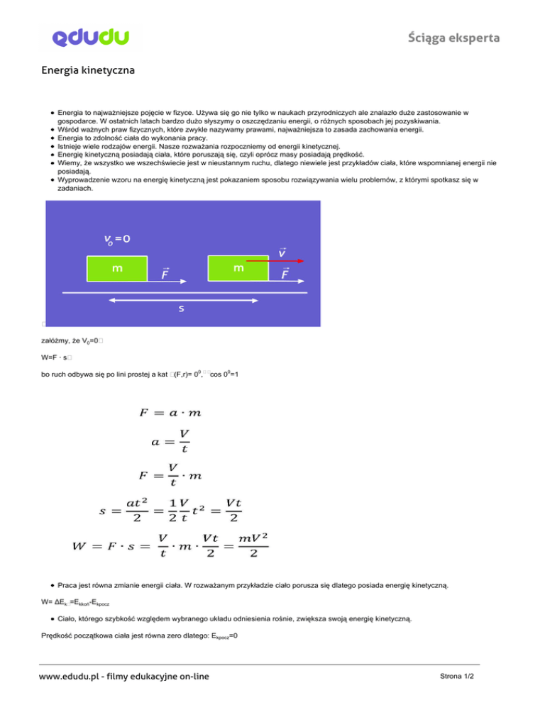 Ściąga eksperta Energia kinetyczna Energia to najważniejsze pojęcie w fizyce. Używa się go nie tylko w naukach przyrodniczych ale znalazło duże zastosowanie w gospodarce. W ostatnich latach bardzo dużo słyszymy o oszczędzaniu energii, o różnych sposobach jej pozyskiwania. Wśród ważnych praw fizycznych, które zwykle nazywamy prawami, najważniejsza to zasada zachowania energii. Energia to zdolność ciała do wykonania pracy. Istnieje wiele rodzajów energii. Nasze rozważania rozpoczniemy od energii kinetycznej. Energię kinetyczną posiadają ciała, które poruszają się, czyli oprócz masy posiadają prędkość. Wiemy, że wszystko we wszechświecie jest w nieustannym ruchu, dlatego niewiele jest przykładów ciała, które wspomnianej energii nie posiadają. Wyprowadzenie wzoru na energię kinetyczną jest pokazaniem sposobu rozwiązywania wielu problemów, z którymi spotkasz się w zadaniach. załóżmy, że V0=0 W=F · s bo ruch odbywa się po lini prostej a kat ∢(F,r)= 00, cos 00=1 Praca jest równa zmianie energii ciała. W rozważanym przykładzie ciało porusza się dlatego posiada energię kinetyczną. W= ΔEk =Ekkoń-Ekpocz Ciało, którego szybkość względem wybranego układu odniesienia rośnie, zwiększa swoją energię kinetyczną. Prędkość początkowa ciała jest równa zero dlatego: Ekpocz=0 www.edudu.pl - filmy edukacyjne on-line Strona 1/2 Ściąga eksperta Zatem: W=Ekkoń mV2/2=Ekkoń Jednostką energii kinetycznej jest [1J]. www.edudu.pl - filmy edukacyjne on-line Powered by TCPDF (www.tcpdf.org) Strona 2/2