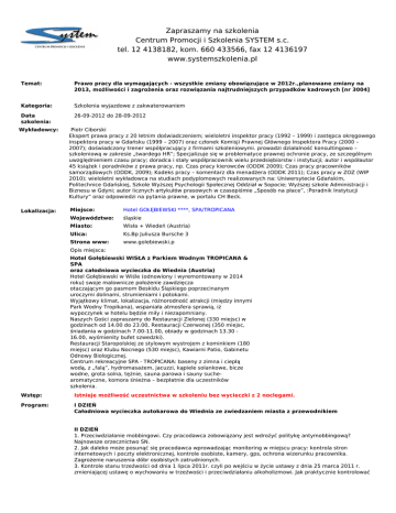 Zapraszamy na szkolenia Centrum Promocji i Szkolenia SYSTEM s.c. tel. 12 4138182, kom. 660 433566, fax 12 4136197 www.systemszkolenia.pl Temat: Prawo pracy dla wymagających - wszystkie zmiany obowiązujące w 2012r.,planowane zmiany na 2013, możliwości i zagrożenia oraz rozwiązania najtrudniejszych przypadków kadrowych [nr 3004] Kategoria: Szkolenia wyjazdowe z zakwaterowaniem Data szkolenia: 26-09-2012 do 28-09-2012 Wykładowcy: Lokalizacja: Piotr PiotrCiborski Ciborski Ekspert Ekspertprawa prawapracy pracyzz20 20letnim letnimdoświadczeniem; doświadczeniem;wieloletni wieloletniinspektor inspektorpracy pracy(1992 (1992– –1999) 1999)i izastępca zastępcaokręgowego okręgowego inspektora inspektorapracy pracywwGdańsku Gdańsku(1999 (1999– –2007) 2007)oraz orazczłonek członekKomisji KomisjiPrawnej PrawnejGłównego GłównegoInspektora InspektoraPracy Pracy(2000 (2000– – 2007); 2007);doświadczony doświadczonytrener trenerwspółpracujący współpracującyzzfirmami firmamiszkoleniowymi. szkoleniowymi.prowadzi prowadzidziałalność działalnośćkonsultingowo konsultingowo– – szkoleniową szkoleniowąwwzakresie zakresie„twardego „twardegoHR”; HR”;Specjalizuje Specjalizujesię sięwwproblematyce problematyceprawnej prawnejochronie ochroniepracy, pracy,ze zeszczególnym szczególnym uwzględnieniem uwzględnieniemczasu czasupracy; pracy;doradca doradcai istały staływspółpracownik współpracownikwielu wieluprzedsiębiorstw przedsiębiorstwi iinstytucji; instytucji;autor autori iwspółautor współautor 45 45książek książeki iporadników poradnikówzzprawa prawapracy, pracy,np. np.Czas Czaspracy pracykierowców kierowców(ODDK (ODDK2009); 2009);Czas Czaspracy pracypracowników pracowników samorządowych samorządowych(ODDK, (ODDK,2009); 2009);Kodeks Kodekspracy pracy– –komentarz komentarzdla dlamenadżera menadżera(ODDK (ODDK2011); 2011);Czas Czaspracy pracywwZOZ ZOZ(WIP (WIP 2010); 2010);wieloletni wieloletniwykładowca wykładowcana nastudiach studiachpodyplomowych podyplomowychrealizowanych realizowanychna: na:Uniwersytecie UniwersytecieGdańskim, Gdańskim, Politechnice PolitechniceGdańskiej, Gdańskiej,Szkole SzkoleWyższej WyższejPsychologii PsychologiiSpołecznej SpołecznejOddział OddziałwwSopocie; Sopocie;Wyższej Wyższejszkole szkoleAdministracji Administracjii i Biznesu BiznesuwwGdyni; Gdyni;autor autorlicznych licznychartykułów artykułówprasowych prasowychwwczasopiśmie czasopiśmie„Sposób „Sposóbna napłace”, płace”,:Poradnik :PoradnikInstytucji Instytucji Kultury” Kultury”oraz orazodpowiedzi odpowiedzina napytania pytaniaprawne, prawne,wwportalu portaluCH CHBeck. Beck. Miejsce: Hotel GOŁĘBIEWSKI ****, SPA/TROPICANA Miejsce: Hotel GOŁĘBIEWSKI ****, SPA/TROPICANA Województwo: Województwo: śląskie śląskie Miasto: Wisła ++ Wiedeń (Austria) Miasto: Wisła Wiedeń (Austria) Ulica: Ulica: Strona www: Strona www: Ks.Bp Juliusza Bursche 33 Ks.Bp Juliusza Bursche www.golebiewski.p www.golebiewski.p Opis miejsca: Opis miejsca: Hotel Gołębiewski WISŁA z Parkiem Wodnym TROPICANA && Hotel Gołębiewski WISŁA z Parkiem Wodnym TROPICANA SPA SPA oraz całodniowa wycieczka dodo Wiednia (Austria) oraz całodniowa wycieczka Wiednia (Austria) Hotel Gołębiewski ww Wiśle (odnowiony i wyremontowany ww 2014 Hotel Gołębiewski Wiśle (odnowiony i wyremontowany 2014 roku) swoje malownicze położenie zawdzięcza roku) swoje malownicze położenie zawdzięcza otaczającym gogo pasmom Beskidu Śląskiego poprzecinanym otaczającym pasmom Beskidu Śląskiego poprzecinanym uroczymi dolinami, strumieniami i potokami. uroczymi dolinami, strumieniami i potokami. Wyjątkowy klimat, lokalizacja, różnorodność atrakcji (między innymi Wyjątkowy klimat, lokalizacja, różnorodność atrakcji (między innymi Park Wodny Tropikana), wspaniała atmosfera sprawią, iż iż Park Wodny Tropikana), wspaniała atmosfera sprawią, wypoczynek ww hotelu będzie miły i niezapomniany. wypoczynek hotelu będzie miły i niezapomniany. Naszych Gości zapraszamy dodo Restauracji Zielonej (330 miejsc) ww Naszych Gości zapraszamy Restauracji Zielonej (330 miejsc) godzinach odod 14.00 dodo 23.00, Restauracji Czerwonej (350 miejsc, godzinach 14.00 23.00, Restauracji Czerwonej (350 miejsc, śniadania ww godzinach 7.00-11.00, obiady ww godzinach 13.30 - śniadania godzinach 7.00-11.00, obiady godzinach 13.30 16.00, wyśmienity bufet szwedzki). 16.00, wyśmienity bufet szwedzki). Restauracji Staropolskiej zeze stylowym wystrojem z kominkiem (180 Restauracji Staropolskiej stylowym wystrojem z kominkiem (180 miejsc) oraz Klubu Nocnego (530 miejsc), Kawiarni Patio, Gabinetu miejsc) oraz Klubu Nocnego (530 miejsc), Kawiarni Patio, Gabinetu Odnowy Biologicznej. Odnowy Biologicznej. Centrum rekreacyjne SPA - TROPICANA: baseny z zimna i ciepłą Centrum rekreacyjne SPA - TROPICANA: baseny z zimna i ciepłą wodą, z „falą”, hydromasażem, jacuzzi, kąpiele solankowe, bicze wodą, z „falą”, hydromasażem, jacuzzi, kąpiele solankowe, bicze wodne, grota solna, tężnie, sauna parowa i sauny suchewodne, grota solna, tężnie, sauna parowa i sauny suchearomatyczne, komora śnieżna – bezpłatnie dla uczestników aromatyczne, komora śnieżna – bezpłatnie dla uczestników szkolenia. szkolenia. Wstęp: Istnieje możliwość uczestnictwa w szkoleniu bez wycieczki z 2 noclegami. Program: I DZIEŃ Całodniowa wycieczka autokarowa do Wiednia ze zwiedzaniem miasta z przewodnikiem II DZIEŃ 1. Przeciwdziałanie mobbingowi. Czy pracodawca zobowiązany jest wdrożyć politykę antymobbingową? Najnowsze orzecznictwo SN. 2. Jak daleko może posunąć się pracodawca wprowadzając monitoring w miejscu pracy: kontrola stron internetowych i poczty elektronicznej, kontrole osobiste, kamery, gps, ochrona wizerunku pracownika. Zagrożenie naruszenia dóbr osobistych zatrudnionych. 3. Kontrole stanu trzeźwości od dnia 1 lipca 2011r. czyli po wejściu 