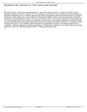 Szkoła Podstawowa w Podmoklach Małych Spotkanie dla rodziców pt. "Jak mama tatę poznała" Dnia 8.06.2014r. odbyło się przedstawienie pt. "Jak mama tatę poznała?" z okazji Dnia Matki i Ojca z udziałem chętnych uczniów z klas od II do VI. Napisany scenariusz w formie musicalu jest autorstwem p. Weroniki Kandulskiej oraz p. Eweliny Augustyniak, które przygotowywały jednocześnie dzieci do występu. Spotkanie, które odbyło się w sali wiejskiej w Podmoklach Małych miało na celu przypomnieć kochanym rodzicom ich najwspanialsze chwile z ich życia od momentu jak to się poznali. Opowieść rozpoczynała się już w przedszkolu gdzie po raz pierwszy połączyły się ich drogi przez szkołę podstawową, szkołę średnią i studia. Przedstawienie dobiegało końca gdy mama i tata stanęli na ślubnym kobiercu, a następnie razem kroczyli przez życie, aż do starości gdzie doczekali się wspaniałych wnuków. Na zakończenie wszyscy uczniowie - aktorzy zaśpiewali wspólnie piosenkę pt. "Cudownych rodziców mam" jednocześnie wręczając rodzicom ordery dla "Najwspanialszej mamy" i "Najwspanialszego taty". http://www.szkolapodmokle.babimost.pl Kreator PDF Utworzono 4 March, 2017, 00:11