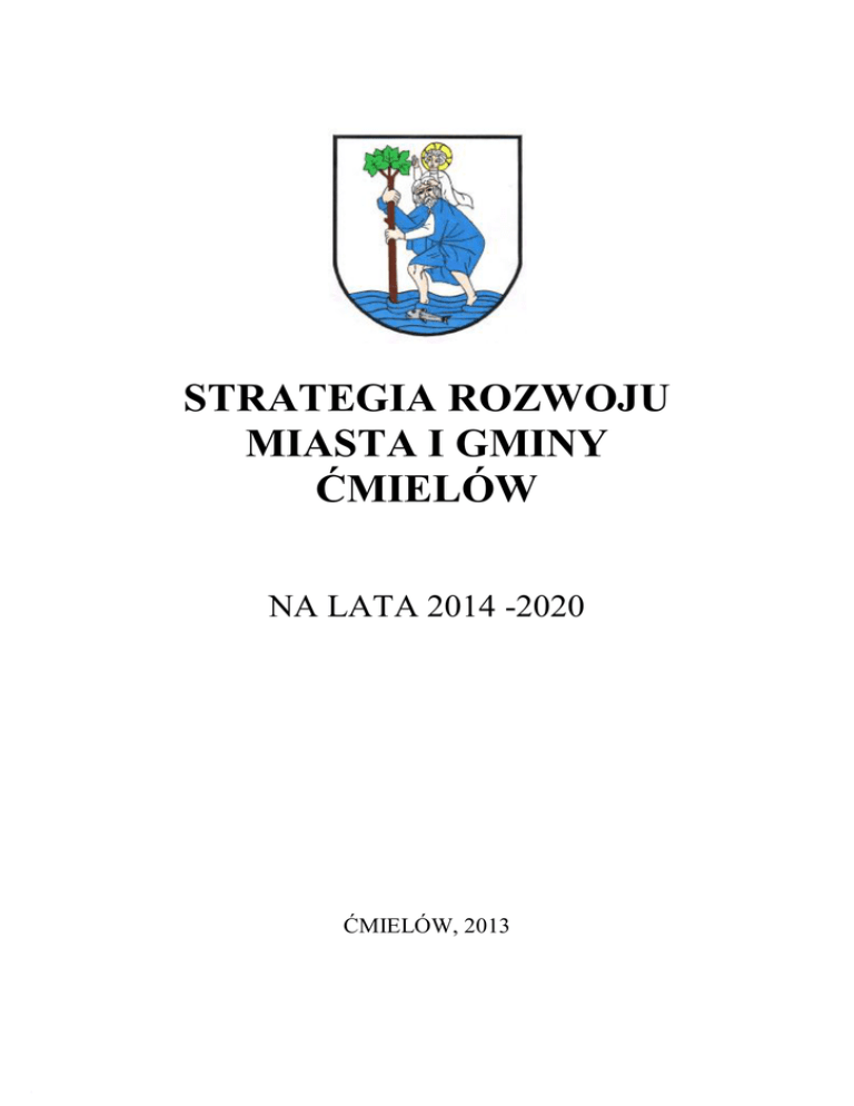 STRATEGIA ROZWOJU MIASTA I GMINY ĆMIELÓW NA LATA 2014 -2020 ĆMIELÓW, 2013 Strategia Rozwoju Miasta i Gminy Ćmielów SPIS TREŚCI SPIS TREŚCI.........................................................................................................................2 1. WSTĘP ..........................................................................................................................3 2. CHARAKTERYSTYKA MIASTA I GMINY ĆMIELÓW.............................................5 2.1. Położenie i przynależność administracyjna………………………………………..5 2.2. Powierzchnia………………………………………………………………………7 2.3. Ludność……………………………………………………………………………7 2.4. Rys historyczny………………………………………………………………..…10 2.5. Gospodarka……………………………………………………………………….13 2.6. Rolnictwo…………………………………………………………………………15 2.7. Bezrobocie……………………………………………………………………..…17 2.8. Oświata………………………………………………………………………..….19 2.9. Ochrona zdrowia i opieka społeczna…………………………………………..…23 2.9.1. Ochrona zdrowia……………………………………………...………………..23 2.9.2. Opieka społeczna……………………………………………...………………..24 2.10. Turystyka i sport……………………………………………………………..….30 2.10.1. Turustyka……………………………………………………………………...30 2.10.2. Sport…………………………………………………………………………..33 2.11. Kultura……………………………………………………………………….….35 2.12. Bezpieczeństwo…………………………………………………………………37 2.13. Infrastruktura……………………………………………………………………37 2.13.1 Transport i komunikacja……………………………………………….37 2.13.2. Telekomunikacja…………………………………………...…………38 2.12.3. Zaopatrzenie w ciepło i gospodarka mieszkaniowa.………………….39 2.13.4. Zaopatrzenie w gaz……………………………………………………39 2.13.5. Elektroenergetyka……………………………………………………..40 2.13.6 Zaopatrzenie w wodę………………………………………………….41 2.13.7 Kanalizacja ………………………………………………………...….42 2.13.8. Gospodarka odpadami…………………………………………..…….43 2.14. Zasoby przyrodnicze i środowiskowe …………………………….……………44 3. OCENA MOCNYCH I SŁABYCH STRON MIASTA I GMINY ĆMIELÓW.….48 4. MISJA, CELE I KIERUNKI ROZWOJU………………………………….. ……..54 4.1. Misja rozwoju…………………………………………………………………….54 4.2. Cele i kierunki rozwoju…………………………………………………………..54 4.3. Strategiczne działnia i zadania………………………………………………...…62 5. WDRAŻANIE STRATEGII……………………………………………………….63 6. MONITOROWANIE STRATEGII …………………………………………….…63 7. PODSUMOWANIE………………………………………………………………..64 8. SPIS TABEL, RYSUNKÓW I WYKRESÓW…………………………………….65 2 Strategia Rozwoju Miasta i Gminy Ćmielów 1. WSTĘP Obecność Polski w Unii Europejskiej stworzyła mieszkańcom kraju, w tym mieszkańcom gminy Ćmielów ogromną szansę zmniejszenia dystansu do najwyżej rozwiniętych społeczeństw. Bardzo dynamiczne zmiany uwarunkowań zewnętrznych rozwoju regionu stwarzają perspektywy realizacji strategicznych celów rozwojowych gminy. Kierunki rozwojowe gminy winny się wychodzić naprzeciw zachodzącym zmianom poprzez kreowanie przez samorząd gminny odpowiednich warunków do rozwoju aktywności mieszkańców pod względem społecznym i gospodarczym. Celem strategii jest rozpoznanie uwarunkowań rozwojowych gminy oraz sformułowanie w korelacji z oczekiwaniami mieszkańców gminy i określenie oczekiwanych kierunków rozwojowych. Aktualizacja strategii rozwoju miasta i gminy Ćmielów uchwalonej w 1998 roku ma na celu również dostosowanie jej do nowego okresu programowania, do nowej formuły planowania działań ze szczególnym uwzględnieniem, działań wspieranych z funduszy Unii Europejskiej, a także konieczność zintegrowania polityk na poziomie regionalnym i lokalnym. W niniejszym dokumencie dokonano: Ÿ analizę wewnętrznych i zewnętrznych czynników wpływających na rozwój gminy, Ÿ sformułowano misję rozwoju do roku 2020 Ÿ wyznaczono cele i kierunki działań w latach 2014 – 2020 Ÿ określono podstawowe projekty wdrażające strategię rozwojową gminy Ćmielów W pierwszym etapie uzyskane dane stanowiły podstawę do opracowania projektu, którego zadaniem jest przedstawienie misji rozwoju gminy oraz sformułowanie kierunków rozwojowych i podstawowych działań. Cele niniejszej strategii są powiązane z dokumentami strategicznymi województwa świętokrzyskiego, w których podkreśla się dążenie do podniesienia standardów w województwie poprzez wzrost rozwoju gospodarczego, a także poprawę jakości życia mieszkańców. 3 Strategia Rozwoju Miasta i Gminy Ćmielów Strategia określa cele rozwoju gminy w zmieniających się warunkach zewnętrznych i wewnętrznych kraju, wskazuje drogę przygotowania do dalszego funkcjonowania w strukturach Unii Europejskiej. Efektywne wdrażanie Str