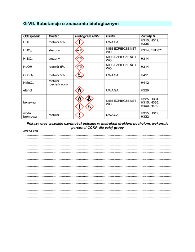 G-VII. Substancje o znaczeniu biologicznym Odczynnik Postać HCl roztwór 5% UWAGA HNO3 stężony NIEBEZPIECZEŃST WO H314, EUH071 H2SO4 stężony NIEBEZPIECZEŃST WO H314 NaOH roztwór 5% NIEBEZPIECZEŃST WO H314 CuSO4 roztwór 5% UWAGA H411 KMnO4 roztwór rozcieńczony - H412 etanol UWAGA H226 benzyna NIEBEZPIECZEŃST WO H225, H304, H315, H336, H400, H410 UWAGA H315, H319, H332 woda bromowa roztwór Piktogram GHS - Hasło Zwroty H H315, H319, H335 Pokazy oraz wszelkie czynności opisane w instrukcji drukiem pochyłym, wykonuje personel CCKP dla całej grupy NOTATKI ............................................................................................................................................................... ............................................................................................................................................................... ............................................................................................................................................................... ............................................................................................................................................................... ............................................................................................................................................................... ............................................................................................................................................................... ............................................................................................................................................................... ............................................................................................................................................................... ............................................................................................................................................................... ............................................................................................................................................................... ............................................................................................................................................................... ............................................................................................................................................................... ............................................................................................................................................................... ............................................................................................................................................................... ............................................................................................................................................................... ............................................................................................................................................................... ............................................................................................................................................................... ............................................................................................................................................................... ............................................................................................................................................................... G-VII-1. Badanie rozpuszczalności tłuszczów Sprzęt: -3 probówki Odczynniki: - olej jadalny - etanol - benzyna - woda destylowana Do trzech probówek zawierających kolejno: 1cm3 wody, 1cm3 etanolu i 1cm3 benzyny, dodaj po kilka kropli oleju jadalnego. Każdą probówką wstrząśnij. Co dzieje się w każdej z probówek bezpośrednio po wstrząśnięciu, a co po chwili. Obserwacje: probówka 1 (woda + olej): ............................................................................................. ....................................................................................................................................... ....................................................................................................................................... probówka 2 (etanol + olej): ............................................................................................ ....................................................................................................................................... ....................................................................................................................................... probówka 3 (benzyna + olej): ......................................................................................... ....................................................................................................................................... ....................................................................................................................................... ....................................................................................................................................... Wnioski: ....................................................................................................................................... ....................................................................................................................................... ....................................................................................................................................... ....................................................................................................................................... ................................................................................................................................