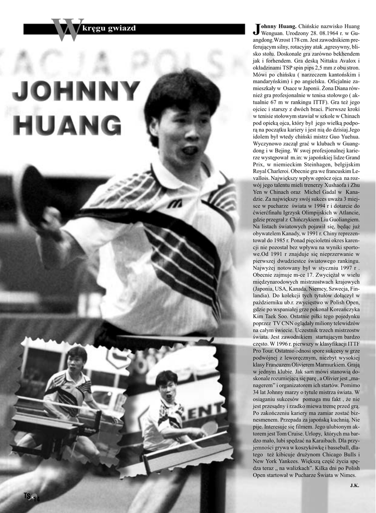 W krêgu gwiazd J ohnny Huang. Chiñskie nazwisko Huang Wenguan. Urodzony 28. 08.1964 r. w Guangdong.Wzrost 178 cm. Jest zawodnikiem preferuj¹cym silny, rotacyjny atak ,agresywny, blisko sto³u. Doskonale gra zarówno bekhendem jak i forhendem. Gra desk¹ Nittaku Avalox i ok³adzinami TSP spin pips 2,5 mm z obu stron. Mówi po chiñsku ( narzeczem kantoñskim i mandaryñskim) i po angielsku. Oficjalnie zamieszka³y w Osace w Japonii. ¯ona Diana równie¿ gra profesjonalnie w tenisa sto³owgo ( aktualnie 67 m w rankingu ITTF). Gra te¿ jego ojciec i starszy z dwóch braci. Pierwsze kroki w tenisie sto³owym stawia³ w szkole w Chinach pod opiek¹ ojca, który by³ jego wielk¹ podpor¹ na pocz¹tku kariery i jest ni¹ do dzisiaj.Jego idolem by³ wtedy chiñski mistrz Guo Yuehua. Wyczynowo zacz¹³ graæ w klubach w Guangdong i w Bejing. W swej profesjonalnej karierze wystêpowa³ m.in: w japoñskiej lidze Grand Prix, w niemieckim Steinhagen, belgijskim Royal Charleroi. Obecnie gra we francuskim Levallois. Najwiêkszy wp³yw oprócz ojca na rozwój jego talentu mieli trenerzy Xushaofa i Zhu Yen w Chinach oraz Michel Gadal w Kanadzie. Za najwiêkszy swój sukces uwa¿a 3 miejsce w pucharze wiata w 1994 r i dotarcie do æwieræfina³u Igrzysk Olimpijskich w Atlancie, gdzie przegra³ z Chiñczykiem Liu Guoliangiem. Na listach wiatowych pojawi³ siê, bêd¹c ju¿ obywatelem Kanady, w 1991 r. Chiny reprezentowa³ do 1985 r. Ponad piêcioletni okres karencji nie pozosta³ bez wp³ywu na wyniki sportowe.Od 1991 r znajduje siê nieprzerwanie w pierwszej dwudziestce wiatowego rankingu. Najwy¿ej notowany by³ w styczniu 1997 r . Obecnie zajmuje m-ce 17. Zwyciê¿a³ w wielu miêdzynarodowych mistrzostwach krajowych (Japonia, USA, Kanada, Niemcy, Szwecja, Finlandia). Do kolekcji tych tytu³ów do³¹czy³ w padzierniku ub.r. zwyciêstwo w Polish Open, gdzie po wspania³ej grze pokona³ Koreañczyka Kim Taek Soo. Ostatnie pi³ki tego pojedynku poprzez TV CNN ogl¹da³y miliony telewidzów na ca³ym wiecie. Uczestnik trzech mistrzostw wiata. Jest zawodnikiem startuj¹cym bardzo czêsto. W 1996 r. pierwszy w klasyfikacji ITTF Pro Tour. Ostatnio odnosi spore sukcesy w grze podwójnej z leworêcznym, niezbyt wysokiej klasy Francuzem Olivierem Marmurkiem. Graj¹ w jednym klubie. Jak sam mówi stanowi¹ doskonale rozumiej¹c¹ siê parê , a Olivier jest managerem i organizatorem ich startów. Pomimo 34 lat Johnny marzy o tytule mistrza wiata. W osi¹ganiu sukcesów pomaga mu fakt , ¿e nie jest przes¹dny i rzadko miewa tremê przed gr¹. Po zakoñczeniu kariery ma zamiar zostaæ biznesmenem. Przepada za japoñsk¹ kuchni¹. Nie pije. Interesuje siê filmem. Jego ulubionym aktorem jest Tom Cruise. Urlopy, których ma bardzo ma³o, lubi spêdzaæ na Karaibach. Dla przyjemnoci grywa w koszykówkê i basseball, dlatego te¿ kibicuje dru¿ynom Chicago Bulls i New York Yankees. Wiêksz¹ czêæ ¿ycia spêdza teraz na walizkach. Kilka dni po Polish Open startowa³ w Pucharze wiata w Nimes. J.K. TS 14