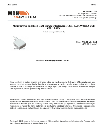 MDH System Strona 1 MDH-SYSTEM ul. Bajkowa 5, Lublin tel./fax.81-444-62-85 lub kom.693-865-235 e mail: [email protected] Miniaturowy podsłuch GSM ukryty w ładowarce USB, ŁADOWARKA USB CALL BACK Produkt z kategorii: Podsłuchy Cena: 590.00 zł z VAT (479.67 zł netto) Podsłuch GSM ukryty ładowarce USB Mały podsłuch, o dobrej czułości mikrofonu udało się zaadoptować w ładowarce USB, rozwiązując tym samym problem jego zasilenia. Podsłuch wbudowany w zasilacz może równocześnie służyć jako ładowarka USB do każdego sprzętu elektronicznego wykorzystującego ten standard, oraz w tym samym czasie pracować jako bezprzewodowy podsłuch GSM. Niewątpliwa zaleta podsłuchu jest jego nieograniczony zasięg, z drugiego końca świata możemy wysłuchać co dzieje się w naszym samochodzie... Jest tak ponieważ w zasadzie urządzenie działa jak miniaturowy telefon gsm. Po instalacji w nim karty sim dowolnego operatora, możemy w dowolnym momencie na numer tej karty zadzwonić z praktycznie każdego telefonu. Urządzenie automatycznie odbiera połączenie, a czuły mikrofon precyzyjnie wychwytuje wszystkie dźwięki z pomieszczenia. Podsłuch GSM ukryty w ładowarce sieciowej USB umożliwia dyskretny nasłuch otoczenia. Posiada czułe dwa mikrofony działające w promieniu do 5 m. MDH System Strona 2 Działa automatycznie po włożeniu karty SIM ( bez pinu i ustawionej poczty głosowej ). Moduł wyposażony jest w funkcję VOX call back ( aktywacja głosem ) czyli oddzwanianie po wykryciu głosu lub dźwięku powyżej 45dB. Sterowanie modułem odbywa się za pomocą komend SMS lub przez wykonanie połączenia telefonicznego. Urządzenie funkcjonuje jak zwykła ładowarka sieciowa. Parametry techniczne zestawu: Model Podsłuch GSM w ładowarce USB Wymiary 51x47x27mm Zasięg mikrofonu Do 5 m Czas czuwania do 72 godzin w zależności od warunków pracy ( siła sygnału GSM ) lub przez cały czas przy podłączeniu do prądu. Czas nasłuchu do 3 godzin w zależności od warunków pracy lub przez cały czas przy podłączeniu do prądu. Waga ok. 43 g Wbudowany akumulator tak, 500 mAh Zasilanie AC 110-220V 50/60Hz Materiał obudowy Plastik Zapraszamy do naszego sklepu internetowego www.mdh-system.pl Dokument wygenerowany 2017-03-04 o godzinie 01:11