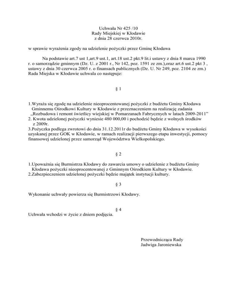 Uchwała Nr 425 /10 Rady Miejskiej w Kłodawie z dnia 28 czerwca 2010r. w sprawie wyrażenia zgody na udzielenie pożyczki przez Gminę Kłodawa Na podstawie art.7 ust 1,art.9 ust.1, art.18 ust.2 pkt.9 lit.i ustawy z dnia 8 marca 1990 r. o samorządzie gminnym (Dz. U. z 2001 r., Nr 142, poz. 1591 ze zm.),oraz art.6 ust.2 pkt 3 , ustawy z dnia 30 czerwca 2005 r. o finansach publicznych (Dz. U. Nr 249, poz. 2104 ze zm.) Rada Miejska w Kłodawie uchwala co następuje: §1 1.Wyraża się zgodę na udzielenie nieoprocentowanej pożyczki z budżetu Gminy Kłodawa Gminnemu Ośrodkowi Kultury w Kłodawie z przeznaczeniem na realizację zadania „Rozbudowa i remont świetlicy wiejskiej w Pomarzanach Fabrycznych w latach 2009-2011” 2. Kwota udzielonej pożyczki wyniesie 480 000,00 i pochodzić będzie z wolnych środków z 2009r. 3.Pożyczka podlega zwrotowi do dnia 31.12.2011r do budżetu Gminy Kłodawa w wysokości uzyskanej przez GOK w Kłodawie, w ramach realizacji pierwszego etapu inwestycji, pomocy finansowej udzielonej przez samorząd Województwa Wielkopolskiego. §2 1.Upoważnia się Burmistrza Kłodawy do zawarcia umowy o udzielenie z budżetu Gminy Kłodawa pożyczki nieoprocentowanej z Gminnym Ośrodkiem Kultury w Kłodawie. 2.Zabezpieczeniem udzielonej pożyczki będzie majątek instytucji kultury. §3 Wykonanie uchwały powierza się Burmistrzowi Kłodawy. §4 Uchwała wchodzi w życie z dniem podjęcia. Przewodnicząca Rady Jadwiga Jaroniewska