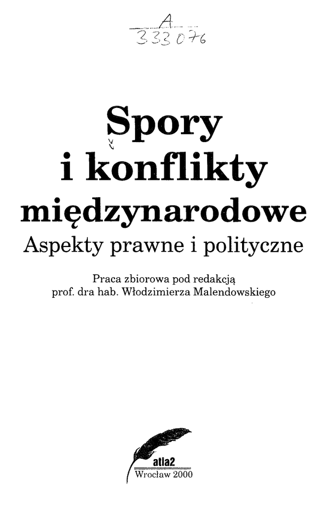 A Spory i konflikty międzynarodowe Aspekty prawne i polityczne Praca zbiorowa pod redakcją prof. dra hab. Włodzimierza Malendowskiego Wrocław 2000 Spis treści Wprowadzenie 7 1. Zakaz stosowania siły w prawie międzynarodowym Włodzimierz Malendowski 20 2. Regulacja sporów międzynarodowych i konfliktów zbrojnych w systemie organizacji Narodów Zjednoczonych Włodzimierz Malendowski 67 3. System regulacji sporów międzynarodowych w ramach OBWE Jolanta Bryła 105 4. System regulacji międzynarodowych przez Ligę Państw Arabskich Karina Michalak 127 5. Sytuacja ludności cywilnej podczas konfliktów zbrojnych Joanna Dobrowolska 142 6. Problem baskijski Hanna Szymańska 162 7. Hongkong - od brytyjskiej kolonii koronnej do specjalnego regionu administracyjnego ChRL Adrianna Kowalska 191 8. Problem narodu kurdyjskiego Anna Kawczyńska 219 9.„Porozumienie wielkopiątkowe" jako próba uregulowania konfliktu w Irlandii Północnej Adrianna Kowalska 247 10. Wojna w Czeczenii Piotr Grochmalski 270 11. Konflikt o Górny Karabach PiotrJastrzębski 300 12. Konflikt abchaski Piotr Jastrzębski 330 13. Konflikt w Kosowie Sebastian Wojciechowski 354 14. Napięcia i konflikty w Europie Środkowo-Wschodniej Sebastian Wojciechowski 384 15. Regulacje problemów etnicznych w regionie nordyckim na przykładzie Eskimosów i Lapończyków Joanna Nowiak i Wojciech Nowiak 410