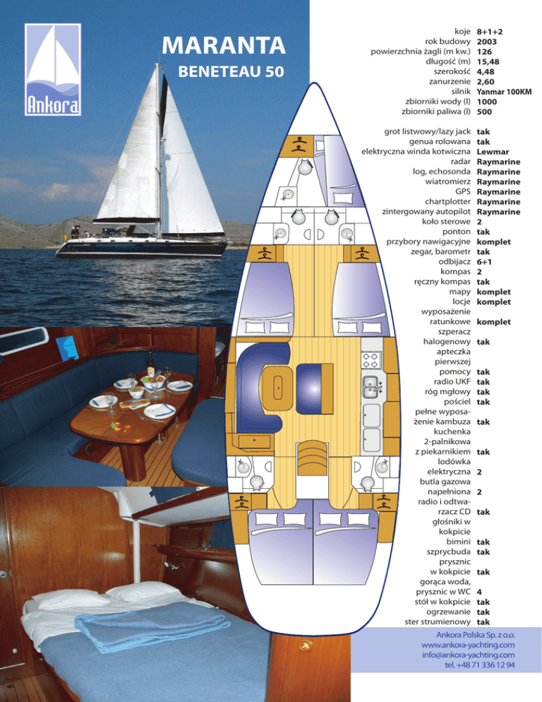 MARANTA BENETEAU 50 koje rok budowy powierzchnia żagli (m kw.) długość (m) szerokość zanurzenie silnik zbiorniki wody (l) zbiorniki paliwa (l) grot listwowy/lazy jack genua rolowana elektryczna winda kotwiczna radar log, echosonda wiatromierz GPS chartplotter zintergowany autopilot koło sterowe ponton przybory nawigacyjne zegar, barometr odbijacz kompas ręczny kompas mapy locje wyposażenie ratunkowe szperacz halogenowy apteczka pierwszej pomocy radio UKF róg mgłowy pościel pełne wyposażenie kambuza kuchenka 2-palnikowa z piekarnikiem lodówka elektryczna butla gazowa napełniona radio i odtwarzacz CD głośniki w kokpicie bimini szprycbuda prysznic w kokpicie gorąca woda, prysznic w WC stół w kokpicie ogrzewanie ster strumienowy 8+1+2 2003 126 15,48 4,48 2,60 Yanmar 100KM 1000 500 tak tak Lewmar Raymarine Raymarine Raymarine Raymarine Raymarine Raymarine 2 tak komplet tak 6+1 2 tak komplet komplet komplet tak tak tak tak tak tak tak 2 2 tak tak tak tak 4 tak tak tak Ankora Polska Sp. z o.o. www.ankora-yachting.com [email protected] tel. +48 71 336 12 94