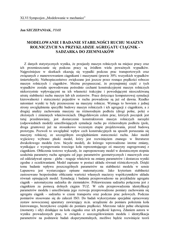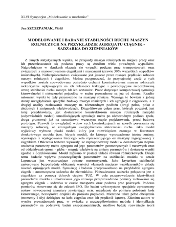 modelowanie i badanie stabilności ruchu maszyn rolniczych na