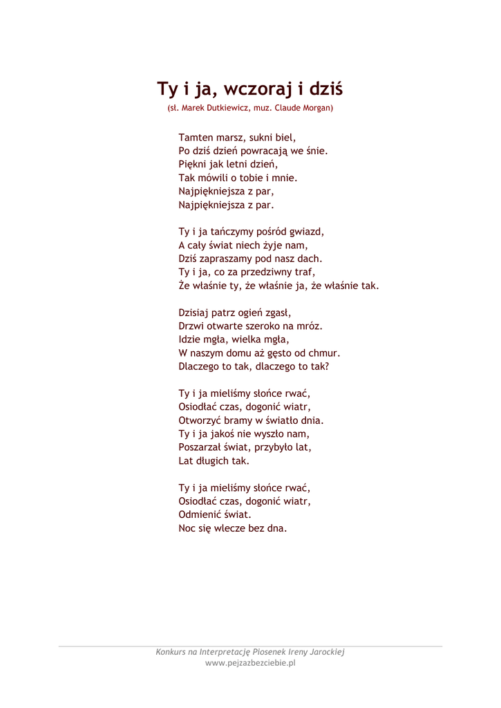 Ty i ja, wczoraj i dziś (sł. Marek Dutkiewicz, muz. Claude Morgan) Tamten marsz, sukni biel, Po dziś dzień powracają we śnie. Piękni jak letni dzień, Tak mówili o tobie i mnie. Najpiękniejsza z par, Najpiękniejsza z par. Ty i ja tańczymy pośród gwiazd, A cały świat niech żyje nam, Dziś zapraszamy pod nasz dach. Ty i ja, co za przedziwny traf, Że właśnie ty, że właśnie ja, że właśnie tak. Dzisiaj patrz ogień zgasł, Drzwi otwarte szeroko na mróz. Idzie mgła, wielka mgła, W naszym domu aż gęsto od chmur. Dlaczego to tak, dlaczego to tak? Ty i ja mieliśmy słońce rwać, Osiodłać czas, dogonić wiatr, Otworzyć bramy w światło dnia. Ty i ja jakoś nie wyszło nam, Poszarzał świat, przybyło lat, Lat długich tak. Ty i ja mieliśmy słońce rwać, Osiodłać czas, dogonić wiatr, Odmienić świat. Noc się wlecze bez dna. Konkurs na Interpretację Piosenek Ireny Jarockiej www.pejzazbezciebie.pl