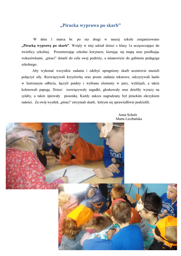 „Piracka wyprawa po skarb” W dniu 1 marca br. po raz drugi w naszej szkole zorganizowano „Piracką wyprawę po skarb”. Wzięły w niej udział dzieci z klasy 1a uczęszczające do świetlicy szkolnej. Przemierzając szkolne korytarze, kierując się mapą oraz posiłkując wskazówkami, „piraci” dotarli do celu swej podróży, a mianowicie do gabinetu pedagoga szkolnego. Aby wykonać wszystkie zadania i zdobyć upragniony skarb uczniowie musieli połączyć siły. Rozwiązywali krzyżówkę oraz proste zadania tekstowe, odczytywali hasło w lustrzanym odbiciu, łączyli punkty i wybrane elementy w pary, wyklejali, a także kolorowali papugę. Dzieci rozwiązywały zagadki, głoskowały oraz dzieliły wyrazy na sylaby, a także śpiewały piosenkę. Każdy sukces nagradzany był pirackim okrzykiem radości. Za swój wysiłek „piraci” otrzymali skarb, którym się sprawiedliwie podzielili. Anna Schulz Marta Liczbańska