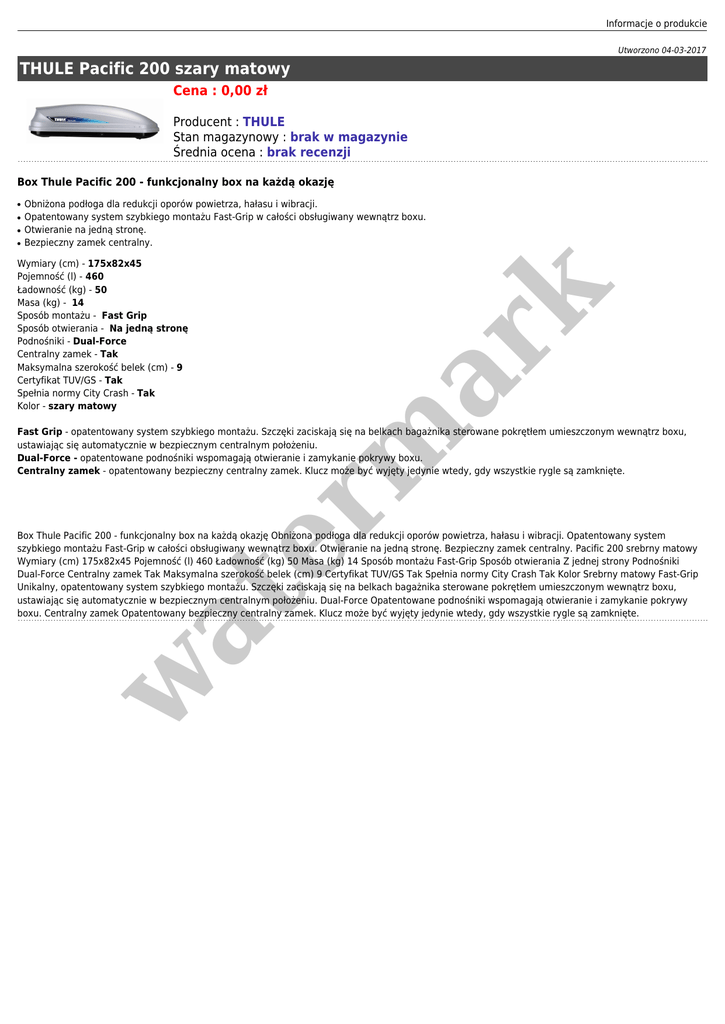 Informacje o produkcie Utworzono 04-03-2017 THULE Pacific 200 szary matowy Cena : 0,00 zł Producent : THULE Stan magazynowy : brak w magazynie Średnia ocena : brak recenzji Box Thule Pacific 200 - funkcjonalny box na każdą okazję ● ● ● Obniżona podłoga dla redukcji oporów powietrza, hałasu i wibracji. Opatentowany system szybkiego montażu Fast-Grip w całości obsługiwany wewnątrz boxu. Otwieranie na jedną stronę. Bezpieczny zamek centralny. Wymiary (cm) - 175x82x45 Pojemność (l) - 460 Ładowność (kg) - 50 Masa (kg) - 14 Sposób montażu - Fast Grip Sposób otwierania - Na jedną stronę Podnośniki - Dual-Force Centralny zamek - Tak Maksymalna szerokość belek (cm) - 9 Certyfikat TUV/GS - Tak Spełnia normy City Crash - Tak Kolor - szary matowy er m ar k ● Fast Grip - opatentowany system szybkiego montażu. Szczęki zaciskają się na belkach bagażnika sterowane pokrętłem umieszczonym wewnątrz boxu, ustawiając się automatycznie w bezpiecznym centralnym położeniu. Dual-Force - opatentowane podnośniki wspomagają otwieranie i zamykanie pokrywy boxu. Centralny zamek - opatentowany bezpieczny centralny zamek. Klucz może być wyjęty jedynie wtedy, gdy wszystkie rygle są zamknięte. w at Box Thule Pacific 200 - funkcjonalny box na każdą okazję Obniżona podłoga dla redukcji oporów powietrza, hałasu i wibracji. Opatentowany system szybkiego montażu Fast-Grip w całości obsługiwany wewnątrz boxu. Otwieranie na jedną stronę. Bezpieczny zamek centralny. Pacific 200 srebrny matowy Wymiary (cm) 175x82x45 Pojemność (l) 460 Ładowność (kg) 50 Masa (kg) 14 Sposób montażu Fast-Grip Sposób otwierania Z jednej strony Podnośniki Dual-Force Centralny zamek Tak Maksymalna szerokość belek (cm) 9 Certyfikat TUV/GS Tak Spełnia normy City Crash Tak Kolor Srebrny matowy Fast-Grip Unikalny, opatentowany system szybkiego montażu. Szczęki zaciskają się na belkach bagażnika sterowane pokrętłem umieszczonym wewnątrz boxu, ustawiając się automatycznie w bezpiecznym centralnym położeniu. Dual-Force Opatentowane podnośniki wspomagają otwieranie i zamykanie pokrywy boxu. Centralny zamek Opatentowany bezpieczny centralny zamek. Klucz może być wyjęty jedynie wtedy, gdy wszystkie rygle są zamknięte.