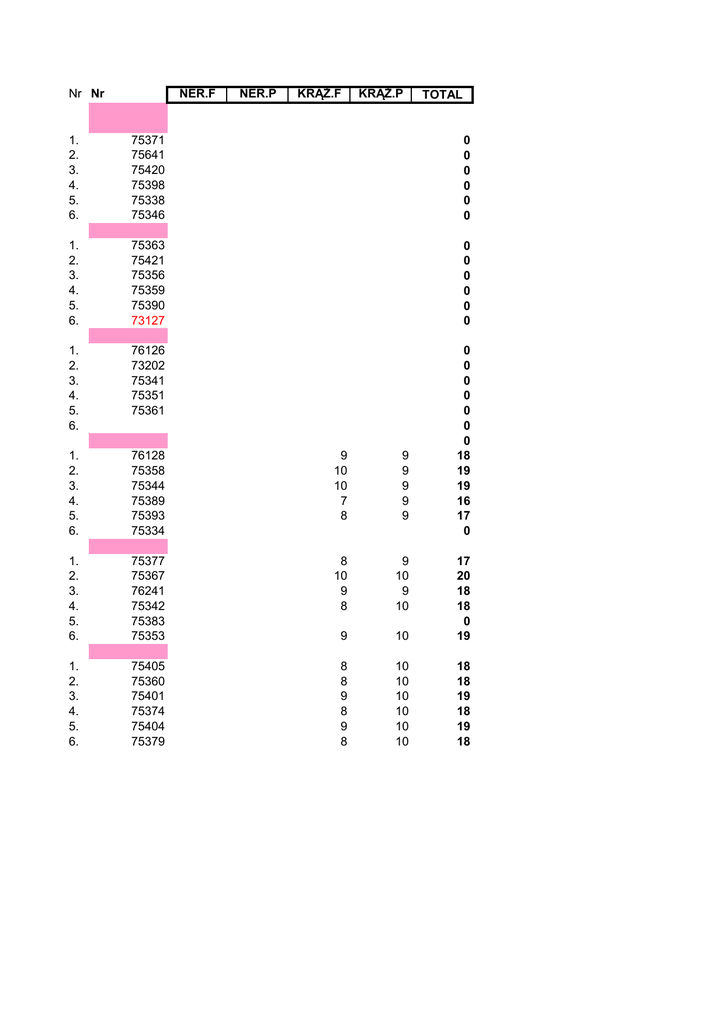 Nr Nr NER.F NER.P KRĄŻ.F KRĄŻ.P TOTAL 1. 2. 3. 4. 5. 6. 75371 75641 75420 75398 75338 75346 0 0 0 0 0 0 1. 2. 3. 4. 5. 6. 75363 75421 75356 75359 75390 73127 0 0 0 0 0 0 1. 2. 3. 4. 5. 6. 76126 73202 75341 75351 75361 1. 2. 3. 4. 5. 6. 76128 75358 75344 75389 75393 75334 9 10 10 7 8 9 9 9 9 9 0 0 0 0 0 0 0 18 19 19 16 17 0 1. 2. 3. 4. 5. 6. 75377 75367 76241 75342 75383 75353 8 10 9 8 9 10 9 10 9 10 17 20 18 18 0 19 1. 2. 3. 4. 5. 6. 75405 75360 75401 75374 75404 75379 8 8 9 8 9 8 10 10 10 10 10 10 18 18 19 18 19 18