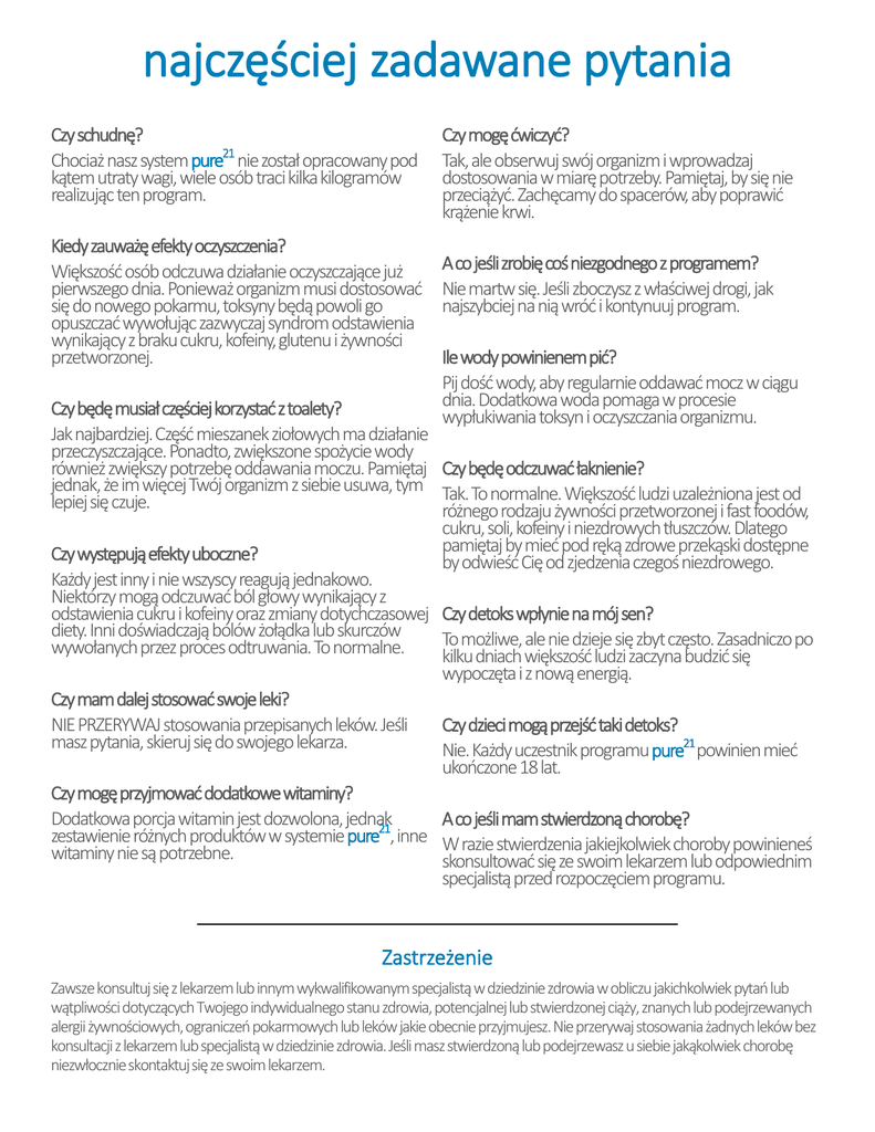 najczęściej zadawane pytania Czy schudnę? Chociaż nasz system pure21 nie został opracowany pod kątem utraty wagi, wiele osób traci kilka kilogramów realizując ten program. Kiedy zauważę efekty oczyszczenia? Większość osób odczuwa działanie oczyszczające już pierwszego dnia. Ponieważ organizm musi dostosować się do nowego pokarmu, toksyny będą powoli go opuszczać wywołując zazwyczaj syndrom odstawienia wynikający z braku cukru, kofeiny, glutenu i żywności przetworzonej. Czy mogę ćwiczyć? Tak, ale obserwuj swój organizm i wprowadzaj dostosowania w miarę potrzeby. Pamiętaj, by się nie przeciążyć. Zachęcamy do spacerów, aby poprawić krążenie krwi. A co jeśli zrobię coś niezgodnego z programem? Nie martw się. Jeśli zboczysz z właściwej drogi, jak najszybciej na nią wróć i kontynuuj program. Ile wody powinienem pić? Pij dość wody, aby regularnie oddawać mocz w ciągu dnia. Dodatkowa woda pomaga w procesie wypłukiwania toksyn i oczyszczania organizmu. Czy będę musiał częściej korzystać z toalety? Jak najbardziej. Część mieszanek ziołowych ma działanie przeczyszczające. Ponadto, zwiększone spożycie wody również zwiększy potrzebę oddawania moczu. Pamiętaj Czy będę odczuwać łaknienie? jednak, że im więcej Twój organizm z siebie usuwa, tym Tak. To normalne. Większość ludzi uzależniona jest od lepiej się czuje. różnego rodzaju żywności przetworzonej i fast foodów, cukru, soli, kofeiny i niezdrowych tłuszczów. Dlatego pamiętaj by mieć pod ręką zdrowe przekąski dostępne Czy występują efekty uboczne? by odwieść Cię od zjedzenia czegoś niezdrowego. Każdy jest inny i nie wszyscy reagują jednakowo. Niektórzy mogą odczuwać ból głowy wynikający z odstawienia cukru i kofeiny oraz zmiany dotychczasowej Czy detoks wpłynie na mój sen? diety. Inni doświadczają bólów żołądka lub skurczów To możliwe, ale nie dzieje się zbyt często. Zasadniczo po wywołanych przez proces odtruwania. To normalne. kilku dniach większość ludzi zaczyna budzić się wypoczęta i z nową energią. Czy mam dalej stosować swoje leki? NIE PRZERYWAJ stosowania przepisanych leków. Jeśli Czy dzieci mogą przejść taki detoks? masz pytania, skieruj się do swojego lekarza. Nie. Każdy uczestnik programu pure21 powinien mieć ukończone 18 lat. Czy mogę przyjmować dodatkowe witaminy? Dodatkowa porcja witamin jest dozwolona, jednak A co jeśli mam stwierdzoną chorobę? zestawienie różnych produktów w systemie pure21, inne W razie stwierdzenia jakiejkolwiek choroby powinieneś witaminy nie są potrzebne. skonsultować się ze swoim lekarzem lub odpowiednim specjalistą przed rozpoczęciem programu. Zastrzeżenie Zawsze konsultuj się z lekarzem lub innym wykwalifikowanym specjalistą w dziedzinie zdrowia w obliczu jakichkolwiek pytań lub wątpliwości dotyczących Twojego indywidualnego stanu zdrowia, potencjalnej lub stwierdzonej ciąży, znanych lub podejrzewanych alergii żywnościowych, ograniczeń pokarmowych lub leków jakie obecnie przyjmujesz. Nie przerywaj stosowania żadnych leków bez konsultacji z lekarzem lub specjalistą w dziedzinie zdrowia. Jeśli masz stwierdzoną lub podejrzewasz u siebie jakąkolwiek chorobę niezwłocznie skontaktuj się ze swoim lekarzem.