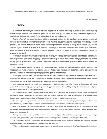 Tekst zaprezentowany w czasie Dni EPFCL „Pole Lacanowskie i Psychoanalityk” w dniach 22/23 listopada 2008 r. w Paryżu Guy Clastres Powroty Z powodów zdrowotnych ostatnie trzy lata spędziłem z daleka od sceny publicznej, ale dziś czuję się wystarczająco dobrze, aby dokonać powrotu; co nie znaczy, że udało mi się całkowicie wykaraskać, powiedzmy, że jestem w rękach Boga, który okazuje się być łaskawym. Termin „Powrót” jest nam terminem bliskim, ponieważ należy on do topologii freudowskiej, a ogólniej mówiąc do słownictwa psychoanalizy (niech sobie Państwo przypomną powrót wypartego, nieustający powrót popędu, ale przede wszystkim niech sobie Państwo przypomną zasadę, o jakiej mówił Lacan: „to, co nie zostało usymbolizowane, powraca w realnym”. Spróbuję przedstawić Państwu świadectwo tych Powrotów, które zapisałem w liczbie mnogiej, ponieważ doświadczyłem ich wiele, o różnych strukturach, przez co wypada je rozróżnić. Pierwszym z nich był wymuszony powrót do medycyny, którą przerwałem ponad czterdzieści lat temu, w celu rozpoczęcia odmiennej przygody – psychoanalitycznej. W moim życiu wybór medycyny okazał się równie ważny, jak jej porzucenie. Jako synowi i wnukowi dawnych niewolników, już od małego bliscy wpajali mi autorytet mistrza. Nie wyobrażają sobie Państwo, co oznaczała pod koniec lat czterdziestych figura lekarza, dla mieszkańców małej mieściny w dolinie Ariège (Ariège jest francuskim departamentem, położonym na południu Francji, w Pirenejach i przylegającym do granicy z Hiszpanią). W tamtych czasach lekarz imponował bardziej, niż sam proboszcz: wypowiedzią, znajomością sakralności, śmierci – był wyrocznią. Szybko zdałem sobie sprawę z miejsca, jakie zajmowała ta figura w matczynej histerii i które stało się oczywiście nieświadomym oparciem mojego powołania. Mój niedawny powrót do medycyny odczuwam i doświadczam nie jako lekarz praktykujący, ale jako pacjent, to znaczy znajduję się w polu przeciwległym do ideału, ideału, który dziś już nie istnieje, zresztą tak samo jak mieścina, w której się urodziłem. To, co przyczyniło się do mojego powrotu do medycyny, związane jest z zaprzeczeniem, które, jak to nam tłumaczył Lacan pochodzi z realnego. Istotnie, realne pojawia się, aby przezwyciężyć wyobrażeniowe (przechodzi nad tym, co zostaje pod spodem, tak, jak to jest w węźle boromejskim). To, co nazywam wyobrażeniowym może pozwolić nam uważać, że terapia psychoanalityczna chroni nas przed chorobą. Jest to częste i bardzo rozpowszechnione przekonanie, nie tylko u obsesyjnych. Jest to w pewnym stopniu fantazmat psychoanalizy, polegająca na wyobrażeniu sobie psychoanalizy, czy też terapii psychoanalitycznej, jako ubezpieczenia na życie. Jest to oczywiście urojone i realne pojawia się, żeby temu zaprzeczyć. To zaprzeczenie, które wywołało kontrowersje w moim byciu jako podmiotu, wypłynęło ze słów pewnego lekarza, który przyznał się do swojej bezsilności lekarskiej wobec problemu, jaki mu przedstawiłem. Lęk który się pojawił, napierając na moje wyobrażeniowe mury obronne, wpłynął na zmianę mojego dyskursu: stałem się przedmiotem, myślałem, że już nie żyję. Wobec mojego pesymistycznego sceptycyzmu, lekarze, będący zaciekłymi obrońcami życia, chcieli, abym spotkał się z pewną panią psycholog, która pracowała na oddziale, na którym byłem leczony. W naszych czasach zestawienie „lekarz psycholog”, jakie nie istniało kiedy ja skończyłem studia, wprowadza w sposób instytucjonalny kartezjańską dwoistość duszy i ciała. Do psychologów należy leczenie chorób związanych z uczuciami, uniesieniami duszy, a do lekarzy leczenie ciała. Powrócimy do tego „ciała”. A zatem zgodziłem się na spotkanie z panią psycholog i wbrew własnej woli, jeśli mogę tak to ująć, zacząłem jej opowiadać o mojej analizie, w ten sam sposób, w jaki się to robi podczas procedury przejścia. Zaznaczam, że moja terapia odbyła się dość dawno, ale pozostawiła po sobie kilka znaczących śladów. Oczywiście to nie było ani odpowiednie miejsce, ani moment, ani to, czego się spodziewano. Okazało się, że było to całkowite nieporozumienie. Jakby na to nie patrzeć, już od chwili, kiedy otwieramy usta, nie udaje się nam uniknąć nieporozumień, zwłaszcza pomiędzy analitykami. Tym niemniej, już po fakcie zadałem sobie pytanie: dlaczego do diabła w takich warunkach mówiłem jej o mojej terapii? W przypływie lęku, kiedy to zostałem sprowadzony do pozycji przedmiotu, poddany dobrej woli innego lub jego klątwie, spróbowałem odbudować łańcuch znaczących, powstały wcześniej, podczas mojej poprzedniej terapii, aby odnaleźć bycie i ponownie ustanowić kontynuację, oczywiście pseudo-kontynuację tego łańcucha, przerwanego poprzez pojawienie się uczucia lęku. Ten powrót realności, powrót do dyskursu medycznego w pewnym sensie mnie zgubił, całkowicie mnie zgubił. Niech Państwo mnie dobrze zrozumieją. Nie mam żadnych pretensji do tej pani psycholog, robiła to, co do niej należało: dodawała nadziei tym, którzy już jej nie mieli. „Wzmacniała siły życiowe duszy”1. W tym miejscu muszę zaznaczyć, że obecność psychologów na oddziałach onkologicznych jest powodowana odkryciem dokonanym przez lekarzy, że pacjent będący w depresji reaguje na leczenie gorzej od innych. Jest to odkrycie statystycznie potwierdzone. Ale ja właściwie nie byłem w depresji, byłem pełen lęku, a to nie jest to samo. Powracając do pani psycholog, po tym nieudanym spotkaniu, zaproponowała mi drugie, na którym: „mieliśmy porozmawiać o nadziei”. Przypuszczam, że mój dyskurs doprowadził ją do rozpaczy, ale prawdę mówiąc nie wiem. W każdym razie, grzecznie jej podziękowałem za zaproszenie i poprzestaliśmy na tym etapie. Opowiadam to komiczne zdarzenie wył