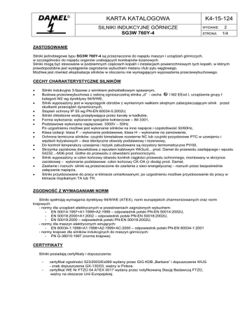 KARTA KATALOGOWA SILNIKI INDUKCYJNE GÓRNICZE SG3W 760Y-4 K4-15-124 WYDANIE 2 STRONA 1/4 ZASTOSOWANIE Silniki jednobiegowe typu SG3W 760Y-4 są przeznaczone do napędu maszyn i urządzeń górniczych, w szczególności do napędu organów urabiających kombajnów ścianowych. Silniki mogą być stosowane w podziemnych częściach kopalń i instalacjach powierzchniowych tych kopalń, w których prawdopodobne jest wystąpienie zagrożenia wybuchem metanu i/lub pyłu węglowego. Możliwa jest również eksploatacja silników w otoczeniu nie wymagającym wyposażenia przeciwwybuchowego. CECHY CHARAKTERYSTYCZNE SILNIKÓW • • • • • • • • • • • • • • Silniki indukcyjne 3-fazowe z wirnikiem jednoklatkowym spawanym, I M2 EExd I, urządzenie grupy I Budowa przeciwwybuchowa z osłoną ognioszczelną silnika „d” - cecha kategorii M2 wg dyrektywy 94/9/WE, Silnik wyposażony jest w wysprzęgnik obrotów z wymiennym wałkiem skrętnym zabezpieczającym silnik przed skutkami przeciążeń dynamicznych, Stopień ochrony IP 55 wg PN-EN 60034-5:2002U, Silniki chłodzone wodą przepływająca przez kanały w kadłubie, Forma wykonania: wykonanie specjalne kołnierzowe – IM 3301, Podstawowe wykonania napięciowe: 3300V – 50Hz Po uzgodnieniu możliwe jest wykonanie silników na inne napięcie i częstotliwość 50/60Hz, Klasa izolacji: klasa F – wykonanie podstawowe, klasa H – wykonanie na zamówienie, Ochrona termiczna silników: czujniki bimetalowe rozwierne NC lub czujniki pozystorowe PTC w uzwojeniu i węzłach łożyskowych – dwa identyczne obwody podstawowy i rezerwowy, Do kontroli temperatury uzwojenia i łożysk zabudowane są rezystory termometryczne Pt100, Skrzynka zaciskowa dwuwlotowa z wpustem kablowym Wk3u/d... prod. Damel do przewodu zasilającego i wpustu 54232...-M36 prod. Gothe do przewodu z obwodami pomocniczymi, Silnik wyposażony w człon końcowy obwodu kontroli ciągłości przewodu ochronnego, montowany w skrzynce zaciskowej – wykonanie podstawowe: człon końcowy CK-OA (z diodą) prod. Damel, Zasilanie i rozruch: silniki są przeznaczone do zasilania z sieci energetycznej – rozruch przez bezpośrednie załączenie napięcia, Silniki przystosowane do pracy w klimacie umiarkowanym; po uzgodnieniu możliwe przystosowanie do pracy w klimacie tropikalnym TA lub TH. ZGODNOŚĆ Z WYMAGANIAMI NORM Silniki spełniają wymagania dyrektywy 94/9/WE (ATEX), norm europejskich zharmonizowanych oraz norm krajowych: - normy dla urządzeń elektrycznych w przestrzeniach zagrożonych wybuchem: - EN 50014:1997+A1:1999+A2:1999 – odpowiednik polski PN-EN 50014:2002U, - EN 50018:2000+A1:2002 – odpowiednik polski PN-EN 50018:2002U, - EN 50019:2000 – odpowiednik polski PN-EN 50019:2002U, - normy dla maszyn elektrycznych wirujących: - EN 60034-1:1998+A1:1998+A2:1999+AC:2000 – odpowiednik polski PN-EN 60034-1:2001 - normy krajowe dla silników indukcyjnych do maszyn górniczych: - PN G-38010:1997 (norma krajowa). CERTYFIKATY Silniki posiadają certyfikaty i dopuszczenia: - certyfikat zgodności 523/2003/Ex069 wydany przez GIG KDB „Barbara” i dopuszczenie WUG - znak dopuszczenia GX-130/03, ważny w Polsce. certyfikat WE Nr FTZÚ 04 ATEX 0017 wydany przez notyfikowaną Stację Badawczą FTZÚ, ważny na obszarze Unii Europejskiej. KARTA KATALOGOWA K4-15-124 SILNIKI INDUKCYJNE GÓRNICZE SG3W 760Y-4 WYDANIE 2 STRONA 2/4 DANE TECHNICZNE Parametry Moc znamionowa PN Napięcie znamionowe UN Prąd przy napięciu znamionowym IN Współczynnik mocy cosφ Sprawność η Prędkość obrotowa n Moment znamionowy MN Krotność prądu rozruchowego IK/IN Krotność momentu rozruchowego MK/MN Krotność momentu krytycznego Mmax/MN Min. Przepływ wody chłodzącej Rodzaj pracy Moment bezwładności wirnika JM Masa silnika 1. 2. 3. [kW] [V] [A] [%] [obr/min] [Nm] [dm3/min] kgm2 kg Tabela 1 SG3W 760Y-4 500 3300 105 0,87 95,8 1482 3222 7,3 2,2 2,8 20 S1; S4-60%, 40c/h Jext/JM=1 9,0 2200 Parametry silnika: prąd znamionowy, sprawność, współczynnik mocy, prędkość obrotowa i moment znamionowy odnoszą się do obciążenia znamionowego przy znamionowych warunkach zasilania – 50Hz. Krotności prądu rozruchowego, momentu rozruchowego i momentu krytycznego odnoszą się do bezpośredniego włączenia silnika do sieci zasilającej. Jext – moment bezwładności obciążenia silnika sprowadzony do osi wału Rys.1 Schemat połączeń silnika Rys.2 Schemat układu chłodzenia KARTA KATALOGOWA SILNIKI INDUKCYJNE GÓRNICZE SG3W 760Y-4 K4-15-124 WYDANIE 2 STRONA 3/4 Rys.3 Wymiary montażowe i gabarytowe WARUNKI ZASTOSOWANIA I EKSPLOATACJI • • • • • • • • • Temperatura otoczenia 0÷40oC o 97÷100% Wilgotność względna w temperaturze 35 C Wysokość nad poziomem morza ≤ 1000m Stopień agresywności korozyjnej C wg PN-71/H-04651 o Dopuszczalne nachylenie osi wału do poziomu ≤ 30 Parametry wody chłodzonej na wlocie układu chłodzenia o - temperatura maksymalna 30 C - maksymalne ciśnienie statyczne 3MPa Napięcie zasilania (0,95÷1,05)UN Przyłącze elektryczne Podłączenie zasilania – przewód oponowy górniczy o izolacji i oponie gumowej, wielożyłowy, ekranowany na napięcie 1,9/3,3kV, o przekroju żył dobranym do warunków eksploatacji. Podłączenie obwodów pomocniczyh czujników temperatury – żyły pomocnicze przewodu zasilającego lub przewodu sterowniczego o przekroju żył do 4mm2. Wprowadzenie przewodów oponowych do skrzynki zaciskowej przez wpusty kablowe dobrane do ich średnicy zewnętrznej wg tabeli 2. KARTA KATALOGOWA K4-15-124 SILNIKI INDUKCYJNE GÓRNICZE SG3W 760Y-4 WYDANIE 2 STRONA 4/4 Tabela 2 Typ wpustu Wk3u/d80... Wk3u/d100... 54232...M-36 40 ÷ 44 18 ÷ 21 Zakres średnic przewodów dla wpustów kablowych 41 ÷ 46 44÷49 48 ÷ 53 52-57 52-57 55-61 60-65 62-68 20 ÷ 24 22 ÷ 26 25 ÷ 28 68-74 W przypadku nie określenia przez zamawiającego typu wpustu kablowego z podaniem średnicy zewnętrznej przewodu, silnik jest dostarcz
