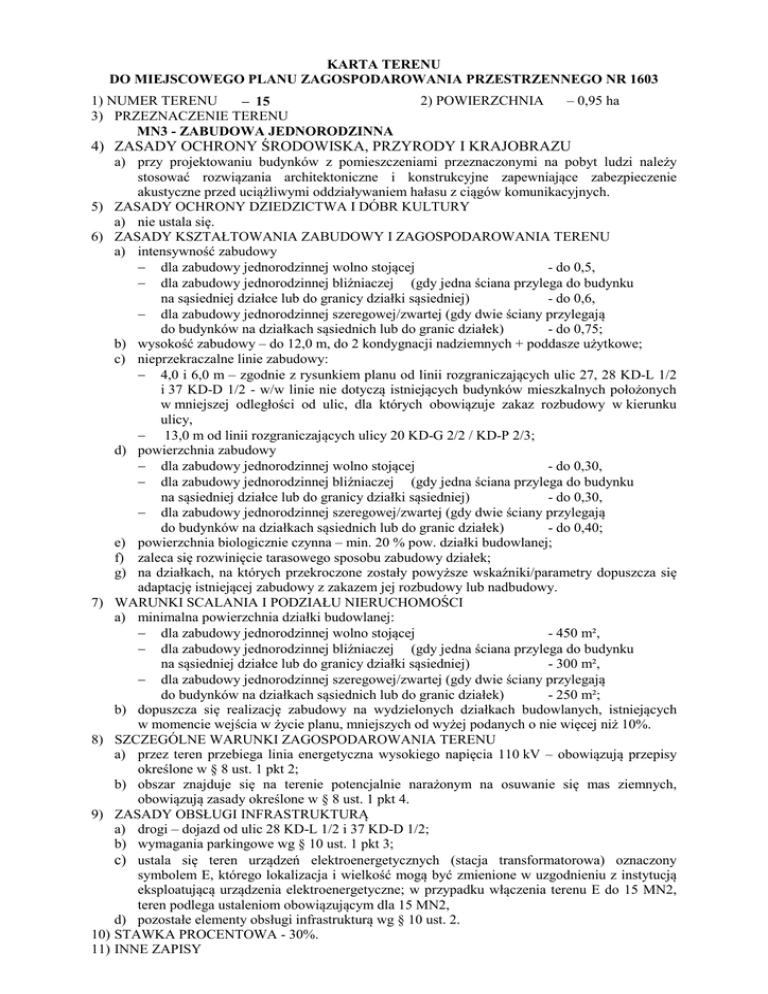 KARTA TERENU DO MIEJSCOWEGO PLANU ZAGOSPODAROWANIA PRZESTRZENNEGO NR 1603 1) NUMER TERENU – 15 3) PRZEZNACZENIE TERENU MN3 - ZABUDOWA JEDNORODZINNA 2) POWIERZCHNIA – 0,95 ha 4) ZASADY OCHRONY ŚRODOWISKA, PRZYRODY I KRAJOBRAZU a) przy projektowaniu budynków z pomieszczeniami przeznaczonymi na pobyt ludzi należy stosować rozwiązania architektoniczne i konstrukcyjne zapewniające zabezpieczenie akustyczne przed uciążliwymi oddziaływaniem hałasu z ciągów komunikacyjnych. 5) ZASADY OCHRONY DZIEDZICTWA I DÓBR KULTURY a) nie ustala się. 6) ZASADY KSZTAŁTOWANIA ZABUDOWY I ZAGOSPODAROWANIA TERENU a) intensywność zabudowy − dla zabudowy jednorodzinnej wolno stojącej - do 0,5, − dla zabudowy jednorodzinnej bliźniaczej (gdy jedna ściana przylega do budynku na sąsiedniej działce lub do granicy działki sąsiedniej) - do 0,6, − dla zabudowy jednorodzinnej szeregowej/zwartej (gdy dwie ściany przylegają do budynków na działkach sąsiednich lub do granic działek) - do 0,75; b) wysokość zabudowy – do 12,0 m, do 2 kondygnacji nadziemnych + poddasze użytkowe; c) nieprzekraczalne linie zabudowy: − 4,0 i 6,0 m – zgodnie z rysunkiem planu od linii rozgraniczających ulic 27, 28 KD-L 1/2 i 37 KD-D 1/2 - w/w linie nie dotyczą istniejących budynków mieszkalnych położonych w mniejszej odległości od ulic, dla których obowiązuje zakaz rozbudowy w kierunku ulicy, − 13,0 m od linii rozgraniczających ulicy 20 KD-G 2/2 / KD-P 2/3; d) powierzchnia zabudowy − dla zabudowy jednorodzinnej wolno stojącej - do 0,30, − dla zabudowy jednorodzinnej bliźniaczej (gdy jedna ściana przylega do budynku na sąsiedniej działce lub do granicy działki sąsiedniej) - do 0,30, − dla zabudowy jednorodzinnej szeregowej/zwartej (gdy dwie ściany przylegają do budynków na działkach sąsiednich lub do granic działek) - do 0,40; e) powierzchnia biologicznie czynna – min. 20 % pow. działki budowlanej; f) zaleca się rozwinięcie tarasowego sposobu zabudowy działek; g) na działkach, na których przekroczone zostały powyższe wskaźniki/parametry dopuszcza się adaptację istniejącej zabudowy z zakazem jej rozbudowy lub nadbudowy. 7) WARUNKI SCALANIA I PODZIAŁU NIERUCHOMOŚCI a) minimalna powierzchnia działki budowlanej: − dla zabudowy jednorodzinnej wolno stojącej - 450 m², − dla zabudowy jednorodzinnej bliźniaczej (gdy jedna ściana przylega do budynku na sąsiedniej działce lub do granicy działki sąsiedniej) - 300 m², − dla zabudowy jednorodzinnej szeregowej/zwartej (gdy dwie ściany przylegają do budynków na działkach sąsiednich lub do granic działek) - 250 m²; b) dopuszcza się realizację zabudowy na wydzielonych działkach budowlanych, istniejących w momencie wejścia w życie planu, mniejszych od wyżej podanych o nie więcej niż 10%. 8) SZCZEGÓLNE WARUNKI ZAGOSPODAROWANIA TERENU a) przez teren przebiega linia energetyczna wysokiego napięcia 110 kV – obowiązują przepisy określone w § 8 ust. 1 pkt 2; b) obszar znajduje się na terenie potencjalnie narażonym na osuwanie się mas ziemnych, obowiązują zasady określone w § 8 ust. 1 pkt 4. 9) ZASADY OBSŁUGI INFRASTRUKTURĄ a) drogi – dojazd od ulic 28 KD-L 1/2 i 37 KD-D 1/2; b) wymagania parkingowe wg § 10 ust. 1 pkt 3; c) ustala się teren urządzeń elektroenergetycznych (stacja transformatorowa) oznaczony symbolem E, którego lokalizacja i wielkość mogą być zmienione w uzgodnieniu z instytucją eksploatującą urządzenia elektroenergetyczne; w przypadku włączenia terenu E do 15 MN2, teren podlega ustaleniom obowiązującym dla 15 MN2, d) pozostałe elementy obsługi infrastrukturą wg § 10 ust. 2. 10) STAWKA PROCENTOWA - 30%. 11) INNE ZAPISY
