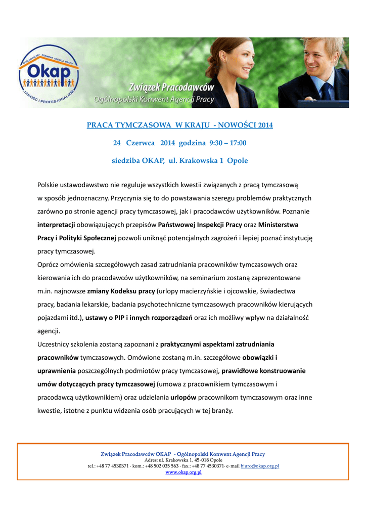 PRACA TYMCZASOWA W KRAJU - NOWOŚCI 2014 24 Czerwca 2014 godzina 9:30 – 17:00 siedziba OKAP, ul. Krakowska 1 Opole Polskie ustawodawstwo nie reguluje wszystkich kwestii związanych z pracą tymczasową w sposób jednoznaczny. Przyczynia się to do powstawania szeregu problemów praktycznych zarówno po stronie agencji pracy tymczasowej, jak i pracodawców użytkowników. Poznanie interpretacji obowiązujących przepisów Państwowej Inspekcji Pracy oraz Ministerstwa Pracy i Polityki Społecznej pozwoli uniknąć potencjalnych zagrożeń i lepiej poznać instytucję pracy tymczasowej. Oprócz omówienia szczegółowych zasad zatrudniania pracowników tymczasowych oraz kierowania ich do pracodawców użytkowników, na seminarium zostaną zaprezentowane m.in. najnowsze zmiany Kodeksu pracy (urlopy macierzyńskie i ojcowskie, świadectwa pracy, badania lekarskie, badania psychotechniczne tymczasowych pracowników kierujących pojazdami itd.), ustawy o PIP i innych rozporządzeń oraz ich możliwy wpływ na działalność agencji. Uczestnicy szkolenia zostaną zapoznani z praktycznymi aspektami zatrudniania pracowników tymczasowych. Omówione zostaną m.in. szczegółowe obowiązki i uprawnienia poszczególnych podmiotów pracy tymczasowej, prawidłowe konstruowanie umów dotyczących pracy tymczasowej (umowa z pracownikiem tymczasowym i pracodawcą użytkownikiem) oraz udzielania urlopów pracownikom tymczasowym oraz inne kwestie, istotne z punktu widzenia osób pracujących w tej branży. Związek Pracodawców OKAP - Ogólnopolski Konwent Agencji Pracy Adres: ul. Krakowska 1, 45-018 Opole tel.: +48 77 4530371 · kom.: +48 502 035 563 · fax.: +48 77 4530371· e-mail [email protected] www.okap.org.pl PRACA TYMCZASOWA W KRAJU - NOWOŚCI 2014 24 Czerwca 2014 godzina 9:30 – 17:00 siedziba OKAP, ul. Krakowska 1 Opole Program szkolenia: 1. Czy jest praca tymczasowa – zasady na jakich się opiera 2. NOWOŚĆ Zasady ustalania ukrytego stosunku pracy pracowników tymczasowych Nowe orzecznictwo SN dla pracy tymczasowej na zlecenie Sankcje dla agencji Co ze studentami na tymczasowym zleceniu? Interpretacje ZUS Czy powództwo w sądzie pracy dotknie także pracodawcę użytkownika? 3. NOWOŚĆ Nowe zasady badań dla kierujących pojazdami pracowników tymczasowych Ostatnie zmiany w prawie Czy nawet incydentalne używanie samochodu przez pracownika rodzi problemy? Czy ma znaczenie do kogo należy samochód, do pracownika czy też do firmy? Służba BHP a obowiązki agencji. 4. NOWOŚĆ Zmiany w Kodeksie pracy Nowe zasady kierowania na badania lekarskie pracowników tymczasowych Świadectwa pracy pracowników zwykłych 5. NOWOŚĆ Zmiany w zasadach kontroli Państwowej Inspekcji Pracy kontrole PIP obejmą nie tylko pracodawców nowe zasady kontroli podmiotów świadczących usługi pośrednictwa pracy, doradztwa personalnego, pracy tymczasowej nie tylko inspektorzy PIP uprawnieni do kontroli oprócz wystąpień inspektorskich pojawią się także polecenia inspektorskie nowe zasady karania pracodawców. Czym jest zasada „pierwszego razu”? Związek Pracodawców OKAP - Ogólnopolski Konwent Agencji Pracy Adres: ul. Krakowska 1, 45-018 Opole tel.: +48 77 4530371 · kom.: +48 502 035 563 · fax.: +48 77 4530371· e-mail [email protected] www.okap.org.pl PRACA TYMCZASOWA W KRAJU - NOWOŚCI 2014 24 Czerwca 2014 godzina 9:30 – 17:00 siedziba OKAP, ul. Krakowska 1 Opole 6. Okres skierowania pracownika tymczasowego 18 miesięcy pracy u jednego pracodawcy użytkownika Brak konieczności wystawiania wielu świadectw pracy. 7. Relacje pomiędzy agencją, a pracodawcą użytkownikiem: a. Obowiązki pracodawcy i agencji w firmach, w których działają związki zawodowe: kiedy należy informować związki o zatrudnieniu pracowników tymczasowych? w jakich przypadkach należy uzgodnić zatrudnienie pracowników tymczasowych ze związkiem? strajk u klienta a pracownicy tymczasowi, pracownik tymczasowy jako członek związku zawodowego b. Jak prawidłowo sporządzać umowy o kierowanie pracowników tymczasowych do klienta? Właściwy podział obowiązków pomiędzy agencją, a pracodawcą użytkownikiem (np. w zakresie BHP, ewidencji czasu pracy, zakładowego funduszu świadczeń socjalnych, ochrony danych osobowych) w świetle ostatnich zmian prawa, Metody ograniczenia ryzyka agencji pracy tymczasowej Bezpieczne zasady rozliczeń z pracodawcami użytkownikami, c. Jak interpretować przepisy ograniczające w czasie korzystanie z pracy tymczasowej ? d. Jak ograniczyć odpowiedzialność agencji za szkody wyrządzone przez pracownika ? e. Obowiązki agencji dotyczące ochrony danych osobowych – zgłoszenia, pełnomocnictwa, (wytyczne Inspekcji Ochrony Danych Osobowych), f. akie obowiązki ma agencja w zakresie szkoleń BHP i badań lekarskich pracowników zleceniobiorców tymczasowych? g. Jak wydawać, prostować i doręczać pracownikom świadectwa pracy? Związek Pracodawców OKAP - Ogólnopolski Konwent Agencji Pracy Adres: ul. Krakowska 1, 45-018 Opole tel.: +48 77 4530371 · kom.: +48 502 035 563 · fax.: +48 77 4530371· e-mail [email protected] www.okap.org.pl PRACA TYMCZASOWA W KRAJU - NOWOŚCI 2014 24 Czerwca 2014 godzina 9:30 – 17:00 siedziba OKAP, ul. Krakowska 1 Opole 8. Relacje pomiędzy agencją a pracownikiem tymczasowym: Jak sporządzić dobrą umowę z pracownikiem tymczasowym? Sposoby wcześniejszego rozwiązania umowy o pracę Zasady stosowania umów cywilnoprawnych, Zasady wypłacania wynagrodzenia pracownikowi odesłanemu przez pracodawcę użytkownika do agencji, Jak liczyć okres zatrudnienia pracownika tymczasowego u jednego pracodawcy użytkownika ? Wykładowca: dr Maciej Chakowski jest prawnikiem, absolwentem Wydziału Prawa i Administracji Uniwersytetu Warszawskiego. Obecnie jest adiunktem i wykładowcą prawa pracy na Wydziale Zarządzania Uniwersytetu Warszawskiego i Akademii Leona Koźmińskiego. Jest wspólnikiem zarządzającym w firmie doradczej C&C Chakowski & Ciszek specj
