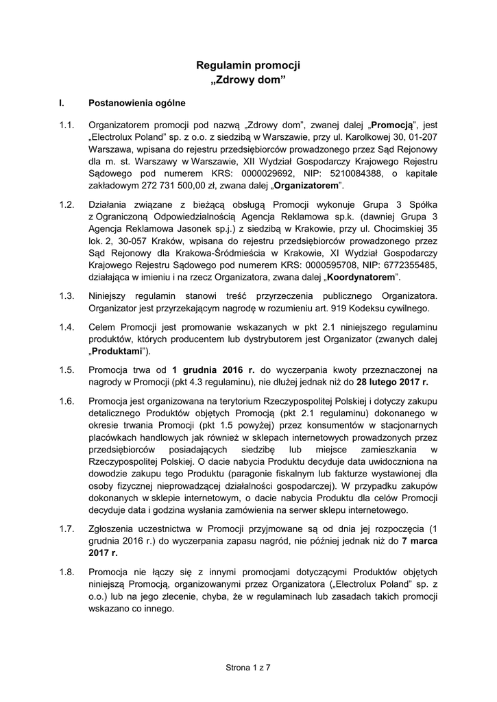 Regulamin promocji „Zdrowy dom” I. Postanowienia ogólne 1.1. Organizatorem promocji pod nazwą „Zdrowy dom”, zwanej dalej „Promocją”, jest „Electrolux Poland” sp. z o.o. z siedzibą w Warszawie, przy ul. Karolkowej 30, 01-207 Warszawa, wpisana do rejestru przedsiębiorców prowadzonego przez Sąd Rejonowy dla m. st. Warszawy w Warszawie, XII Wydział Gospodarczy Krajowego Rejestru Sądowego pod numerem KRS: 0000029692, NIP: 5210084388, o kapitale zakładowym 272 731 500,00 zł, zwana dalej „Organizatorem”. 1.2. Działania związane z bieżącą obsługą Promocji wykonuje Grupa 3 Spółka z Ograniczoną Odpowiedzialnością Agencja Reklamowa sp.k. (dawniej Grupa 3 Agencja Reklamowa Jasonek sp.j.) z siedzibą w Krakowie, przy ul. Chocimskiej 35 lok. 2, 30-057 Kraków, wpisana do rejestru przedsiębiorców prowadzonego przez Sąd Rejonowy dla Krakowa-Śródmieścia w Krakowie, XI Wydział Gospodarczy Krajowego Rejestru Sądowego pod numerem KRS: 0000595708, NIP: 6772355485, działająca w imieniu i na rzecz Organizatora, zwana dalej „Koordynatorem”. 1.3. Niniejszy regulamin stanowi treść przyrzeczenia publicznego Organizatora. Organizator jest przyrzekającym nagrodę w rozumieniu art. 919 Kodeksu cywilnego. 1.4. Celem Promocji jest promowanie wskazanych w pkt 2.1 niniejszego regulaminu produktów, których producentem lub dystrybutorem jest Organizator (zwanych dalej „Produktami”). 1.5. Promocja trwa od 1 grudnia 2016 r. do wyczerpania kwoty przeznaczonej na nagrody w Promocji (pkt 4.3 regulaminu), nie dłużej jednak niż do 28 lutego 2017 r. 1.6. Promocja jest organizowana na terytorium Rzeczypospolitej Polskiej i dotyczy zakupu detalicznego Produktów objętych Promocją (pkt 2.1 regulaminu) dokonanego w okresie trwania Promocji (pkt 1.5 powyżej) przez konsumentów w stacjonarnych placówkach handlowych jak również w sklepach internetowych prowadzonych przez przedsiębiorców posiadających siedzibę lub miejsce zamieszkania w Rzeczypospolitej Polskiej. O dacie nabycia Produktu decyduje data uwidoczniona na dowodzie zakupu tego Produktu (paragonie fiskalnym lub fakturze wystawionej dla osoby fizycznej nieprowadzącej działalności gospodarczej). W przypadku zakupów dokonanych w sklepie internetowym, o dacie nabycia Produktu dla celów Promocji decyduje data i godzina wysłania zamówienia na serwer sklepu internetowego. 1.7. Zgłoszenia uczestnictwa w Promocji przyjmowane są od dnia jej rozpoczęcia (1 grudnia 2016 r.) do wyczerpania zapasu nagród, nie później jednak niż do 7 marca 2017 r. 1.8. Promocja nie łączy się z innymi promocjami dotyczącymi Produktów objętych niniejszą Promocją, organizowanymi przez Organizatora („Electrolux Poland” sp. z o.o.) lub na jego zlecenie, chyba, że w regulaminach lub zasadach takich promocji wskazano co innego. Strona 1 z 7 II. Warunki uczestnictwa w Promocji 2.1. Promocją objęty jest jednorazowy zakup następującego zestawu Produktów – urządzeń marki „Electrolux”: oczyszczacza powietrza EAP450+ oraz jednego z następujących odkurzaczy: USDELUX58, USALLFL58, USANIMA58, USALLER58, USGREEN58.USALLFL58, USANIMA58, USDELUX58 lub USALLER58 lub (według wyboru Uczestnika) b) oczyszczacza powietrza EAP300+ oraz jednego z następujących odkurzaczy: USDELUX58, USALLFL58, USANIMA58, USGREEN58, USALLER58, USGREEN58.. a) 2.2. Promocja jest przeznaczona dla osób fizycznych, które spełniają wszystkie poniższe warunki (dalej „Uczestnicy”): a) b) c) d) e) posiadają miejsce stałego zamieszkania na terytorium Rzeczypospolitej Polskiej; ukończyły 18 rok życia i posiadają pełną zdolność do czynności prawnych; w okresie trwania Promocji (pkt 1.5 powyżej) zakupiły Produkty, o których mowa w pkt 2.1 lit. a lub b, jako konsument w rozumieniu art. 221 Kodeksu cywilnego; zachowały oryginał dowodu zakupu Produktów (paragon fiskalny lub faktura wystawiona dla osoby fizycznej nieprowadzącej działalności gospodarczej); w okresie, o którym mowa w pkt 1.7 powyżej, dokonały zgłoszenia do Promocji Produktów wymienionych w pkt 2.1 lit. a lub b powyżej, zakupionych przez siebie w czasie trwania Promocji (pkt 1.5 powyżej). Zgłoszenie do Promocji dokonywane jest zgodnie z postanowieniami pkt 3.1 i nast. regulaminu. 2.3. Zakup Produktów wchodzących w skład zestawu, o którym mowa w pkt 2.1 lit. a lub b powyżej (to jest oczyszczacza powietrza objętego Promocją oraz odpowiedniego odkurzacza) musi być jednorazowy, to jest dokonany w jednym czasie w jednym punkcie sprzedaży i udokumentowany na jednym dowodzie zakupu (paragonie fiskalnym albo fakturze wystawionej dla osoby fizycznej nieprowadzącej działalności gospodarczej). 2.4. W Promocji nie mogą uczestniczyć właściciele (współwłaściciele), wspólnicy lub osoby zatrudnione na jakiejkolwiek podstawie prawnej (na podstawie umowy o pracę, umowy cywilnoprawnej, etc.) w punktach sprzedaży detalicznej lub hurtowej, prowadzących sprzedaż produktów Organizatora, w przedsiębiorstwie Organizatora lub Koordynatora oraz członkowie najbliższej rodziny takich osób. 2.5. Przez członków najbliższej rodziny, o których mowa w pkt 2.4 powyżej, rozumie się: wstępnych, zstępnych, rodzeństwo, małżonków, małżonków rodzeństwa, rodziców małżonków i osoby pozostające w stosunku przysposobienia. 2.6. Promocja jest skierowana wyłącznie do osób nabywających Produkty jako konsument. Oznacza to w szczególności, że Promocja nie jest przeznaczona dla osób lub podmiotów nabywających Produkty jako przedsiębiorca. 2.7. Udział w Promocji i podanie związanych z tym danych jest całkowicie dobrowolne. 2.8. Z Promocji można skorzystać tylko jeden raz, co oznacza, że jeden Uczestnik może otrzymać tylko jedną nagrodę w Promocji, zaś zgłoszenie do Promocji może Strona 2 z 7 obejmować tylko jeden zestaw Produktów objętych Promocją zgodnie z pkt 2.1 powyżej. III. Zgłoszenie uczestnictwa w Promocji 3.1. Z