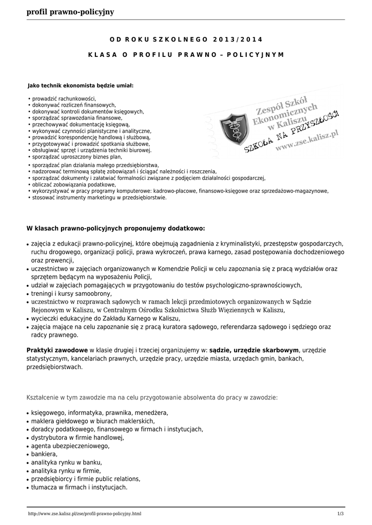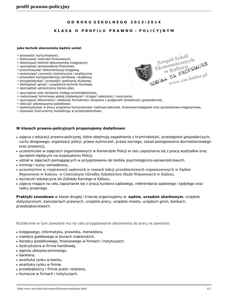 profil prawno-policyjny OD ROKU SZKOLNEGO 2013/2014 KLASA O PROFILU PRAWNO – POLICYJNYM Jako technik ekonomista będzie umiał: • prowadzić rachunkowości, • dokonywać rozliczeń finansowych, • dokonywać kontroli dokumentów księgowych, • sporządzać sprawozdania finansowe, • przechowywać dokumentację księgową, • wykonywać czynności planistyczne i analityczne, • prowadzić korespondencję handlową i służbową, • przygotowywać i prowadzić spotkania służbowe, • obsługiwać sprzęt i urządzenia techniki biurowej. • sporządzać uproszczony biznes plan, • sporządzać plan działania małego przedsiębiorstwa, • nadzorować terminową spłatę zobowiązań i ściągać należności i roszczenia, • sporządzać dokumenty i załatwiać formalności związane z podjęciem działalności gospodarczej, • obliczać zobowiązania podatkowe, • wykorzystywać w pracy programy komputerowe: kadrowo-płacowe, finansowo-księgowe oraz sprzedażowo-magazynowe, • stosować instrumenty marketingu w przedsiębiorstwie. W klasach prawno-policyjnych proponujemy dodatkowo: ● ● ● ● ● ● ● zajęcia z edukacji prawno-policyjnej, które obejmują zagadnienia z kryminalistyki, przestępstw gospodarczych, ruchu drogowego, organizacji policji, prawa wykroczeń, prawa karnego, zasad postępowania dochodzeniowego oraz prewencji, uczestnictwo w zajęciach organizowanych w Komendzie Policji w celu zapoznania się z pracą wydziałów oraz sprzętem będącym na wyposażeniu Policji, udział w zajęciach pomagających w przygotowaniu do testów psychologiczno-sprawnościowych, treningi i kursy samoobrony, uczestnictwo w rozprawach sądowych w ramach lekcji przedmiotowych organizowanych w Sądzie Rejonowym w Kaliszu, w Centralnym Ośrodku Szkolnictwa Służb Więziennych w Kaliszu, wycieczki edukacyjne do Zakładu Karnego w Kaliszu, zajęcia mające na celu zapoznanie się z pracą kuratora sądowego, referendarza sądowego i sędziego oraz radcy prawnego. Praktyki zawodowe w klasie drugiej i trzeciej organizujemy w: sądzie, urzędzie skarbowym, urzędzie statystycznym, kancelariach prawnych, urzędzie pracy, urzędzie miasta, urzędach gmin, bankach, przedsiębiorstwach. Kształcenie w tym zawodzie ma na celu przygotowanie absolwenta do pracy w zawodzie: ● ● ● ● ● ● ● ● ● ● księgowego, informatyka, prawnika, menedżera, maklera giełdowego w biurach maklerskich, doradcy podatkowego, finansowego w firmach i instytucjach, dystrybutora w firmie handlowej, agenta ubezpieczeniowego, bankiera, analityka rynku w banku, analityka rynku w firmie, przedsiębiorcy i firmie public relations, tłumacza w firmach i instytucjach. http://www.zse.kalisz.pl/zse/profil-prawno-policyjny.html 1/3 profil prawno-policyjny Perspektywy pracy? Bardzo szerokie! Absolwent może pracować w następujących działach przedsiębiorstwa: księgowym, kadrowo-płacowym, handlowym, marketingu, w dziale analiz, w sekretariacie. Nasi absolwenci pracują także w urzędach skarbowych, w Zakładzie Ubezpieczeń Społecznych. Wielu z nich zakłada własne firmy, prowadząc z powodzeniem działalność gospodarczą. Zawód przeznaczony jest dla osób: ● ● ● ● ● ● ● ● ● ● operatywnych w działaniu, uczciwych, sumiennych i zdyscyplinowanych, odpowiedzialnych i systematycznych w działaniu, komunikatywnych, posiadających umiejętność rozwiązywania problemów, posiadających umiejętności organizatorskie, stosujących się do zasad prawa, etyki i kultury zawodowej, uzdolnionych rachunkowo-matematycznie, gotowych do stałego podnoszenia swoich kwalifikacji. Do podjęcia nauki na tym kierunku zachęcamy wszystkich zainteresowanych kształceniem ekonomicznym. Nauka trwa 4 lata. W klasie drugiej i trzeciej uczniowie odbywają 3 – tygodniowe praktyki zawodowe w renomowanych jednostkach organizacyjnych. Absolwent otrzymuje świadectwo ukończenia szkoły. Może przystąpić do egzaminu maturalnego. Po zdaniu egzaminu maturalnego może kontynuować naukę na wyższej uczelni. Szkoła przygotowuje ucznia do zdawania egzaminu zawodowego kwalifikacjami - etapami. Nasza szkoła jest ośrodkiem egzaminacyjnym i organizuje egzaminy dla naszych absolwentów. Po zdaniu egzaminu z danej kwalifikacji, zdający otrzyma nowy dokument - świadectwo potwierdzające kwalifikację w zawodzie. Osoba, która zdobędzie świadectwa potwierdzające uzyskanie poniższych kwalifikacji A.35 i A.36 oraz ukończy szkołę, otrzyma dyplom potwierdzający kwalifikacje zawodowe w wyuczonym zawodzie oraz certyfikowane suplementy do dyplomu (Europass) w języku polskim i angielskim umożliwiające podjęcie pracy w zawodzie nawet za granicą. W zawodzie tym kształcimy w dwóch kwalifikacjach: A.35. Planowanie i prowadzenie działalności w organizacji A.36. Prowadzenie rachunkowości W zawodzie tym będą realizowane dwa przedmioty ogólnokształcące na poziomie rozszerzonym: 1. Język obcy - angielski 2. Do wyboru: geografia lub matematyka Rozszerzenia tych przedmiotów ułatwią Ci zdawanie ich na poziomie rozszerzonym na maturze oraz dostanie http://www.zse.kalisz.pl/zse/profil-prawno-policyjny.html 2/3 profil prawno-policyjny się na studia. Absolwent szkoły kształcącej w zawodzie technik ekonomista będzie przygotowany do wykonywania następujących zadań zawodowych: ● ● ● ● ● samodzielnego wykonywania lub współdziałania przy wykonywaniu czynności związanych z organizacją i przygotowywaniem procesów: zaopatrzenia, magazynowania, transportu, a przede wszystkim sprzedaży produktów (w tym usług) w różnych podmiotach gospodarczych, prowadzenie prac związanych z badaniem rynku, planowaniem i sprawozdawczością, polityką zatrudnienia, wynagrodzeniami, zaopatrzeniem i gospodarką materiałową, sprzedażą produktów, prowadzenia księgowości podmiotów gospodarczych, wykonywanie typowych prac biurowych. http://www.zse.kalisz.pl/zse/profil-prawno-policyjny.htm