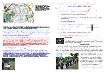 STARTUJ NA MIARĘ SWOICH UMIEJĘTNOŚCI I MOŻLIWOŚCI A NIE AMBICJI MAPA DO RADIOORIENTACJI Z WYRYSOWANYM PRZEBIEGIEM I NANIESIONYMI PUNKTAMI / LISAMI/ ORAZ ODLEGŁOŚCIAMI I CZASEM BIEGU CZŁONKA KADRY NARODOWEJ P. JANIAKA Trasa biegu, jej długość oraz skala trudności zależą od kategorii wiekowej i poziomu zaawansowania technicznego zawodników, dla których została zaprojektowana. W praktyce liczy ona w linii prostej około 3 km dla 11-to tatków, 12-16 km dla seniorów (w zależności od rodzaju terenu). ARENĄ JEST LAS Bieganie na radioorientację daje możliwość ruchu na świeżym powietrzu w naturalnym środowisku w otoczeniu przyrody, wpływającej korzystnie na samopoczucie duchowe i fizyczne, co niesie szczególne walory zdrowotne. Ponadto ruch ten wzbogacony jest elementami rywalizacji i współzawodnictwa, co przynosi odprężenie i satysfakcję z wysiłku. Emocje i przeżycia sportowe wzbogacają doznania estetyczne wywołane urokiem przyrody. Różnorodność terenów, niepowtarzalność tras w kolejnych zawodach chroni uczestników od jakiejkolwiek monotonii. Każde zawody to podróż w nieznane to spotkanie z przyrodą, to możliwość radzenia sobie w nowych sytuacjach. JEST TO SPORT DLA LUDZI INTELIGENTNYCH I SPRAWNYCH Bieganie na radioorientację to możliwość aktywności fizycznej niezbędnej dla zdrowego funkcjonowania każdego człowieka. Kształtuje ono cechy wytrzymałościowosiłowe i rozwija sprawność ogólną, Samodzielne pokonywanie trasy, walka ze swoimi słabościami, zmęczeniem, wreszcie z wszelkimi przeszkodami terenowymi stanowi wspaniałą szkołę hartowania silnej woli i samozaparcia. Orientacja w terenie zmusza również do szybkiego rozwiązywania wielu zadań umysłowych. Uczy precyzyjnego analitycznego myślenia i błyskawicznego podejmowania decyzji. Wymaga spostrzegawczości, koncentracji, ale także podzielności uwagi pomimo zmęczenia. Często zawodnicy o mniejszych możliwościach biegowych osiągają lepsze wyniki, właśnie dzięki swoim cechom psychicznym i większym zdolnościom intelektualnym. TO SPORT DLA KAŻDEGO Duża samodzielność i swoboda podczas biegu oraz możliwość dowolnego regulowania swego wysiłku stanowią o rekreacyjnych wartościach tego sportu i pozwalają rozpatrywać go nie tylko w kategoriach wyczynu. Wszystkie zawody rozgrywane są w różnych kategoriach wiekowych w zależności od wieku i umiejętności (najmłodsza kategoria to dzieci 7-8 letnie, najstarsza to kategoria osób 60-70 letnich). Brak bezpośredniego kontaktu z rywalami oraz pokonywanie trasy z dala od jakichkolwiek obserwatorów uwalnia uczestników od skrępowania i obawy, że narażą się na ośmieszenie z powodu niewielkich możliwości biegowych i małych umiejętności technicznych.. Bieganie na radioorientację może być także częścią specjalnego treningu sprawnościowego np. dla harcerzy, policjantów, czy adeptów "sztuki przetrwania". S WYGRYWAJ BEZ PYCHY PRZEGRYWAJ BEZ URAZY Co zabrać na zawody • Kompas, mapnik, sznurek folia na kartę startową ZEGAREK-STOPER • buty do biegu (dobre jest obuwie z "bieżnikiem" na podeszwie) • strój do biegu (lekki, wytrzymały, taki, który może się pobrudzić i po którym nie będziemy płakać, gdy się potarga na trasie) • buty i strój do przebrania po biegu • przydaje się długopis, sznurówka, taśma klejąca (przeźroczysta i ewentualnie papierowa) • coś do zjedzenia i picia / banan, czekolada,sok/ • kurtkę od deszczu i zimna • miej karimatę i śpiwór zazwyczaj śpimy w salach gimnastycznych. Kapcie • plecaczek do zabrania rzeczy potrzebnych do startu na zawodach Przed zawodami Warto zjawić się w biurze zawodów na godzinę przed zawodami. Czas ten jest potrzebny na rejestrację, pobranie kart startowych (ewentualnie wypożyczenie chipów), przygotowanie opisów punktów itd. ROZGRZEWKA Trening biegowy Zawarte tutaj informacje pomogą początkującym zawodnikom rozpocząć trening biegowy potrzebny do owocnych startów w radioorientacji. Jeżeli zastosujecie się do wskazówek i będziecie wytrwale dążyć do celu na pewno się uda. Rodzaj i intensywność treningu zależy od tego w jakiej kategorii wiekowej startujesz, kategorie młodsze tzn: dzieci ,młodziczki , młodzicy biegają dużo mniej niż juniorzy, seniorzy, weterani .Młodsze kategorie -wystarczy gdy trenujecie co 2 lub 3 dzień przebiegając jednorazowo od 3 do 6 km. W sobotę i niedzielę koniecznie musicie wyjść na trening - ponieważ właśnie w te dni najczęściej odbywają się zawody i przebiec trochę więcej niż normalnie. Jak zacząć - na początku nie musicie przebiegać całego dystansu , możecie przebiec na początku treningu np. 500m i iść 300m a gdy możecie biegniecie tyle ile wytrzymacie bez przystanku i znowu piechotka i tak do końca treningu. Jeżeli przez 2 tygodnie będziecie tak trenować to w 3 tygodniu nie powinniście zatrzymywać się na treningach, będziecie przebiegać bez zatrzymywania ok. 3-7 km. Starsze kategorie- tutaj już nie ma zabawy .Jeżeli sport traktuje się jako sport a nie jako rekreację to treningi powinny odbywać się codziennie w okresie zimowym (święta ,ferie)2x dziennie. Najważniejsze daty z historii Polskiego Związku Radioorientacji Sportowej Rok 1990 26 października - spotkanie działaczy LOK, PZK i ZHP zainteresowanych radiowymi "łowami na lisa" w Olszance k/Kraśniczyna; postanowiono zawiązać Polskie Stowarzyszenie Radioorientacji Sportowej. listopad 1990 - Komitet do spraw Młodzieży i Kultury Fizycznej sugeruje założenie co najmniej trzech regionalnych stowarzyszeń RS i powołanie Polskiego Związku RS jako polskiego związku sportowego. grudzień 1990 - powstają pierwsze regionalne stowarzyszenia radioorientacji sportowej w Bielsku Białej, Chełmie i Warszawie. Rok 1991 20 stycznia - posiedzenie Komitetu Założycielskiego PZRS; uchwalenie statutu Związku. 4 lutego - zatwierdzenie statutu PZRS przez KMiKF 