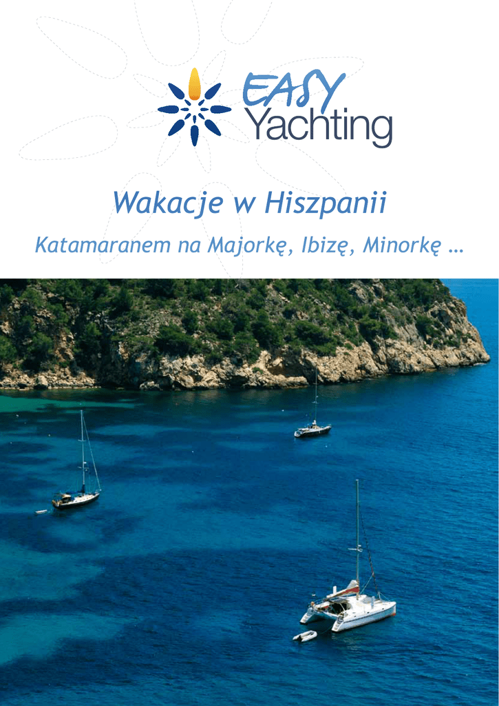Wakacje w Hiszpanii Katamaranem na Majorkę, Ibizę, Minorkę … Rajski klimat w Europie Zaletą archipelagu Balearów jest ich różnorodność. Każda z wysp posiada swój własny niepowtarzalny charakter czego dowodem są m.in. artyści, którzy znaleźli na Balearach swoją przystań. Majorkę upodobał sobie kiedyś Fryderyk Chopin a dzisiaj m.in. Rolling Stones i Harrison Ford. Na Ibizie inspiracji szukali Roman Polański, Pink Floyd i inni. Wspaniałe zabytki, najpiękniejsze plaże i turkusowe wody Morza Śródziemnego czekają na Ciebie. Baleary - Islas Baleares BARCELONA Majorka Morze Śródziemne PALMA WALENCJA HISZPANIA ALICANTE Ibiza Espalmador Formentera Cabrera ELVISSA SANT FRANCESC XAVIER Minorka MAÓ Czarter jachtu żaglowego w stylu Bed & Breakfast Oferujemy wynajem katamaranu wraz z jego załogą odpowiedzialną za prowadzenie jachtu oraz miłe i bezpieczne spędzenie wakacji. Pomysł na urlop: pływający apartament ze śniadaniem. Mieszkasz w pływającym apartamencie, który porusza się w wybranym przez Ciebie kierunku (albo po prostu stoi w błękitnej lagunie). Do dyspozycji masz 3 dwuosobowe kabiny z łazienkami, kuchnię, salon, taras i mnóstwo dodatkowych atrakcji np. sprzęt do uprawiania sportów wodnych. W cenie czarteru są śniadania przygotowywane przez załogę. Doświadczenie żeglarskie nie jest ani potrzebne ani wymagane. Dwuosobowa załoga prowadzi jacht oraz doradza jakie miejsca są warte odwiedzenia. Dzikie plaże niedostępne z lądu, wspaniałe zabytki i różnorodna kultura Balearów czekają na Ciebie. Twoim domem na okres wakacji jest dwukadłubowy jacht żaglowy - katamaran, którym zwiedzasz wyspy z zewnątrz od strony morza. Ale jeśli tylko zapragniesz zwiedzić wyspy od środka, obsługa doradzi, gdzie wynająć samochód i którą drogą i gdzie pojechać. Komfortowy katamaran żaglowy Serdecznie witamy na pokładzie naszego jachtu i zapraszamy na wygodną i bezstresową podróż dookoła Balearów. Katamaran Lagoon 570 DVD CREW To świetnie wyposażony „pływający hotel”, który nie przechyla się tak jak klasyczny jacht żaglowy. Niewielkie zanurzenie – tylko 1,4m pozwala podpłynąć bardzo blisko plaży. Do Twojej dyspozycji są 3 dwuosobowe kabiny - każda z własną łazienką i wiele udogodnień jak np. generator prądu czy też odsalarka wody. W pełni wyposażona kuchnia, salon z okrągłym stołem i wygodną sofą oraz duży taras sprawią, że poczujesz się jak u siebie. Katamaran to bezpieczna i osób w starszym wieku. żegluga również dla Tel. +48 12 391 71 70 Tel. kom. +48 601 447 477 [email protected] www.easyyachting.eu dzieci