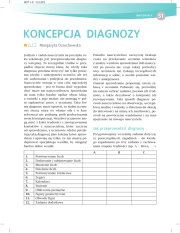 MS71 s.51 13.9.2013 MATERIAŁY KONCEPCJA DIAGNOZY Margaryta Orzechowska Jednym z zadań nauczyciela na początku roku szkolnego jest przeprowadzenie diagnozy wstępnej. To szczególnie trudne w przypadku objęcia nowej klasy, bo wtedy taka diagnoza powinna dotyczyć nie tylko poziomu wiedzy i umiejętności uczniów, ale też ich zachowania i podejścia do przedmiotu. Nauczyciele stosują w tym celu najczęściej sprawdziany – jest to forma dość wygodna, choć może nie najszczęśliwsza. Sprawdzian da nam tylko bardzo ogólny obraz klasy, a wnioski z jego analizy nie pomogą w pełni zaplanować pracy z uczniami. Taka forma diagnozy może sprawić, że słabsi uczniowie stracą wiarę we własne siły i w konsekwencji nie podejmą prób podwyższania swoich kompetencji. Wrażliwi uczniowie mogą mieć z kolei trudności z nawiązywaniem kontaktów z nauczycielem, który zaczyna od sprawdzianu, a uczniowie zdolni potraktują taką diagnozę jako kolejny łatwy sprawdzian i upewnią się tylko, że nie muszą podejmować specjalnego wysiłku, by osiągnąć bardzo dobre wyniki. Ponadto nauczycielowi zazwyczaj brakuje czasu na przekazanie uczniom wniosków z analizy wyników sprawdzianu (lub nauczyciel po prostu nie czuje takiej potrzeby), więc uczniowie nie zyskują szczegółowych informacji o sobie, o swoim poziomie wiedzy i umiejętności. Zamiast sprawdzianu proponuję zatem zabawę z uczniami. Pobawmy się, pozwólmy im samym wybrać zadania, poziom ich trudności, a także decydować o kolejności ich rozwiązywania. Taki sposób diagnozy pozwoli nauczycielowi na obserwację, szczegółową analizę i wnioski, a dzieciom da okazję do aktywności na miarę ich możliwości, pozwoli na powtórzenie wiadomości i na inne spojrzenie na nowego nauczyciela. Jak przeprowadzić diagnozę Przygotowujemy wcześniej zadania dotyczące poszczególnych zagadnień – do każdego zagadnienia po trzy zadania z zachowaniem stopnia trudności (np. A – łatwe, A 1. Porównywanie liczb 2. Dodawanie i odejmowanie liczb 3. Mnożenie liczb 4. Dzielenie liczb 5. Porównywanie różnicowe 6. Zegary 7. Kalendarz 8. Ważenie 9. Obliczenia pieniężne 10. Figury geometryczne 11. Obwody figur 12. Zadania dodatkowe B C 51 MS71 s.52 13.9.2013 52 MATERIAŁY B – średnie, C – trudne). Na początku zajęć wręczamy uczniom mapę zadań – może to być tabela lub na przykład plan regat. Mapa zadań zawiera zagadnienia z podstawy programowej klas 1–3. Każdy uczeń sam decyduje, od którego tematu zacznie, a następnie wybiera poziom trudności zadania z danego zagadnienia. Na planie regat zagadnienia przedstawiamy za pomocą żaglówek (zob. rysunek obok). Jeśli uczeń stwierdzi, że zadanie jest dla niego zbyt łatwe lub za trudne, może zmienić swoją decyzję i spróbować rozwiązać zadanie z innego poziomu. Można się umówić z uczniami, że przebieg swoich aktywności będą zapisywać za pomocą symboli na mapie zadań; wtedy dodatkowo mamy możliwość prześledzenia decyzji dziecka i poznania jego możliwości. Na przykład zaznaczanie numerami kolejności wybieranych zadań może dostarczyć informacji na temat zagadnień, w których uczeń czuje się najlepiej. Umieszczenie umownego symbolu „S” przy danym zadaniu może oznaczać – samodzielnie rozwiązałem zadanie, symbolu „P” – potrzebowałem pomocy nauczyciela, symbolu „Z” – zrezygnowałem lub zrobię to zadanie później. Wszystkie zadania razem z podpisaną mapą zadań uczniowie gromadzą (np. w kopertach lub plastikowych koszulkach) i na koniec zajęć oddają nauczycielowi do sprawdzenia. Na takie zajęcia poświęćmy dwie godziny lekcyjne. Zaproponowana tu diagnoza pozwala też na poznanie imion uczniów, obserwowanie ich działań, wspomaganie ich i sporządzanie wstępnych notatek z obserwacji. Czas, jak widać, jest dobrze spożytkowany. Podczas takiej diagnozy uczniowie nie tylko rozwiązują zadania – uczą się też oceny swoich możliwości, podejmowania decyzji, bez ryzyka surowej oceny. Dzięki temu zwiększa się ich motywacja do podejmowania wysiłku w celu rozwiązania problemów i zaufanie do nowego, przyjaźnie nastawionego nauczyciela. Oczywiście sprawdzanie zadań i analiza wyników zajmie nauczycielowi więcej czasu, ale czyż korzyści nie są tu większe niż przy sprawdzianie? Na następnych stronach przedstawiam wybrane zadania, które można wykorzystać do przeprowadzenia diagnozy w klasie czwartej szkoły podstawowej. Gotowy do wydruku zestaw obejmujący wszystkie zagadnienia zawarte w mapie zadań oraz plan regat znajdują się na stronie www.czasopisma.gwo.pl (hasło potrzebne do otwarcia pliku: pa5ezw). MS71 s.53 13.9.2013 MATERIAŁY 1. A. Liczby podane poniżej zapisz w kolej- 3. A. Połącz działania z ich wynikami. ności od najmniejszej do największej. 345 543 534 453 354 435 1. B. Na trzech kartonikach umieszczono cyfry 7, 3 i 9. Jakie liczby trzycyfrowe można ułożyć za pomocą tych kartoników? Zapisz te liczby w kolejności od największej do najmniejszej. 3. B. Uzupełnij tabelkę: 1. C. Wpisz w kwadracikach cyfry dobrane · tak, aby nierówności były prawdziwe. 3 57 < 5 62 < <5 197 > 1 4 > 189 4 4 < 74 175 > 1 1 > 169 5 2 6 7 9 8 2. A. Uzupełnij działania: 15 + 4 = 54 − 16 = 20 − 7 = 200 + 150 = 62 + 29 = 400 − 230 = 3. C. Uzupełnij grafy: 2. B. Uzupełnij graf: 4. A. Połącz działania z ich wynikami. 2. C. Uzupełnij tabelkę: Liczba a 58 4 Liczba b 24 15 8 63 Suma liczb aib 3 35 7 100 7 3 39 4 8 53 MS71 s.54 13.9.2013 54 MATERIAŁY 4. B. Wstaw znak >, < lub =. 4:1 ......... 16 : 4 63 : 9 ......... 63 : 7 ......... 81 : 9 24 : 8 ......... 24 : 6 45 : 5 56 : 8 ......... 42 : 7 39 : 13 ......... 28 : 7 6. A. Wpisz godziny na zegarach cyfrowych lub dorysuj brakujące wskazówki na tarczach zegarów tak, by zegary wskazywały tę samą godzinę. a) b) 4. C. Na ile osób można podzielić podane na opakowaniach liczby cukierków, aby każda z nich dost