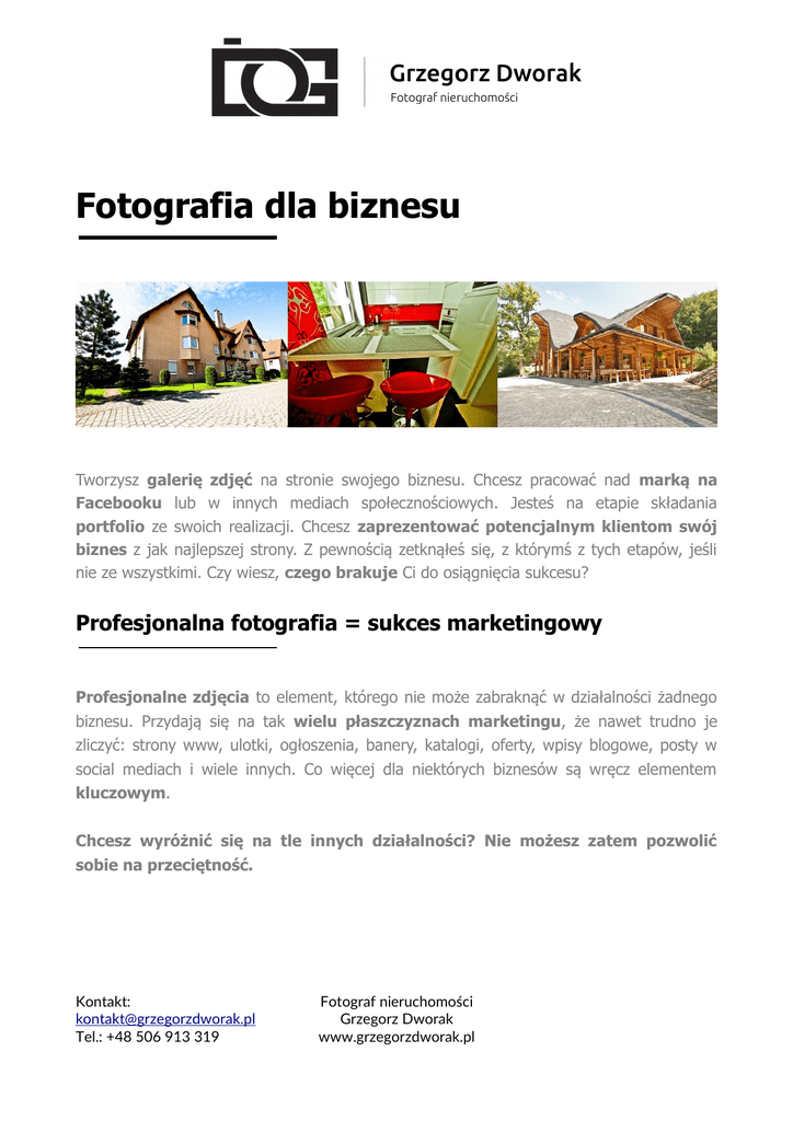 Fotografia dla biznesu Tworzysz galerię zdjęć na stronie swojego biznesu. Chcesz pracować nad marką na Facebooku lub w innych mediach społecznościowych. Jesteś na etapie składania portfolio ze swoich realizacji. Chcesz zaprezentować potencjalnym klientom swój biznes z jak najlepszej strony. Z pewnością zetknąłeś się, z którymś z tych etapów, jeśli nie ze wszystkimi. Czy wiesz, czego brakuje Ci do osiągnięcia sukcesu? Profesjonalna fotografia = sukces marketingowy Profesjonalne zdjęcia to element, którego nie może zabraknąć w działalności żadnego biznesu. Przydają się na tak wielu płaszczyznach marketingu, że nawet trudno je zliczyć: strony www, ulotki, ogłoszenia, banery, katalogi, oferty, wpisy blogowe, posty w social mediach i wiele innych. Co więcej dla niektórych biznesów są wręcz elementem kluczowym. Chcesz wyróżnić się na tle innych działalności? Nie możesz zatem pozwolić sobie na przeciętność. Kontakt: [email protected] Tel.: +48 506 913 319 Fotograf nieruchomości Grzegorz Dworak www.grzegorzdworak.pl Dla kogo? Zakres działalności dopasowuję do potrzeb rynku, dlatego też jest on bardzo bogaty. Wykonuję profesjonalne fotografie, które możesz wykorzystać w szeroko pojętym marketingu, zdobywając dzięki temu coraz więcej i więcej klientów. Działam między innymi w takich obszarach jak: - fotografia fotografia fotografia fotografia fotografia fotografia dla biur nieruchomości, dla pośredników, dla inwestorów, dla architektów, lokali usługowych, dla branży budowlanej i wykończeniowej. Znajdujesz się w tej grupie? Właściciele nieruchomości, agencje nieruchomości, projektanci, architekci, właściciele wnętrz komercyjnych, deweloperzy, inwestorzy, wykonawcy, pośrednicy, rzeczoznawcy budowlani, zarządcy nieruchomości, właściciele hoteli, domów, restauracji, salonów oraz wszelkich innych biznesów. Jeśli Twoja odpowiedź to TAK, to moja fotografia z pewnością pomoże Ci podkręcić działania marketingowe. Kontakt: [email protected] Tel.: +48 506 913 319 Fotograf nieruchomości Grzegorz Dworak www.grzegorzdworak.pl Jak działam? Nasza współpraca zawsze będzie opierać się na jasno określonych zasadach. 1. Doradztwo – zapoznaje się z Twoją branżą, analizuję Twoje zlecenie oraz Twoje wymagania, doradzam, jak najłatwiej i najskuteczniej osiągniemy zamierzone efekty. 2. Dojazd i wykonanie fotografii – dojeżdżam na miejsce zlecenia i wykonuję fotografie zgodnie z wcześniej ustalonymi wytycznymi. 3. Obróbka fotografii – przygotowuję wykonane zdjęcia tak, aby maksymalnie podkreślały wszystkie atuty budynku, wnętrza, salonu itp. 4. Oddanie zlecenia i zakończenie – dostarczam gotowe materiały, które od razu możesz wykorzystać do marketingu. Chcesz poznać więcej szczegółów? Skontaktuj się ze mną, przedstaw swoją wizję, a ja powiem Ci, jakie mamy możliwości. Wykonam cennik dla konkretnej usługi i poinformuję Cię o wszystkich detalach związanych z Twoim zleceniem. Nic nie tracisz, a możesz naprawdę wiele zyskać. Fotografia dla biznesu - możesz zarabiać więcej! Czekam na Twoją wiadomość! Kontakt: [email protected] Tel.: +48 506 913 319 Fotograf nieruchomości Grzegorz Dworak www.grzegorzdworak.pl
