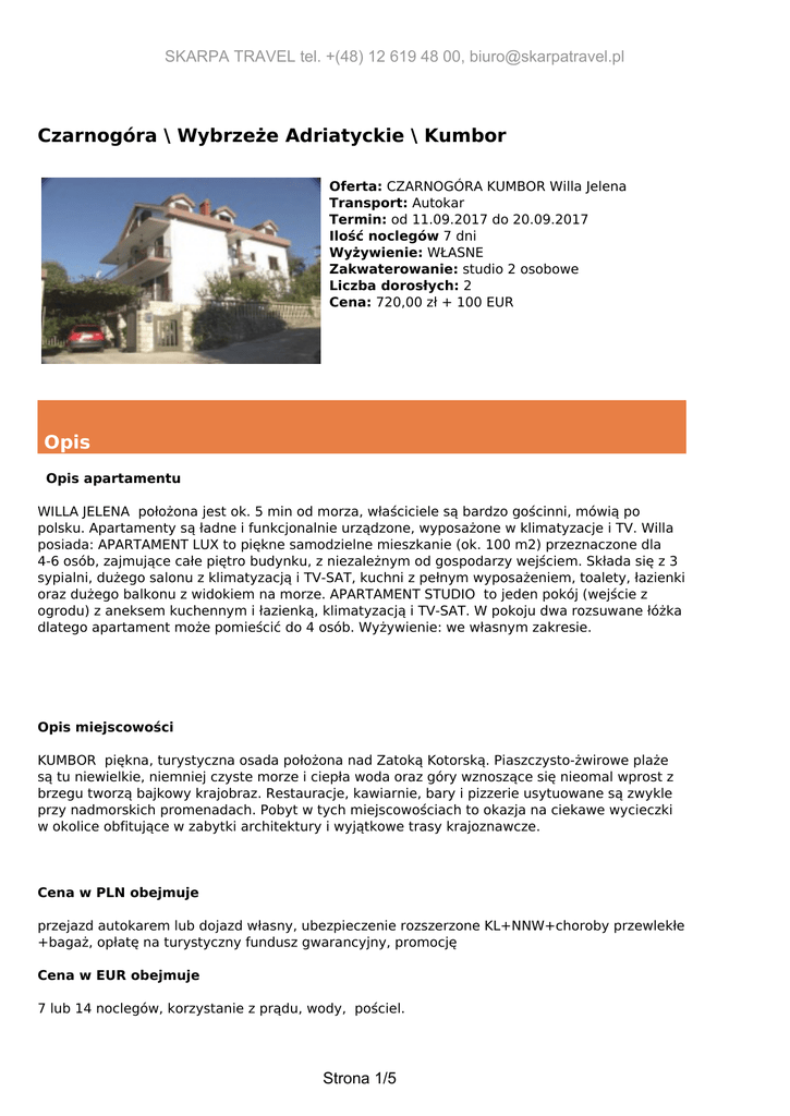 SKARPA TRAVEL tel. +(48) 12 619 48 00, [email protected] Czarnogóra \ Wybrzeże Adriatyckie \ Kumbor Oferta: CZARNOGÓRA KUMBOR Willa Jelena Transport: Autokar Termin: od 11.09.2017 do 20.09.2017 Ilość noclegów 7 dni Wyżywienie: WŁASNE Zakwaterowanie: studio 2 osobowe Liczba dorosłych: 2 Cena: 720,00 zł + 100 EUR Opis Opis apartamentu WILLA JELENA położona jest ok. 5 min od morza, właściciele są bardzo gościnni, mówią po polsku. Apartamenty są ładne i funkcjonalnie urządzone, wyposażone w klimatyzacje i TV. Willa posiada: APARTAMENT LUX to piękne samodzielne mieszkanie (ok. 100 m2) przeznaczone dla 4-6 osób, zajmujące całe piętro budynku, z niezależnym od gospodarzy wejściem. Składa się z 3 sypialni, dużego salonu z klimatyzacją i TV-SAT, kuchni z pełnym wyposażeniem, toalety, łazienki oraz dużego balkonu z widokiem na morze. APARTAMENT STUDIO to jeden pokój (wejście z ogrodu) z aneksem kuchennym i łazienką, klimatyzacją i TV-SAT. W pokoju dwa rozsuwane łóżka dlatego apartament może pomieścić do 4 osób. Wyżywienie: we własnym zakresie. Opis miejscowości KUMBOR piękna, turystyczna osada położona nad Zatoką Kotorską. Piaszczysto-żwirowe plaże są tu niewielkie, niemniej czyste morze i ciepła woda oraz góry wznoszące się nieomal wprost z brzegu tworzą bajkowy krajobraz. Restauracje, kawiarnie, bary i pizzerie usytuowane są zwykle przy nadmorskich promenadach. Pobyt w tych miejscowościach to okazja na ciekawe wycieczki w okolice obfitujące w zabytki architektury i wyjątkowe trasy krajoznawcze. Cena w PLN obejmuje przejazd autokarem lub dojazd własny, ubezpieczenie rozszerzone KL+NNW+choroby przewlekłe +bagaż, opłatę na turystyczny fundusz gwarancyjny, promocję Cena w EUR obejmuje 7 lub 14 noclegów, korzystanie z prądu, wody, pościel. Strona 1/5 SKARPA TRAVEL tel. +(48) 12 619 48 00, [email protected] Dopłaty 1. Taksa klimatyczna obowiązkowo płatna: 1 EUR dziennie / osoba, dzieci do 12 lat płacą 50% Zniżki W cenie uwzględniona PROMOCJĘ FIRST MINUTE: przy dojeździe autokarem – 100 zł / osoba przy dojeździe własnym – 50 zł / osoba 1. 5 i 6 osoba w apartamencie LUX oraz 3 osoba w Studio płaci kwotę w zł + 40 EUR / 7 dni. 2. STAŁY KLIENT: obejmuje osoby korzystające trzeci kolejny rok z naszej oferty ! Uwagi organizatora 1.Kwota w złotych płatna jest w Polsce, kwota w EUR płatna w Czarnogórze. 2.Przy dojeździe własnym, gdy potrzebna jest faktura na całość i przy zakupie ubezpieczenia od kosztów rezygnacji wtedy obowiązkowo równowartość kwoty w EUR płatna jest w Polsce. Kwota w EUR przeliczana jest na zł wg kursu NBP pieniądz sprzedaż z dnia ostatniej wpłaty. 3.W dniu wykupienia imprezy/ wpłaty zaliczki klient ma możliwość wykupienia dodatkowego ubezpieczenia od kosztów rezygnacji z imprezy zgodnie z Ogólnymi Warunkmi Ubezpieczenia KOSZTÓW IMPREZY TURYSTYCZNEJ w wysokości 3,3% jednak nie później niż 5 dni od dnia podpisania umowy. 4. Wycieczki fakultatywne organizowane są przez lokalne biura podróży. 5.Doba hotelowa rozpoczyna się o godz 14 i kończy o godz 9. 6. Miejsca i godziny odjazdów autokarów podano w rozkładzie jazdy 7. Potrzebny DOWÓD OSOBISTY lub PASZPORT ! Prosze pamiętać również o dokumencie dla dzieci. 8. Dla osób dojeżdżających do Krakowa możemy zarezerwować przednocleg w cenie od 100 zł. Uwagi przewoźnika 1.Transport na trasach antenowych w Polsce możliwy jest mikrobusem, autokarem klasy turystycznej, samochodem osobowym lub innym przewoźnikiem np. Polskim Busem, Luxbusem, PKP, PKS itp. Ewentualną zmianę godzin odjazdów podamy najpóźniej na 24 godziny przed odjazdem. Trasa połączeń na terenie kraju zależy od zgłoszeń z poszczególnych miast, co może spowodować, ze przejazd nie będzie realizowany najkrótszą z możliwych tras. 2. Na trasach poza granicami Polski transport odbywa się autokarami wyposażonymi w siedzenia uchylne, klimatyzację, toalety, video i nagłośnienie. Przy małej ilości osób, możliwość przewozu uczestników małym autobusem bez WC i mini baru, wtedy toalety na postojach płatne przez przewoźnika. 3. Podane godziny wyjazdów i przyjazdów mogą ulec zmianie z różnych przyczyn np. złe warunki drogowe, atmosferyczne, zwiększanie ruchu na drogach szczególnie w szczycie Strona 2/5 SKARPA TRAVEL tel. +(48) 12 619 48 00, [email protected] sezonu letniego i inne. 4. Prosimy o przybycie na miejsce zbiórki najpóźniej 15 minut przed planowaną godziną odjazdu. Miejsca w autokarze są przydzielane w kolejności podpisania umowy, a klienci o miejscach informowani są przez obsługę na miejscu zbiórki. W autokarze obowiązuje całkowity zakaz palenia papierosów oraz spożywania alkoholu. Osoby korzystające z samego przejazdu, powinny obowiązkowo ubezpieczyć się na czas pobytu. Przewoźnik gwarantuje tylko ubezpieczenie na czas przejazdu. Ramowy program imprezy (klasyczny 7 noclegowy) 1 dzień Wyjazd z Polski zgodnie z rozkładem jazdy, przejazd przez Słowację (dla chętnych posiłek w cenie ok.5 EUR), Węgry i Bośnię. 2 dzień przejazd przez Chorwację i Czarnogórę, przyjazd na miejsce wypoczynku godz. południowych. Zakwaterowanie od 14, obiadokolacja, nocleg. 3 – 8 dzień WYPOCZYNEK. Możliwość wykupienia wycieczek fakultatywnych. 9 dzień Po śniadaniu wykwaterowanie z hoteli do godz. 9, czas wolny, wyjazd w drogę powrotną ok. godz. południowych. Przejazd przez Czarnogórę, Bośnię i Chorwację. 10 dzień Przejazd przez Węgry i Słowację (dla chętnych posiłek w cenie ok.5 EUR). Orientacyjny przyjazd do Krakowa ok. godziny 17:00. Praktyczne informacje Najbliższa placówka dyplomatyczna: Ambasada RPul.Kozaracka 79, 81000 Podgorica tel.(00382) 20 608320, tel dyżurny (00382) 20608321 fax (00382) 20 658 581 Obowiązująca waluta: EUR Wycieczki fakultatywne organizowane przez lokalne 1.REJS STATKIEM PO ZATOCE KOTORSKIEJ ok.30 EUR 2. DUBROWNIK ok. 35 EUR 3.CETINJE-LOVCEN-NJ