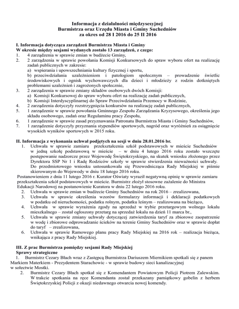 Informacja z działalności międzysesyjnej Burmistrza oraz Urzędu Miasta i Gminy Suchedniów za okres od 28 I 2016 do 25 II 2016 I. Informacja dotycząca zarządzeń Burmistrza Miasta i Gminy W okresie między sesjami wydanych zostało 13 zarządzeń, z czego: 1. 4 zarządzenia w sprawie zmian w budżecie Gminy, 2. 2 zarządzenia w sprawie powołania Komisji Konkursowych do spraw wyboru ofert na realizację zadań publicznych w zakresie: a) wspierania i upowszechniania kultury fizycznej i sportu, b) przeciwdziałania uzależnieniom i patologiom społecznym – prowadzenie świetlic środowiskowych i ognisk wychowawczych dla dzieci i młodzieży z rodzin dotkniętych problemami uzależnień i zagrożonych społecznie, 3. 2 zarządzenia w sprawie zmiany składów osobowych dwóch Komisji: a) Komisji Konkursowej do spraw wyboru ofert na realizację zadań publicznych, b) Komisji Interdyscyplinarnej do Spraw Przeciwdziałania Przemocy w Rodzinie, 4. 2 zarządzenia dotyczyły rozstrzygnięcia konkursów na realizację zadań publicznych, 5. 1 zarządzenie w sprawie powołania Gminnego Zespołu Zarządzania Kryzysowego, określenia jego składu osobowego, zadań oraz Regulaminu pracy Zespołu, 6. 1 zarządzenie w sprawie zasad przyznawania Patronatu Burmistrza Miasta i Gminy Suchedniów, 7. 1 zarządzenie dotyczyły przyznania stypendiów sportowych, nagród oraz wyróżnień za osiągnięcie wysokich wyników sportowych w 2015 roku. II. Informacja z wykonania uchwał podjętych na sesji w dniu 28.01.2016 br. 1. Uchwała w sprawie zamiaru przekształcenia szkół podstawowych w mieście Suchedniów w jedną szkołę podstawową w mieście – w dniu 4 lutego 2016 roku zostało wszczęte postępowanie nadzorcze przez Wojewodę Świętokrzyskiego, na skutek wniosku złożonego przez Dyrektora SSP Nr 1 i Radę Rodziców szkoły w sprawie stwierdzenia nieważności uchwały. Do przedmiotowego wniosku ustosunkowała się Przewodnicząca Rady Miejskiej w piśmie skierowanym do Wojewody w dniu 18 lutego 2016 roku. Postanowieniem z dnia 11 lutego 2016 r. Kurator Oświaty wyraził negatywną opinię w sprawie zamiaru przekształcenia szkół podstawowych w mieście. Burmistrz złożył stosowne zażalenie do Ministra Edukacji Narodowej na postanowienie Kuratora w dniu 22 lutego 2016 roku. 2. Uchwała w sprawie zmian w budżecie Gminy Suchedniów na rok 2016 – zrealizowana, 3. Uchwała w sprawie określenia wzorów formularzy informacji i deklaracji podatkowych w podatku od nieruchomości, podatku rolnym, podatku leśnym – realizowana na bieżąco, 4. Uchwała w sprawie wyrażenia zgody na sprzedaż w trybie przetargowym wolnego lokalu mieszkalnego – został ogłoszony przetarg na sprzedaż lokalu na dzień 11 marca br., 5. Uchwała w sprawie zmiany uchwały dotyczącej zatwierdzenia taryf za zbiorowe zaopatrzenie w wodę i zbiorowe odprowadzanie ścieków na terenie Gminy Suchedniów oraz w sprawie dopłat do taryf – zrealizowana, 6. Uchwała w sprawie Ramowego planu pracy Rady Miejskiej na 2016 rok – realizacja bieżąca, wnikająca z pracy Rady Miejskiej. III. Z prac Burmistrza pomiędzy sesjami Rady Miejskiej Sprawy strategiczne 1. Burmistrz Cezary Błach wraz z Zastępcą Burmistrza Dariuszem Miernikiem spotkali się z panem Markiem Materkiem - Prezydentem Starachowic - w sprawie budowy sieci kanalizacyjnej w sołectwie Mostki. 2. Burmistrz Cezary Błach spotkał się z Komendantem Powiatowym Policji Piotrem Zalewskim. W trakcie spotkania na ręce Komendanta został przekazany pamiątkowy gobelin z herbem Świętokrzyskiej Policji z okazji niedawnego otwarcia nowej komendy. 3. W dniu 8 lutego Burmistrz Miasta i Gminy Suchedniów uczestniczył w spotkaniu z panem Jarosławem Stawiarskim - wiceministrem sportu i turystyki, który gościł w Suchedniowskim Klubie Sportowym "Orlicz". Spotkanie dotyczyło możliwości uzyskania wsparcia w zakresie planów związanych z rozwojem sportu w Suchedniowie. 4. W dniu 8 lutego Burmistrz Cezary Błach spotkał się z Prezesem Spółki „Uzdrowisko BuskoZdrój” w sprawie dalszego sponsorowania MKS Orlicz Suchedniów. 5. W dniu 9 lutego Burmistrz Cezary Błach uczestniczył w Naradzie Rocznej Policji w Komendzie Powiatowej Policji w Skarżysku-Kamiennej. 6. 11 lutego Burmistrz uczestniczył w spotkaniu z Fundacją Centrum Europy Lokalnej w sprawie możliwości nawiązania współpracy partnerskiej na rzecz realizacji projektu w ramach RPO poddziałanie 8.3.2 Wsparcie kształcenia podstawowego w zakresie kompetencji kluczowych 7. 11 lutego Burmistrz podpisał umowę z firmą InicjatywaLokalna.pl w sprawie opracowania dokumentu pod nazwą "Koncepcja metodologiczna prac wraz z planem działań partycypacyjnych służących opracowaniu Gminnego Programu Rewitalizacji Miasta i Gminy Suchedniów na lata 2016-2026". 8. W dniu 15 lutego Burmistrz Cezary Błach uczestniczył w posiedzeniu Związku Miast i Gmin Regionu Świętokrzyskiego. 9. W dniu 17 lutego Burmistrz Cezary Błach uczestniczył w rocznej naradzie Komendy Powiatowej Państwowej Straży Pożarnej w Skarżysku- Kamiennej. 10. W dniu 22 lutego Burmistrz Cezary Błach wraz z pracownikami MGOPS uczestniczył w spotkaniu informacyjnym w Świętokrzyskim Urzędzie Wojewódzkim poświęconym programowi 500+. Uroczystości/wydarzenia sportowe/kulturalne 1. W dniu 9 lutego Burmistrz Cezary Błach wraz z Przewodnicząca Rady Miejskiej Małgorzatą Styczeń uczestniczyli w Uroczystej Gali Świętokrzyskiej Viktorii. 2. W dniu 13 lutego Burmistrz Cezary Błach wraz z Wiceprzewodniczącym Rady Panem Krzysztofem Adamcem uczestniczyli w uroczystościach patriotycznych na Borze. 3. W dniu 18 lutego 2016 r. Burmistrz Cezary Błach wraz ze swoim zastępcą Dariuszem Miernikiem oraz Kierownikiem USC Pawłem Lisowskim złożyli życzenia mieszkance Suchedniowa Pani Zofii Obarze, która obchodziła setną rocznicę urodzin. Przedsięwzięcia pod patronatem Burmistrza 1. W dniu 20 lutego odbyły się XIV Mistrzostw
