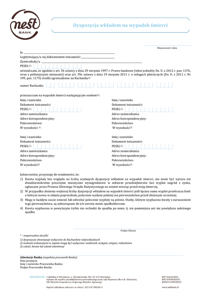 Dyspozycja wkładem na wypadek śmierci Miejscowość i data Ja, _____________________________________________________________________________ Legitymujący/a się dokumentem tożsamości ____________________________ Zamieszkały/a _____________________________________________________________________________________ PESEL1): oświadczam, że zgodnie z art. 56 ustawy z dnia 29 sierpnia 1997 r. Prawo bankowe (tekst jednolity Dz. U. z 2012 r. poz. 1376, wraz z późniejszymi zmianami) oraz art. 39a ustawy z dnia 19 sierpnia 2011 r. o usługach płatniczych (Dz. U. z 2011 r. Nr 199, poz. 1175) środki zgromadzone na Rachunku2) numer Rachunku przeznaczam na wypadek śmierci następującym osobom3): Imię i nazwisko Dokument tożsamości: PESEL1): Imię i nazwisko Dokument tożsamości: PESEL1): Adres zamieszkania: Adres korespondencyjny: Pokrewieństwo: W wysokości 3) Adres zamieszkania: Adres korespondencyjny: Pokrewieństwo W wysokości3) Imię i nazwisko Dokument tożsamości: PESEL1): Imię i nazwisko Dokument tożsamości: PESEL1): Adres zamieszkania: Adres korespondencyjny: Pokrewieństwo: W wysokości3) Adres zamieszkania: Adres korespondencyjny: Pokrewieństwo: W wysokości3) Jednocześnie, przyjmuję do wiadomości, że: 1) Kwota wypłaty bez względu na liczbę wydanych dyspozycji wkładem na wypadek śmierci, nie może być wyższa niż dwudziestokrotne przeciętne miesięczne wynagrodzenie w sektorze przedsiębiorstw bez wypłat nagród z zysku, ogłaszane przez Prezesa Głównego Urzędu Statystycznego za ostatni miesiąc przed moją śmiercią. 2) W przypadku złożenia większej liczby dyspozycji wkładem na wypadek śmierci jeśli łączna suma wypłat przekracza limit o którym mowa w zdaniu poprzednim, polecenie wydane później ma pierwszeństwo przed złożonym wcześniej. 3) Mogę w każdym czasie zmienić lub odwołać polecenie wypłaty na piśmie. Osoby, którym wypłacono kwoty z naruszeniem tego pierwszeństwa, są zobowiązane do ich zwrotu moim spadkobiercom. 4) Kwota wypłacona w powyższym trybie nie wchodzi do spadku po mnie, tj. nie pomniejsza ani nie powiększa należnego spadku Podpis Klienta * - niepotrzebne skreślić 1) dyspozycja obowiązuje wyłącznie do Rachunków indywidualnych 2) osobami wskazanymi w zapisie mogą być wyłącznie: małżonek, wstępni, zstępni, rodzeństwo 3) całość, kwota lub udział ułamkowy Adnotacje Banku (wypełnia pracownik Banku) Data przyjęcia Imię i nazwisko Pracownika Banku: Podpis Pracownika Banku: