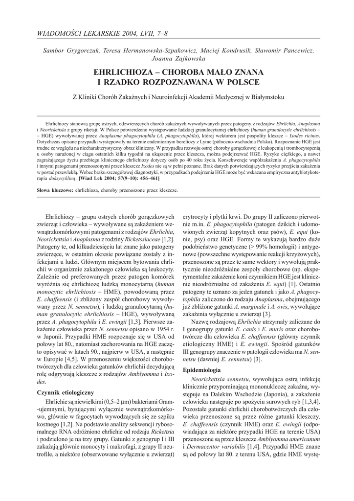 456 WIADOMOŚCI LEKARSKIE 2004, LVII, 7–8 Nr 9–10 Sambor Grygorczuk, Teresa Hermanowska-Szpakowicz, Maciej Kondrusik, Sławomir Pancewicz, Joanna Zajkowska EHRLICHIOZA – CHOROBA MAŁO ZNANA I RZADKO ROZPOZNAWANA W POLSCE Z Kliniki Chorób Zakaźnych i Neuroinfekcji Akademii Medycznej w Białymstoku Ehrlichiozy stanowią grupę ostrych, odzwierzęcych chorób zakaźnych wywoływanych przez patogeny z rodzajów Ehrlichia, Anaplasma i Neorickettsia z grupy riketsji. W Polsce potwierdzono występowanie ludzkiej granulocytarnej ehrlichiozy (human granulocytic ehrlichiosis – – HGE) wywoływanej przez Anaplasma phagocytophila (A. phagocytophila), której wektorem jest pospolity kleszcz – Ixodes ricinus. Dotychczas opisane przypadki występowały na terenie endemicznym boreliozy z Lyme (północno-wschodnia Polska). Rozpoznanie HGE jest trudne ze względu na niecharakterystyczny obraz kliniczny. W przypadku rozwoju ostrej choroby gorączkowej z leukopenią i trombocytopenią u osoby narażonej w ciągu ostatnich kilku tygodni na ukąszenie przez kleszcza, można podejrzewać HGE. Ryzyko ciężkiego, a nawet zagrażającego życiu przebiegu klinicznego ehrlichiozy dotyczy osób po 40 roku życia. Konsekwencje współzakażenia A. phagocytophila i innymi patogenami przenoszonymi przez kleszcze Ixodes nie są w pełni poznane. Brak danych potwierdzających ryzyko przejścia zakażenia w postać przewlekłą. Wobec braku szczegółowej diagnostyki, w przypadkach podejrzenia HGE może być wskazana empiryczna antybiotykoterapia doksycykliną. [Wiad Lek 2004; 57(9–10): 456–461] Słowa kluczowe: ehrlichioza, choroby przenoszone przez kleszcze. Ehrlichiozy – grupa ostrych chorób gorączkowych zwierząt i człowieka – wywoływane są zakażeniem wewnątrzkomórkowymi patogenami z rodzajów Ehrlichia, Neorickettsia i Anaplasma z rodziny Ricketssiaceae [1,2]. Patogeny te, od kilkudziesięciu lat znane jako patogeny zwierzęce, w ostatnim okresie powiązane zostały z infekcjami u ludzi. Głównym miejscem bytowania ehrlichii w organizmie zakażonego człowieka są leukocyty. Zależnie od preferowanych przez patogen komórek wyróżnia się ehrlichiozę ludzką monocytarną (human monocytic ehrlichiosis – HME), powodowaną przez E. chaffeensis (i zbliżony zespół chorobowy wywoływany przez N. sennetsu), i ludzką granulocytarną (human granulocytic ehrlichiosis – HGE), wywoływaną przez A. phagocytophila i E. ewingii [1,3]. Pierwsze zakażenie człowieka przez N. sennetsu opisano w 1954 r. w Japonii. Przypadki HME rozpoznaje się w USA od połowy lat 80., natomiast zachorowania na HGE zaczęto opisywać w latach 90., najpierw w USA, a następnie w Europie [4,5]. W przenoszeniu większości chorobotwórczych dla człowieka gatunków ehrlichii decydującą rolę odgrywają kleszcze z rodzajów Amblyomma i Ixodes. Czynnik etiologiczny Ehrlichie są niewielkimi (0,5–2 µm) bakteriami Gram-ujemnymi, bytującymi wyłącznie wewnątrzkomórkowo, głównie w fagocytach wywodzących się ze szpiku kostnego [1,2]. Na podstawie analizy sekwencji rybosomalnego RNA odróżniono ehrlichie od rodzaju Rickettsia i podzielono je na trzy grupy. Gatunki z genogrup I i III zakażają głównie monocyty i makrofagi, z grupy II neutrofile, a niektóre (obserwowane wyłącznie u zwierząt) erytrocyty i płytki krwi. Do grupy II zaliczono pierwotnie m.in. E. phagocytophila (patogen dzikich i udomowionych zwierząt kopytnych oraz psów), E. equi (konie, psy) oraz HGE. Formy te wykazują bardzo duże podobieństwo genetyczne (> 99% homologii) i antygenowe (powszechne występowanie reakcji krzyżowych), przenoszone są przez te same wektory i wywołują praktycznie nieodróżnialne zespoły chorobowe (np. eksperymentalne zakażenie koni czynnikiem HGE jest klinicznie nieodróżnialne od zakażenia E. equi) [1]. Ostatnio patogeny te uznano za jeden gatunek i jako A. phagocytophila zaliczono do rodzaju Anaplasma, obejmującego już zbliżone gatunki A. marginale i A. ovis, wywołujące zakażenia wyłącznie u zwierząt [3]. Nazwę rodzajową Ehrlichia utrzymały zaliczane do I genogrupy gatunki E. canis i E. muris oraz chorobotwórcze dla człowieka E. chaffeensis (główny czynnik etiologiczny HME) i E. ewingii. Spośród gatunków III genogrupy znaczenie w patologii człowieka ma N. sennetsu (dawniej E. sennetsu) [3]. Epidemiologia Neorickettsia sennetsu, wywołująca ostrą infekcję klinicznie przypominającą mononukleozę zakaźną, występuje na Dalekim Wschodzie (Japonia), a zakażenie człowieka następuje po spożyciu surowych ryb [1,3,4]. Pozostałe gatunki ehrlichii chorobotwórczych dla człowieka przenoszone są przez różne gatunki kleszczy. E. chaffeensis (czynnik HME) oraz E. ewingii (odpowiadająca za niektóre przypadki HGE na terenie USA) przenoszone są przez kleszcze Amblyomma americanum i Dermacentor variabilis [1,4]. Przypadki HME znane są od połowy lat 80. z terenu USA, gdzie HME wystę- Nr 9–10 Ehrlichioza puje endemicznie na południowym wschodzie kraju [4]. W latach 1986–1997 w USA zgłoszono 742 zachorowania na HME; ponadto badania próbek przesłanych do Centers for Disease Control and Prevention (CDC) ujawniły dalsze 754 pewne lub prawdopodobne przypadki [5]. Roczna zachorowalność w poszczególnych stanach wynosiła 0–5,53/mln [5]. Zakażenia E. chaffeensis i E. ewingii w Europie są mało prawdopodobne ze względu na brak najważniejszego wektora (Amblyomma americanum); pojedyncze przypadki wykrycia przeciwciał przeciwko E. chaffeensis u chorych zakażonych jednocześnie czynnikiem HGE, stwierdzone przez Lotrič-Furlan i wsp. w Słowenii, były według autorów spowodowane obecnością reakcji krzyżowych [6]. W latach 1995–1996 opisano jednak we Włoszech (Sardynia) 4 przypadki zachorowań na ostrą chorobę gorączkową, z serokonwersją przeciwko E. chaffeensis i bez przeciwciał przeciwko czynnikowi HGE [7]. Pojedyncze zachorowania opisano też w 1991 r.