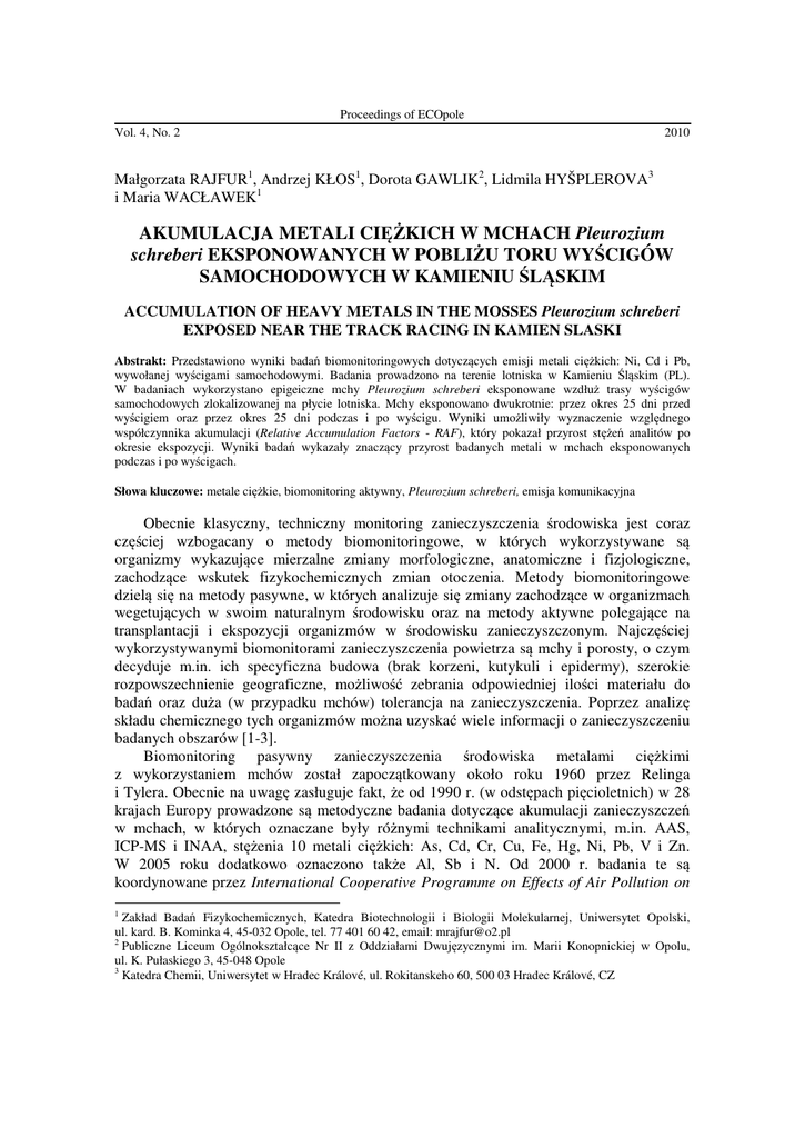 Proceedings of ECOpole Vol. 4, No. 2 2010 Małgorzata RAJFUR1, Andrzej KŁOS1, Dorota GAWLIK2, Lidmila HYŠPLEROVA3 i Maria WACŁAWEK1 AKUMULACJA METALI CIĘŻKICH W MCHACH Pleurozium schreberi EKSPONOWANYCH W POBLIŻU TORU WYŚCIGÓW SAMOCHODOWYCH W KAMIENIU ŚLĄSKIM ACCUMULATION OF HEAVY METALS IN THE MOSSES Pleurozium schreberi EXPOSED NEAR THE TRACK RACING IN KAMIEN SLASKI Abstrakt: Przedstawiono wyniki badań biomonitoringowych dotyczących emisji metali ciężkich: Ni, Cd i Pb, wywołanej wyścigami samochodowymi. Badania prowadzono na terenie lotniska w Kamieniu Śląskim (PL). W badaniach wykorzystano epigeiczne mchy Pleurozium schreberi eksponowane wzdłuż trasy wyścigów samochodowych zlokalizowanej na płycie lotniska. Mchy eksponowano dwukrotnie: przez okres 25 dni przed wyścigiem oraz przez okres 25 dni podczas i po wyścigu. Wyniki umożliwiły wyznaczenie względnego współczynnika akumulacji (Relative Accumulation Factors - RAF), który pokazał przyrost stężeń analitów po okresie ekspozycji. Wyniki badań wykazały znaczący przyrost badanych metali w mchach eksponowanych podczas i po wyścigach. Słowa kluczowe: metale ciężkie, biomonitoring aktywny, Pleurozium schreberi, emisja komunikacyjna Obecnie klasyczny, techniczny monitoring zanieczyszczenia środowiska jest coraz częściej wzbogacany o metody biomonitoringowe, w których wykorzystywane są organizmy wykazujące mierzalne zmiany morfologiczne, anatomiczne i fizjologiczne, zachodzące wskutek fizykochemicznych zmian otoczenia. Metody biomonitoringowe dzielą się na metody pasywne, w których analizuje się zmiany zachodzące w organizmach wegetujących w swoim naturalnym środowisku oraz na metody aktywne polegające na transplantacji i ekspozycji organizmów w środowisku zanieczyszczonym. Najczęściej wykorzystywanymi biomonitorami zanieczyszczenia powietrza są mchy i porosty, o czym decyduje m.in. ich specyficzna budowa (brak korzeni, kutykuli i epidermy), szerokie rozpowszechnienie geograficzne, możliwość zebrania odpowiedniej ilości materiału do badań oraz duża (w przypadku mchów) tolerancja na zanieczyszczenia. Poprzez analizę składu chemicznego tych organizmów można uzyskać wiele informacji o zanieczyszczeniu badanych obszarów [1-3]. Biomonitoring pasywny zanieczyszczenia środowiska metalami ciężkimi z wykorzystaniem mchów został zapoczątkowany około roku 1960 przez Relinga i Tylera. Obecnie na uwagę zasługuje fakt, że od 1990 r. (w odstępach pięcioletnich) w 28 krajach Europy prowadzone są metodyczne badania dotyczące akumulacji zanieczyszczeń w mchach, w których oznaczane były różnymi technikami analitycznymi, m.in. AAS, ICP-MS i INAA, stężenia 10 metali ciężkich: As, Cd, Cr, Cu, Fe, Hg, Ni, Pb, V i Zn. W 2005 roku dodatkowo oznaczono także Al, Sb i N. Od 2000 r. badania te są koordynowane przez International Cooperative Programme on Effects of Air Pollution on 1 Zakład Badań Fizykochemicznych, Katedra Biotechnologii i Biologii Molekularnej, Uniwersytet Opolski, ul. kard. B. Kominka 4, 45-032 Opole, tel. 77 401 60 42, email: [email protected] 2 Publiczne Liceum Ogólnokształcące Nr II z Oddziałami Dwujęzycznymi im. Marii Konopnickiej w Opolu, ul. K. Pułaskiego 3, 45-048 Opole 3 Katedra Chemii, Uniwersytet w Hradec Králové, ul. Rokitanskeho 60, 500 03 Hradec Králové, CZ 478 Małgorzata Rajfur, Andrzej Kłos, Dorota Gawlik, Lidmila Hyšplerova i Maria Wacławek Natural Vegetation and Drops, Bangor, UK. Uzyskane wyniki wskazują na sukcesywne zmniejszanie się stężenia większości badanych analitów w pobieranych próbkach mchów: arsenu, kadmu, żelaza, ołowiu i wanadu o 52÷72%, miedzi, niklu i cynku o 20÷30% i chromu o 2%. Od roku 1995 nie stwierdzono redukcji stężenia rtęci w badanym materiale [4]. Przykładem biomonitoringu aktywnego z zastosowaniem mchów są badania prowadzone we Włoszech, na podstawie których dokonano oceny zanieczyszczenia powietrza metalami ciężkimi, m.in. Cd, Cr, Cu, Fe, Mn i Pb, w mieście Ancerra, znajdującego się na obszarze tzw. „włoskiego trójkąta śmierci” ze względu na zanieczyszczenia powietrza. Do badań wykorzystano epifityczne mchy Scorpiurum circinatum, które transplantowano z mało zanieczyszczonych obszarów szczytu Monte Faito (1200 m n.p.m.). Transplanty przeniesiono na obszar miejski, dzieląc go na trzy strefy: 1) strefa silnie zurbanizowana i zaludniona, 2) strefa przemysłowa i 3) obszar rolniczy. W wyniku przeprowadzonych badań stwierdzono, że powietrze miasta Ancerra jest silnie zanieczyszczone badanymi analitami [5]. Od wielu lat poważnym obciążeniem dla środowiska jest emisja komunikacyjna. W 2008 r. w Polsce wskutek ruchu samochodowego zostało wyemitowanych ok. 18,305 Mg ołowiu (ok. 3,3% całkowitej rocznej emisji), ok. 5,758 Mg niklu, ok. 3,455 Mg miedzi i ok. 0,363 Mg kadmu (ok. 0,2% całkowitej rocznej emisji). W 2008 r., w porównaniu do roku 2007 r. nastąpiło zwiększenie emisji kadmu, niklu i ołowiu, zmniejszyła się natomiast emisja miedzi [6]. Biomonitoring emisji komunikacyjnej prowadzony był m.in. w latach 1994 i 1995 wzdłuż 55 km odcinka autostrady A1 Lille-Paryż we Francji, na Węgrzech w pobliżu autostrady M3 oraz wzdłuż drogi w Accera w Ghanie [7]. Celem prowadzonych przez nas badań była ocena emisji metali ciężkich: Ni, Cd i Pb, wzbogacających lokalnie aerozol atmosferyczny wskutek ruchu samochodowego na terenie wyścigów samochodowych na lotnisku w Kamieniu Śląskim. Do badań wykorzystano mchy Pleurozium schreberi transplantowane z lasów położonych w pobliżu wsi Kamień Śląski. Rys. 1. Lokalizacja obszaru badań Fig. 1. Location of the area studied Akumulacja metali ciężkich w mchach Pleurozium schreberi eksponowanych w pobliżu toru … 479 Charakterystyka obszaru badań Badania biomonitoringowe prowadzono na powojskowym lotnisku w Kamieniu Śląskim, położonym na terenie województwa opolskiego, w gminie Gogolin, o