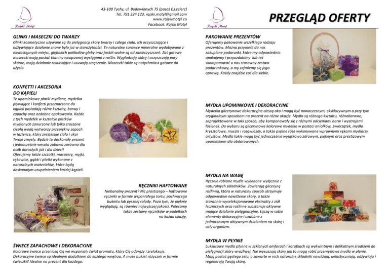 43-100 Tychy, ul. Budowlanych 75 (pasaż E.Leclerc) Tel. 791 324 123, [email protected] www.rajskimotyl.eu Facebook: Rajski Motyl PRZEGLĄD OFERTY GLINKI I MASECZKI DO TWARZY PAKOWANIE PREZENTÓW Glinki kosmetyczne używane są do pielęgnacji skóry twarzy i całego ciała. Ich oczyszczające i odżywiające działanie znane było już w starożytności. Te naturalne surowce mineralne wydobywane z niedostępnych miejsc, głębokich pokładów gleby oraz jaskiń wolne są od zanieczyszczeń. Zaś gotowe maseczki mają postać tkaniny nasączonej wyciągami z roślin. Wygładzają skórę i oczyszczają pory skórne, mają działanie relaksujące i usuwają zmęczenie. Maseczki takie są natychmiast gotowe do użycia. Oferujemy pakowanie wszelkiego rodzaju prezentów. Można przynieść do nas zakupione podarunki, które my odpowiednio opakujemy i przyozdobimy lub też skomponować u nas stosowny zestaw podarunkowy, a my zajmiemy się jego oprawą. Każdy znajdzie coś dla siebie. KONFETTI I AKCESORIA DO KĄPIELI Te upominkowe płatki mydlane, mydełka pływające i konfetti przeznaczone do kąpieli posiadają różne kształty, barwy i zapachy oraz ozdobne opakowania. Każde z tych mydełek w kształcie płatków mydlanych zanurzone lub tylko zroszone ciepłą wodą wytworzy przepiękny zapach w łazience, który zrelaksuje ciało i ukoi Twoje zmysły. Będzie to doskonały prezent i jednocześnie wesoła zabawa zarówno dla osób dorosłych jak i dla dzieci! Oferujemy także szczotki, masażery, myjki, rękawice, gąbki i płatki wykonane z naturalnych materiałów, które będą doskonałym uzupełnieniem każdej kąpieli. MYDŁA UPOMINKOWE I DEKORACYJNE Mydełka glicerynowe dekoracyjne cieszą oko i mogą być nowoczesnym, ekskluzywnym a przy tym oryginalnym sposobem na prezent na różne okazje. Mydła są różnego kształtu, różnobarwne, zaprojektowane w taki sposób, aby komponowały się z różnymi odcieniami barw i wystrojami łazienek. Do wyboru są glicerynowe kolorowe mydełka w postaci aniołków, zwierzątek, mydła kryształowe, muszle i rozgwiazdy, a także piękne róże wykonywane wprawnymi rękami mydlarzy artystów. Mydła takie mogą być jednocześnie wyjątkowo zdrowym, pięknym oraz prestiżowym upominkiem dla obdarowanych. MYDŁA NA WAGĘ RĘCZNIKI HAFTOWANE Niebanalny prezent? Nic prostszego – haftowane ręczniki w formie wspaniałego tortu, pachnącego bukietu lub pysznej rolady. Poza tym, że pięknie wyglądają, są również najwyższej jakości. Polecamy także zestawy ręczników w pudełkach na każda okazję. Ręcznie robione mydła wykonane wyłącznie z naturalnych składników. Zawierają glicerynę roślinną, która w naturalny sposób utrzymuje odpowiednie nawilżenie skóry, a także starannie wyselekcjonowane ekstrakty z ziół leczniczych oraz roślinne substancje aktywne mające działanie pielęgnacyjne. Łączą w sobie elementy dekoracyjne i ozdobne z jednoczesnym aktywnym działaniem na skórę i cały organizm. MYDŁA W PŁYNIE ŚWIECE ZAPACHOWE I DEKORACYJNE Kolorowe świece przeniosą Cię we wspaniały świat aromatu, który Cię odpręży i zrelaksuje. Dekoracyjne świece są idealnym dodatkiem do każdego wnętrza. A może bukiet różyczek w formie świeczki? Idealne na prezent dla każdego. Luksusowe mydła płynne w szklanych amforach i karafkach są wykwintnym i delikatnym środkiem do pielęgnacji skóry wrażliwej. Nie wysuszają skóry jak to mogą robić przemysłowe mydła w płynie. Mają postać gęstego żelu, a zawarte w nich naturalne składniki nawilżają, uelastyczniają, odżywiają i regenerują Twoją skórę. 43-100 Tychy, ul. Budowlanych 75 (pasaż E.Leclerc) Tel. 791 324 123, [email protected] www.rajskimotyl.eu Facebook: Rajski Motyl 43-100 Tychy, ul. Budowlanych 75 (pasaż E.Leclerc) Tel. 791 324 123, [email protected] www.rajskimotyl.eu Facebook: Rajski Motyl BALSAMY NA WAGĘ ŚMIETANKI DO CIAŁA Receptura balsamów oparta jest na bazie wysokiej jakości składników naturalnych m.in. masła shea (karité), masła kakaowego, masła kokosowego, olejku migdałowego, olejku z pestek winogron, oleju jojoba i oleju arganowego. To wyjątkowo cenne surowce do pielęgnacji skóry. Gwarantują natłuszczenie i nawilżenie skóry oraz jej głęboką regenerację. Te mikroperełki do ciała zawierają olejek migdałowy, oliwny, olejek z konopi, witaminy A i E, koenzym Q10, wyciąg z bluszczu, wosk pszczeli, glicerynę roślinną oraz kompozycje aktywnych ziół. Delikatnie przenikają głęboko do warstw skóry i odżywiają ją nawet kilka dni po aplikacji. Wykazują wyjątkowo silne działanie regeneracyjne i wzmacniające na poziomie komórek skóry. SOLE I PUDRY DO KĄPIELI OLIWKI I OLEJKI DO KĄPIELI W solach i pudrach do kąpieli zastosowano naturalne, najwyższej jakości olejki eteryczne oraz suszone płatki świeżo zerwanych kwiatów, mielonych owoców, suszonych i wonnych korzeni oraz odpowiednio dobranych ziół. Zawierają minerały i oligoelementy, dlatego też działają relaksująco i zalecane są osobom w każdym wieku. Dostępne na wagę, w ciekawych flakonach oraz w postaci kul musujących. Olejki i oliwki do kąpieli pielęgnują i chronią całe ciało przed szkodliwymi wpływami środowiska, zanieczyszczeniem powietrza, zmianami temperatury, poprawiają ukrwienie skóry, wzmacniają ją i odżywiają. Stwarzają przyjemną atmosferę w łazience, pomagają rozładować stresy, relaksują i regenerują całe ciało. Olejki zawierają specjalne dodatki, które tworzą na skórze cieniutką warstewkę ochronną zapobiegając jej wysuszaniu. PEREŁKI I KAWIOR DO KĄPIELI OLEJKI DO MASAŻU Perełki do kąpieli w kształcie dużych kulek, zwierzątek i serduszek z całkowicie rozpuszczalną żelatynową otoczką, zawierają skondensowane zapachowe olejki roślinne o działaniu relaksacyjnym i natłuszczającym. Natomiast kawior to mikroperełki zawierające bogactwo minerałów i olejków roślinny