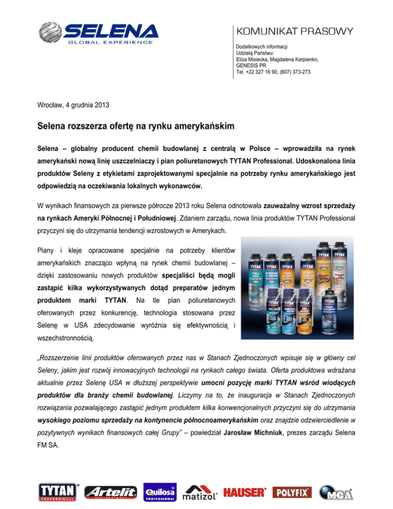 Dodatkowych informacji Udzielą Państwu: Eliza Misiecka, Magdalena Karpienko, GENESIS PR Tel. +22 327 16 90, (607) 373-273 Wrocław, 4 grudnia 2013 Selena rozszerza ofertę na rynku amerykańskim Selena – globalny producent chemii budowlanej z centralą w Polsce – wprowadziła na rynek amerykański nową linię uszczelniaczy i pian poliuretanowych TYTAN Professional. Udoskonalona linia produktów Seleny z etykietami zaprojektowanymi specjalnie na potrzeby rynku amerykańskiego jest odpowiedzią na oczekiwania lokalnych wykonawców. W wynikach finansowych za pierwsze półrocze 2013 roku Selena odnotowała zauważalny wzrost sprzedaży na rynkach Ameryki Północnej i Południowej. Zdaniem zarządu, nowa linia produktów TYTAN Professional przyczyni się do utrzymania tendencji wzrostowych w Amerykach. Piany i kleje opracowane specjalnie na potrzeby klientów amerykańskich znacząco wpłyną na rynek chemii budowlanej – dzięki zastosowaniu nowych produktów specjaliści będą mogli zastąpić kilka wykorzystywanych dotąd preparatów jednym produktem marki TYTAN. Na tle pian poliuretanowych oferowanych przez konkurencję, technologia stosowana przez Selenę w USA zdecydowanie wyróżnia się efektywnością i wszechstronnością. „Rozszerzenie linii produktów oferowanych przez nas w Stanach Zjednoczonych wpisuje się w główny cel Seleny, jakim jest rozwój innowacyjnych technologii na rynkach całego świata. Oferta produktowa wdrażana aktualnie przez Selenę USA w dłuższej perspektywie umocni pozycję marki TYTAN wśród wiodących produktów dla branży chemii budowlanej. Liczymy na to, że inauguracja w Stanach Zjednoczonych rozwiązania pozwalającego zastąpić jednym produktem kilka konwencjonalnych przyczyni się do utrzymania wysokiego poziomu sprzedaży na kontynencie północnoamerykańskim oraz znajdzie odzwierciedlenie w pozytywnych wynikach finansowych całej Grupy” – powiedział Jarosław Michniuk, prezes zarządu Selena FM SA. Dodatkowych informacji Udzielą Państwu: Eliza Misiecka, Magdalena Karpienko, GENESIS PR Tel. +22 327 16 90, (607) 373-273 Globalny charakter aktywności Grupy Selena, która obecna jest w ponad 70 krajach świata, wymaga dostosowania oferty do specyfiki poszczególnych rynków. Selena kładzie duży nacisk na budowanie przewagi konkurencyjnej Grupy w oparciu o nowe pomysły oraz niespotykane rozwiązania technologiczne. Obecnie działalność R&D Seleny prowadzona jest w Polsce, Hiszpanii, Turcji i Chinach. W czerwcu spółka otrzymała ze środków unijnych dofinansowane projektu modernizacji centrum badawczo-rozwojowego Selena Labs (dawniej Research Centre of Construction Technology RCCT). „Wiążemy ogromne nadzieje z linią produktów Smart Foam. Liczymy na to, że specjaliści decydujący się na nasze piany nie tylko osiągną lepszą wydajność pracy, lecz również zaoszczędzą czas i pieniądze. Dostarczamy na rynek produkty wysokiej jakości i jesteśmy przekonani, że także przyczynimy się do wzbogacenia doświadczeń branży chemii budowlanej na całym świecie” – powiedział Wade Rector, prezes Seleny USA. TYTAN to kluczowa marka w portfolio Seleny. Sygnowane są nią produkty najwyższej klasy – m.in. kleje, uszczelniacze i piany – skierowane do profesjonalistów i przeznaczone do prac budowlanych oraz wykończeniowych. Marka TYTAN sprzedawana jest aktualnie na trzech kontynentach, w kilkudziesięciu państwach. Na wielu rynkach jest jednym z liderów w swoich grupach produktowych. Informacje dodatkowe: Grupa Selena to globalny producent i dystrybutor chemii budowlanej. Selena oferuje szeroką gamę produktów przeznaczonych zarówno dla profesjonalnych wykonawców, jak i użytkowników indywidualnych – główne marki to TYTAN, ARTELIT oraz hiszpańska QUILOSA. Selena jest jednym z trzech największych światowych producentów piany poliuretanowej używanej do montażu okien i drzwi. Grupa w swojej ofercie posiada piany, uszczelniacze, kleje, produkty do hydroizolacji, systemy ociepleń, zamocowania oraz produkty komplementarne. Dodatkowych informacji Udzielą Państwu: Eliza Misiecka, Magdalena Karpienko, GENESIS PR Tel. +22 327 16 90, (607) 373-273 W skład Grupy wchodzi 30 spółek w 18 krajach na całym świecie. Zakłady produkcyjne Seleny są zlokalizowane w Polsce, Brazylii, Korei, Chinach, Rumunii, Turcji oraz w Hiszpanii. Globalne doświadczenia zdobywane na wielu różnych rynkach pozwalają Grupie Selena szybko się rozwijać. Dzięki nim Selena staje się firmą innowacyjną i kreuje nowe rozwiązania dostosowane do potrzeb użytkowników. Grupa Selena była wielokrotnie nagradzana w najbardziej prestiżowych rankingach. Otrzymała m.in. tytuły: Diamentu Forbesa oraz Perły Polskiej Gospodarki. Najwyższa jakość produktów Grupy Selena oraz ich nowoczesność cieszą się uznaniem partnerów i klientów firmy, o czym mogą świadczyć liczne nagrody, jakimi spółka jest honorowana. Od kwietnia 2008 akcje spółki holdingowej Grupy – Selena FM SA – notowane są na Giełdzie Papierów Wartościowych w Warszawie. Więcej informacji o spółce na www.selena.com