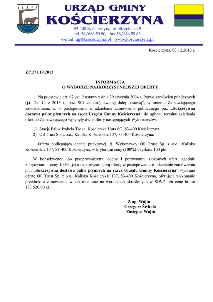 83-400 Kościerzyna, ul. Strzelecka 9 tel. 58/686 59 80, fax 58/686 59 83 e-mail: [email protected] www.koscierzyna.pl Kościerzyna, 03.12.2013 r. ZP.271.19.2013 INFORMACJA O WYBORZE NAJKORZYSTNIEJSZEJ OFERTY Na podstawie art. 92 ust. 2 ustawy z dnia 29 stycznia 2004 r. Prawo zamówień publicznych (j.t. Dz. U. z 2013 r., poz. 907 ze zm.), zwanej dalej „ustawą”, w imieniu Zamawiającego zawiadamiam, iż w postępowaniu o udzielenie zamówienia publicznego pn.: „Sukcesywna dostawa paliw płynnych na rzecz Urzędu Gminy Kościerzyna” do upływu terminu składania ofert do Zamawiającego wpłynęły dwie oferty następujących Wykonawców: 1) Stacja Paliw Izabela Troka, Kościerska Huta 6G, 83-400 Kościerzyna, 2) Oil Trust Sp. z o.o., Kaliska Kościerskie 137, 83-400 Kościerzyna. Oferta podlegająca ocenie punktowej, tj. Wykonawcy Oil Trust Sp. z o.o., Kaliska Kościerskie 137, 83-400 Kościerzyna, w kryterium ceny (100%) uzyskała 100 pkt. W konsekwencji, po przeprowadzeniu oceny i porównaniu złożonych ofert, zgodnie z kryterium – ceny 100%, jako najkorzystniejszą ofertę w postępowaniu o udzielenie zamówienia pn.: „Sukcesywna dostawa paliw płynnych na rzecz Urzędu Gminy Kościerzyna” wybrano ofertę Oil Trust Sp. z o.o., Kaliska Kościerskie 137, 83-400 Kościerzyna, oferującą wykonanie przedmiotu zamówienia w zakresie oraz na warunkach określonych w SIWZ za cenę brutto 173 520,00 zł. Z up. Wójta Grzegorz Świtała Zastępca Wójta