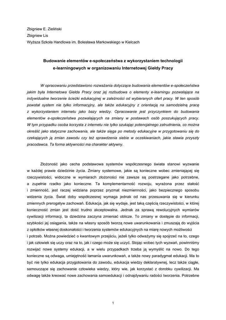 Zbigniew E. Zieliński Zbigniew Lis Wyższa Szkoła Handlowa im. Bolesława Markowskiego w Kielcach Budowanie elementów e-społeczeństwa z wykorzystaniem technologii e-learningowych w organizowaniu Internetowej Giełdy Pracy W opracowaniu przedstawiono rozważania dotyczące budowania elementów e-społeczeństwa jakim była Internetowa Giełda Pracy oraz jej rozbudowa o elementy e-learningu pozwalające na indywidualne tworzenie ścieżki edukacyjnej w zależności od wybieranych ofert pracy. W ten sposób powstał system nie tylko informacyjny, ale także edukacyjny z orientacją na samodzielną pracę z wykorzystaniem internetu jako bazy wiedzy. Opracowanie jest przyczynkiem do budowania elementów e-społeczeństwa pozwalających na zmiany w postawach osób poszukujących pracy. W tym przypadku osoba korzysta z internetu nie tylko szukając potencjalnego zatrudnienia, co można określić jako statyczne zachowania, ale także sięga po metody edukacyjne w przygotowaniu się do czekających ją zmian zawodu czy też sprawdzenia siebie w oczekiwaniach, jakie stawia przyszły pracodawca. Ta forma aktywności ma charakter aktywny. Złożoność jako cecha podstawowa systemów współczesnego świata stanowi wyzwanie w każdej prawie dziedzinie życia. Zmiany systemowe, jakie są konieczne wobec zmieniającej się rzeczywistości, widoczne w wymiarach złożoności nie zawsze są postrzegane jako potrzebne, a zupełnie rzadko jako konieczne. Ta komplementarność rozwoju, wyrażona przez stałość i zmienność, jest raczej widziana poprzez pryzmat niezmienności, jako bezpiecznego sposobu widzenia życia. Świat doby współczesnej wymaga jednak od nas przesuwania się w kierunku zmiennych prerogatyw zachowań. Edukacja, jak się wydaje, jest taką częścią rzeczywistości, w której konieczność zmian jest dość trudno akceptowalna. Jednak za sprawą rewolucyjnych wymiarów cywilizacji informacji, ta dziedzina zaczyna zmieniać oblicze. To zmiany w dostępie do informacji, szybkości jej osiągania, także na własny sposób tworzą nowe uwarunkowania i zmuszają do wyjścia z opłotków własnej doskonałości i tworzenia systemów edukacyjnych na miarę nowych możliwości i potrzeb. Można powiedzieć o kwantowym przejściu, jeżeli tylko odważymy się spojrzeć na to, czego i jak człowiek się uczy oraz na to, jak i czego może się uczyć. Stojąc wobec tych wyzwań, powinniśmy rozwijać nowe systemy edukacji, a w wielu przypadkach trzeba ją wymyślić na nowo. Do tego konieczne są odwaga, umiejętność łamania uwarunkowań, a także nowy paradygmat edukacji. Ma to być nie tylko edukacja przygotowania do zawodu, edukacja wiedzy deklaratywnej, lecz także ciągłe, samouczące się zachowanie człowieka wiedzy, który wie, jak korzystać z dorobku cywilizacji. Ma odwagę także kreować nowe zachowania samoedukacji i odnajdywaniu radości tworzenia. Potrzebne 1 jest łamanie reguł i granic wytworzonych przez rewolucję naukowo-techniczną oraz poszukiwanie nowego wyrazu dla dzisiejszej rewolucji informacji1. Wielowymiarowość zachowań dzisiejszych społeczeństw widoczna jest w każdym przekroju ich organizacji. Możliwości, jakie rodzi rewolucja informacji, sprawiają, że społeczeństwa nabierają charakteru dynamicznego, samoorganizującego się. Rodzą się programy e-społeczństwo, e-gospodarka, e-infrastruktura i inne. Wszystkie one w pierwszej odsłonie mówią o sieci wymiany informacji, wykorzystaniu zasobów baz wiedzy i doświadczenia oraz tworzeniu warunków do kreowania postaw twórczych. Dzisiaj dziedziczymy wiele pojęć i zachowań, które rodziły się, gdy warunki organizacji społeczeństw były nieporównywalnie inne niż obecnie. Dzisiaj mówiąc o pracy coraz częściej wyobrażamy ją sobie jako pracę na odległość, indywidualne organizowanie warsztatu pracy itd. Tworzenie elementów e-społeczenstwa wymaga wielowymiarowych zachowań. Można mówić o ich kierunku np. „z góry na dół” − rząd tworzący odpowiednie programy i akty, ale też „z dołu do góry” − obywatel rozpoczynający świadomy udział w tej hiperprzestrzeni informacyjnej2. Może to być „praca od podstaw” w zakresie przeobrażania zachowań obywatela na rynku pracy i administracji. W opracowaniu przedstawiono proces budowania elementów e-społeczeństwa, za jakie uznano Internetową Giełdę Pracy z rozbudową o technologię e-learningowe. W zamiarze autorów powstała platforma informacyjno-edukacyjna ze zwróceniem uwagi na aktywność w czasie rzeczywistym i indywidualność uczestnika giełdy. Takie zestawienie technologii informatycznych tworzy system, w którym poszukujący pracy − wykładowca − otoczenie budują wielowymiarowy kontinuum, warunków, w których pojawiać się mogą samodzielne działania zmierzające do tworzenia swojego warsztatu pracy. Istotnego znaczenia nabiera tutaj komunikacja − nie tylko w szukaniu informacji, ale także w przekształcaniu swoich umiejętności zawodowych. Technologie wykorzystywane w tworzeniu infastruktury e-społeczeństwa Technologia została zdominowana przez dwa rodzaje ludzi: tych co rozumieją to czym nie są w stanie zarządzać i tych którzy zarządzają tym czego nie rozumieją3. Obecny przełom technologiczny jest związany z istnieniem gospodarki opartej na wiedzy, która stała się strategicznym elementem w działalności organizacji, podmiotów gospodarczych, edukacyjnych czy administracji. Kapitał intelektualny ma kluczowe znaczenie w rozwoju organizacji i jest głównym czynnikiem sukcesu, co ma wpływ na zmienność otoczenia i coraz silniejszą konkurencję. Zastosowanie technologii informatycznych intensyfikuje działania organizacji funkcjonujących w wirtualnej przestrzeni w oparciu o elektroniczną gospodarkę i posiadających wykwalifikowaną kadrę. Podstawą istnienia i rozwoju idei społeczeństwa wiedzy jest społeczeństwo wykształcone, mające wysokie kwalifikacje, 