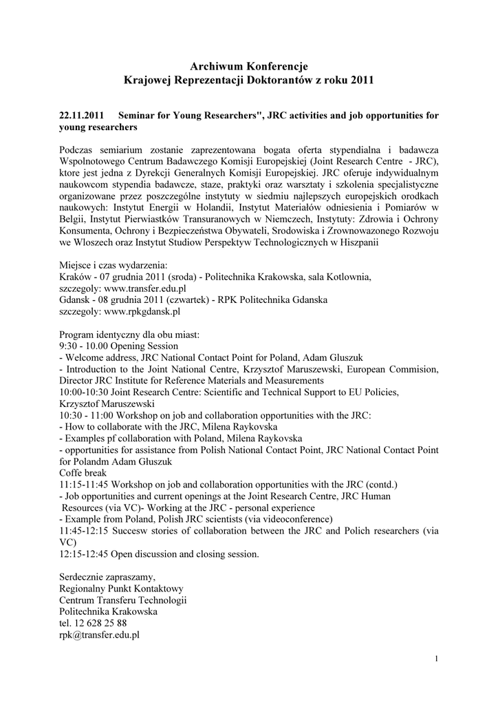 Archiwum Konferencje Krajowej Reprezentacji Doktorantów z roku 2011 22.11.2011 Seminar for Young Researchers", JRC activities and job opportunities for young researchers Podczas semiarium zostanie zaprezentowana bogata oferta stypendialna i badawcza Wspolnotowego Centrum Badawczego Komisji Europejskiej (Joint Research Centre - JRC), ktore jest jedna z Dyrekcji Generalnych Komisji Europejskiej. JRC oferuje indywidualnym naukowcom stypendia badawcze, staze, praktyki oraz warsztaty i szkolenia specjalistyczne organizowane przez poszczególne instytuty w siedmiu najlepszych europejskich orodkach naukowych: Instytut Energii w Holandii, Instytut Materiałów odniesienia i Pomiarów w Belgii, Instytut Pierwiastków Transuranowych w Niemczech, Instytuty: Zdrowia i Ochrony Konsumenta, Ochrony i Bezpieczeństwa Obywateli, Srodowiska i Zrownowazonego Rozwoju we Wloszech oraz Instytut Studiow Perspektyw Technologicznych w Hiszpanii Miejsce i czas wydarzenia: Kraków - 07 grudnia 2011 (sroda) - Politechnika Krakowska, sala Kotlownia, szczegoly: www.transfer.edu.pl Gdansk - 08 grudnia 2011 (czwartek) - RPK Politechnika Gdanska szczegoly: www.rpkgdansk.pl Program identyczny dla obu miast: 9:30 - 10.00 Opening Session - Welcome address, JRC National Contact Point for Poland, Adam Gluszuk - Introduction to the Joint National Centre, Krzysztof Maruszewski, European Commision, Director JRC Institute for Reference Materials and Measurements 10:00-10:30 Joint Research Centre: Scientific and Technical Support to EU Policies, Krzysztof Maruszewski 10:30 - 11:00 Workshop on job and collaboration opportunities with the JRC: - How to collaborate with the JRC, Milena Raykovska - Examples pf collaboration with Poland, Milena Raykovska - opportunities for assistance from Polish National Contact Point, JRC National Contact Point for Polandm Adam Głuszuk Coffe break 11:15-11:45 Workshop on job and collaboration opportunities with the JRC (contd.) - Job opportunities and current openings at the Joint Research Centre, JRC Human Resources (via VC)- Working at the JRC - personal experience - Example from Poland, Polish JRC scientists (via videoconference) 11:45-12:15 Succesw stories of collaboration between the JRC and Polich researchers (via VC) 12:15-12:45 Open discussion and closing session. Serdecznie zapraszamy, Regionalny Punkt Kontaktowy Centrum Transferu Technologii Politechnika Krakowska tel. 12 628 25 88 [email protected] 1 ----------------------------------------------------------------------------------------------------------------21.11.2011 Bo to zła kobieta była... Hetery, prostytutki, wariatki- kulturowy obraz kobiety KOŁO NAUKOWE HISTORYKÓW SZTUKI UNIWERSYTETU ŁÓDZKIEGO SEKCJA DAWNA ZAPRASZA studentów i doktorantów wszystkich kierunków do udziału w sesji naukowej Bo to zła kobieta była... Hetery, prostytutki, wariatkikulturowy obraz kobiety. która odbędzie się w Katedrze Historii Sztuki Uniwersytetu Łódzkiego 9 grudnia 2011 roku Chętnych do przedstawienia 20-minutowego referatu prosimy o przesłanie zgłoszenia oraz proponowanego tematu wystąpienia do 20 listopada 2011 r. na adres: [email protected] Opłata konferencyjna wynosi 80 zł (płatne do 30.11.2011 r.) Teksty do publikacji w formie elektronicznej należy przesłać na adres mailowy do 5.12.2011 r. wraz z opinią pracownika naukowego. Formularz zgłoszeniowy ----------------------------------------------------------------------------------------------------------------21.11.2011 Zanurzeni w Historii – Zanurzeni w Kulturze Literatura czasów PRL-u o PRL-u Wydział Filologiczny Uniwersytetu Pedagogicznego im. Komisji Edukacji Narodowej w Krakowie oraz Śródmiejski Ośrodek Kultury w Krakowie mają zaszczyt zaprosić Państwa do udziału w III Ogólnopolskiej Konferencji 2aukowej Zanurzeni w Historii – Zanurzeni w Kulturze Literatura czasów PRL-u o PRL-u Miejsce obrad: Śródmiejski Ośrodek Kultury w Krakowie, ul. Mikołajska 2 Imprezy towarzyszące: Śródmiejski Ośrodek Kultury w Krakowie, ul. Mikołajska 2 Termin: 24–25 listopada 2011 roku Planowana Konferencja będzie już trzecią z cyklu Zanurzeni w Historii – Zanurzeni w Kulturze. 2 Zależy nam, aby prezentowane referaty były jak najszerszym, interdyscyplinarnym spojrzeniem na twórczość literacką (prozę, poezję, dramat) powstałą od zakończenia II wojny światowej do transformacji 1989 roku. Pragniemy zobrazować wydarzenia kilku poprzednich dekad – od kształtowania się nowych warunków w drugiej połowie lat 40., poprzez fazę realizmu socjalistycznego, tzw. małą stabilizację, epokę Gierka… aż do pierwszej „Solidarności” 1980/81, stanu wojennego, po koniec lat 80. Wśród poruszanych zagadnień powinny się znaleźć również te dotyczące sposobów kształtowania bohaterów, ukazywania życia w PRL-u, obciążonego często ciągłymi wyborami „mniejszego zła” oraz „chodzenia na kompromisy". Wartym zastanowienia może okazać się problem dotyczący uznania ówczesnych utworów za mniej lub bardziej rzetelne źródła historyczne które wszak utrwalały w świadomości zbiorowej społeczeństwa pewien sposób myślenia, pewną „politykę historyczną”. ----------------------------------------------------------------------------------------------------------------08.11.2011 Funkcjonowanie współczesnych młodych ludzi w zmieniającym się świecie Instytut Psychologii Uniwersytetu Kazimierza Wielkiego w Bydgoszczy ma zaszczyt zaprosić Państwa do udziału w II Interdyscyplinarnej Konferencji Doktorantów "Funkcjonowanie współczesnych młodych ludzi w zmieniającym się świecie" pod patronatem Prezydenta Miasta Bydgoszczy Rafała Bruskiego oraz JM Rektora UKW prof. Józefa Kubika, która odbędzie się w dniach 1-3 marca 2012 r. w Bydgoszczy. http://wspolczesnarodzina.pl/komunikaty/witaj-swiecie ----------------------------------------------------------------------------------------------------------------17.10.2011 ICSB