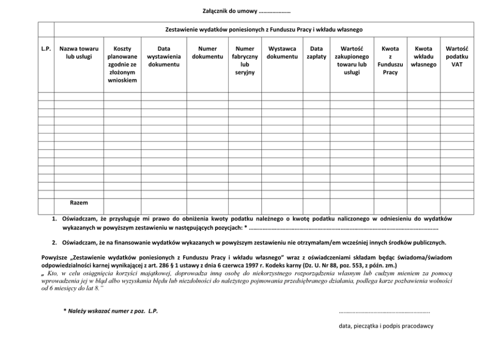Załącznik do umowy ………………… Zestawienie wydatków poniesionych z Funduszu Pracy i wkładu własnego L.P. Nazwa towaru lub usługi Koszty planowane zgodnie ze złożonym wnioskiem Data wystawienia dokumentu Numer dokumentu Numer fabryczny lub seryjny Wystawca dokumentu Data zapłaty Wartość zakupionego towaru lub usługi Kwota z Funduszu Pracy Kwota wkładu własnego Wartość podatku VAT Razem 1. Oświadczam, że przysługuje mi prawo do obniżenia kwoty podatku należnego o kwotę podatku naliczonego w odniesieniu do wydatków wykazanych w powyższym zestawieniu w następujących pozycjach: * ……………………………………………………………………………………………………………. 2. Oświadczam, że na finansowanie wydatków wykazanych w powyższym zestawieniu nie otrzymałam/em wcześniej innych środków publicznych. Powyższe „Zestawienie wydatków poniesionych z Funduszu Pracy i wkładu własnego” wraz z oświadczeniami składam będąc świadoma/świadom odpowiedzialności karnej wynikającej z art. 286 § 1 ustawy z dnia 6 czerwca 1997 r. Kodeks karny (Dz. U. Nr 88, poz. 553, z późn. zm.) „ Kto, w celu osiągnięcia korzyści majątkowej, doprowadza inną osobę do niekorzystnego rozporządzenia własnym lub cudzym mieniem za pomocą wprowadzenia jej w błąd albo wyzyskania błędu lub niezdolności do należytego pojmowania przedsiębranego działania, podlega karze pozbawienia wolności od 6 miesięcy do lat 8.” * Należy wskazać numer z poz. L.P. …..……………………………………………….. data, pieczątka i podpis pracodawcy