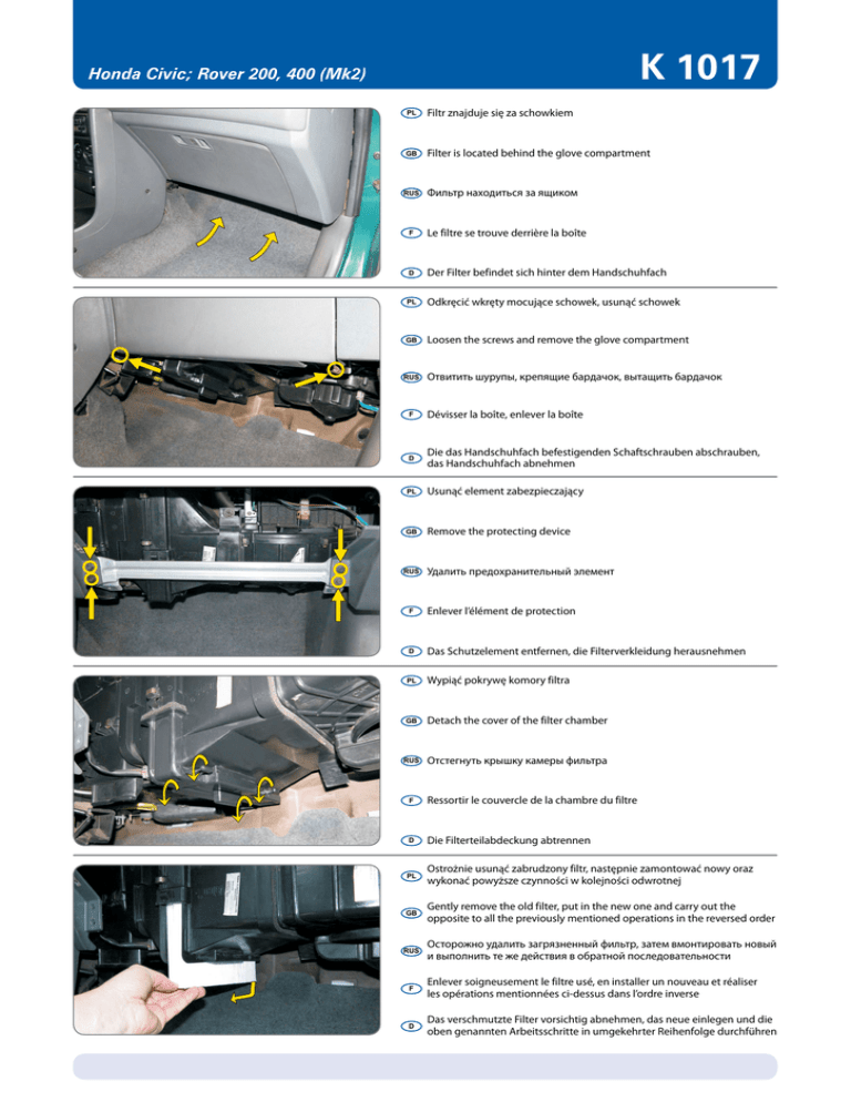 K 1017 Honda Civic; Rover 200, 400 (Mk2) PL Filtr znajduje się za schowkiem GB Filter is located behind the glove compartment RUS Фильтр находиться за ящиком F Le filtre se trouve derrière la boîte D Der Filter befindet sich hinter dem Handschuhfach PL Odkręcić wkręty mocujące schowek, usunąć schowek GB Loosen the screws and remove the glove compartment RUS Отвитить шурупы, крепящие бардачок, вытащить бардачок F Dévisser la boîte, enlever la boîte D Die das Handschuhfach befestigenden Schaftschrauben abschrauben, das Handschuhfach abnehmen PL Usunąć element zabezpieczający GB Remove the protecting device RUS Удалить предохранительный элемент F Enlever l’élément de protection D Das Schutzelement entfernen, die Filterverkleidung herausnehmen PL Wypiąć pokrywę komory filtra GB Detach the cover of the filter chamber RUS Отстегнуть крышку камеры фильтра F Ressortir le couvercle de la chambre du filtre D Die Filterteilabdeckung abtrennen PL Ostrożnie usunąć zabrudzony filtr, następnie zamontować nowy oraz wykonać powyższe czynności w kolejności odwrotnej GB Gently remove the old filter, put in the new one and carry out the opposite to all the previously mentioned operations in the reversed order RUS Осторожно удалить загрязненный фильтр, затем вмонтировать новый и выполнить те же действия в обратной последовательности F Enlever soigneusement le filtre usé, en installer un nouveau et réaliser les opérations mentionnées ci-dessus dans l’ordre inverse D Das verschmutzte Filter vorsichtig abnehmen, das neue einlegen und die oben genannten Arbeitsschritte in umgekehrter Reihenfolge durchführen