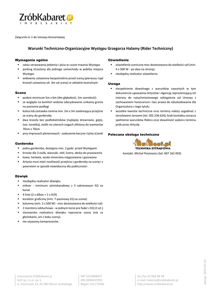 Załącznik nr 1 do Umowy Koncertowej Warunki Techniczno-Organizacyjne Występu Grzegorza Halamy (Rider Techniczny) Wymagania ogólne zakaz serwowania jedzenia i picia w czasie trwania Występu parking strzeżony dla jednego samochodu w pobliżu miejsca Występu widownia ustawiona bezpośrednio przed sceną (pierwszy rząd krzeseł ustawiony ok. 3m od sceny) w układzie teatralnym Scena podest minimum 5m x 6m (4m głębokość, 5m szerokość) ze względu na komfort widzów zdecydowanie unikamy grania na poziomie podłogi kulisa lub zastawka ciemna min. 2m x 3m zasłaniająca przejście ze sceny do garderoby dwa krzesła bez podłokietników (najlepiej drewniane, gięte, tzw. tonetka), stolik na czterech nogach zbliżony do wymiarów 70cm x 70cm przy imprezach plenerowych - zadaszenie boczne i tylne ścianki Garderoba jedna garderoba, dostępna min. 2 godz. przed Występem krzesła dla 3 osób, wieszaki, stół, lustro, deska do prasowania kawa, herbata, woda mineralna niegazowana i gazowana Artysta musi mieć możliwość przejścia z garderoby na scenę i z powrotem w sposób niewidoczny dla publiczności Oświetlenie oświetlenie sceniczne moc dostosowana do wielkości sali (min. 4 x 500 W - po dwa na stronę). niezbędny realizator oświetlenia Uwaga niespełnienie dowolnego z warunków zawartych w tym dokumencie upoważnia Artystów i Agencję reprezentującą ich interesy do natychmiastowego odstąpienia od Umowy z zachowaniem honorarium i bez prawa do odszkodowania dla Organizatora z tego tytułu wszelkie kwestie techniczne oraz terminy należy uzgadniać z Jarosławem Jarosem (tel. 502 236 624); brak kontaktu oznacza spełnienie warunków Ridera oraz dowolność wyboru terminu prób przez Artystę Polecana obsługa techniczna kontakt: Michał Piastowicz (tel. 607 162 692) Impresariat ZróbKabaret.pl GnP sp. z o.o. sp. k. ul. Kościuszki 23, 05-082 Blizne Jasińskiego NIP 5222868457 KRS 0000437095 Regon 141172460 tel./fax 22 666 98 38 e-mail: [email protected] http://www.zrobkabaret.pl wersja: 2015-07-23 Dźwięk niezbędny realizator dźwięku mikser - minimum ośmiokanałowy z 3 zakresowym EQ na kanał. 4 linie (2 x dibox + 2 x XLR) korektor graficzny (min. 7-pasmowy EQ na sumie) kolumny (min. 2 x 500 W) - moc dostosowana do wielkości sali. 2 monitory odsłuchowe - w jednym torze pre fader z EQ (2 szt.) stanowisko realizatora dźwięku naprzeciw sceny (nie za głośnikami, ani z boku sceny). nie używamy kompresorów.