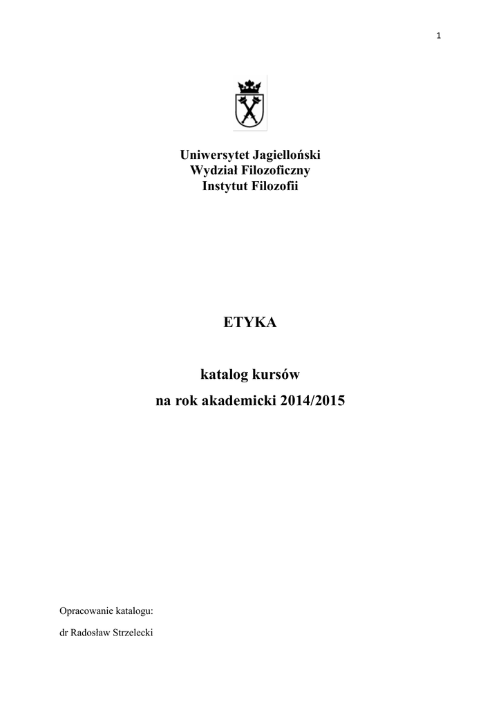 1 Uniwersytet Jagielloński Wydział Filozoficzny Instytut Filozofii ETYKA katalog kursów na rok akademicki 2014/2015 Opracowanie katalogu: dr Radosław Strzelecki 2 Spis treści Plan studiów na kierunku etyka 4 Zestawienie kursów fakultatywnych na kierunku etyka 8 Opis kursów według dziedzin Informacja o kodach komputerowych 10 Etyka (1) Wprowadzenie do etyki (2) Metaetyka (3) Etyka odpowiedzialności (4) Etyka a czas (5) Wątki etyczne w literaturze pięknej (6) Zło. Analiza zjawiska (7) Etyka Wschodu (8) Samopoznanie i odpowiedzialność 11 13 15 16 19 20 22 24 Podstawy filozofii (9) Wprowadzenie do filozofii (10) Wprowadzenie do logiki klasycznej (11) Metafizyka (12) Teoria poznania (13) Filozofia wartości (14) Piękno a dobro – relacje etyki z estetyką (15) Elementy logiki praktycznej 28 30 32 34 35 37 39 Historia etyki i filozofii (16) (17) (18) (19) Historia etyki (z elementami historii filozofii) – starożytność Historia etyki (z elementami historii filozofii) – średniowiecze Historia etyki (z elementami historii filozofii) – XV – XVII wiek Historia etyki (z elementami historii filozofii) – XVIII – XX wiek 42 46 51 54 3 (20) (21) Teoria przyjaźni u Arystotelesa Polska myśl etyczna 56 59 Antropologia filozoficzna i filozofia społeczna (22) (23) (24) (25) Filozofia społeczna Antropologia filozoficzna Prawo a moralność – współczesne dylematy Dylematy moralne we współczesnej polityce 62 66 68 70 Etyka szczegółowa (26) (27) (28) (29) Bioetyka Etyka biznesu Etyka środowiskowa Etyka mediów 73 75 77 78 Psychologia 81 Różne (30) Plan studiów I stopnia na kierunku etyka 4 I ROK STUDIÓW: I semestr O/F Nazwa modułu kształcenia Rodzaj zajęć dydaktycznych Forma zaliczenia Liczba godzin (obligatoryjny lub fakultatywny) (egzamin czy zaliczenie) 1. Historia etyki Wykład (z elementami historii i ćwiczenia filozofii) - Starożytność O Egzamin 60 6 2. Wprowadzenie do etyki Wykład i ćwiczenia O Egzamin 60 6 3. Wprowadzenie filozofii do Wykład i ćwiczenia O Egzamin 60 6 4. Wprowadzenie do logiki Wykład klasycznej i ćwiczenia O Egzamin testowy 60 6 0-90 0-9 Lp 5. Różne Kursy filozoficzno- rodzaje etyczne nieobligatoryjne (wykład monograficzny, z oferty Instytutu Filozofii wykład z ćwiczeniami, UJ seminarium, ECTS Różne formy (egzamin ustny, egzamin testowy, zaliczenie na ocenę, prezentacja rezultatów projektu) F konwersatorium) Łączna liczba godzin: min. 240 – max. 330 Łączna liczba punktów ECTS: min. 24 – max. 33 II semestr: O/F Lp Nazwa modułu kształcenia Rodzaj zajęć dydaktycznych (obligatoryjny lub fakultatywny) Forma zaliczenia (egzamin czy zaliczenie) Liczba godzin ECTS 1. Historia etyki Wykład (z elementami historii i ćwiczenia filozofii) - Średniowiecze O Egzamin 60 6 2. Psychologia Wykład i ćwiczenia O Egzamin 60 6 3. Piękno a dobro – relacje Wykład etyki z estetyką i ćwiczenia O Egzamin 60 6 4. Filozofia społeczna Wykład i ćwiczenia O Egzamin 60 6 5 5. 6. ECDL - Technologia Laboratorium O informacyjna komputerowe Zaliczenie na ocenę Różne Kursy filozoficzno- rodzaje (wykład etyczne nieobligatoryjne monograficzny, F z oferty Instytutu wykład z ćwiczeniami, Filozofii UJ seminarium, Różne formy (egzamin ustny, egzamin testowy, zaliczenie na ocenę, prezentacja rezultatów projektu) konwersatorium) 30 3 0-90 0-9 Łączna liczba godzin: min. 270 – max. 360 Łączna liczba punktów ECTS: min. 27 – max. 36 Oznacza to, że studenci powinni uzyskać na pierwszym roku studiów 51 punktów ECTS za kursy obligatoryjne, przypisane do odpowiedniego semestru i minimum 9 punktów ECTS za kursy nieobligatoryjne w ciągu całego roku. Łącznie studenci po pierwszym roku studiów powinni uzyskać minimum 60 punktów ECTS. II ROK STUDIÓW: III semestr: O/F Lp Nazwa modułu kształcenia Rodzaj zajęć dydaktycznych (obligatoryjny lub fakultatywny) Forma zaliczenia (egzamin czy zaliczenie) Liczba godzin ECTS 1. Historia etyki Wykład z elementami historii i ćwiczenia filozofii – XV-XVII w. O Egzamin 60 6 2. Filozofia poznania Wykład i ćwiczenia O Egzamin 60 6 3. Antropologia filozoficzna Wykład i ćwiczenia O Egzamin 60 6 4. Język nowożytny poziom Lektorat B2 O Zaliczenie 30 0 120 12 5. Różne Kursy filozoficzno- rodzaje etyczne z oferty Instytutu (wykład monograficzny, Filozofii UJ lub wykład z ćwiczeniami, pozainstytutowe seminarium, konwersatorium) Różne formy (egzamin F ustny, egzamin testowy, zaliczenie na ocenę, prezentacja rezultatów projektu Łączna liczba godzin: 330 Łączna liczba punktów ECTS: 30 IV semestr: 6 O/F Lp Nazwa modułu kształcenia Rodzaj zajęć dydaktycznych (obligatoryjny lub fakultatywny) Forma zaliczenia (egzamin czy zaliczenie) Liczba godzin ECTS 1. Historia etyki Wykład z elementami historii i ćwiczenia filozofii – XVIII-XX w. O Egzamin 60 6 2. Metafizyka Wykład i ćwiczenia O Egzamin 60 6 3. Bioetyka Wykład i ćwiczenia O Egzamin 60 6 4. Język nowożytny poziom Lektorat B2 O Zaliczenie 30 0 120 12 5. Różne Kursy filozoficzno- rodzaje etyczne z oferty Instytutu (wykład monograficzny, Filozofii UJ lub wykład z ćwiczeniami, pozainstytutowe seminarium, Różne formy (egzamin ustny, egzamin testowy, zaliczenie na ocenę, prezentacja rezultatów projektu F konwersatorium) Łączna liczba godzin: 330 Łączna liczba punktów ECTS: 30 III ROK STUDIÓW: V semestr: O/F Lp Nazwa modułu kształcenia Rodzaj zajęć dydaktycznych (obligatoryjny lub fakultatywny) Forma zaliczenia (egzamin czy zaliczenie) Liczba godzin ECTS 1. Filozofia wartości Wykład i ćwiczenia O Egzamin 60 6 2. Etyka środowiskowa Wykład i ćwiczenia O Egzamin 60 6 3. Język nowożytny poziom Lektorat B2 O Zaliczenie 30 0 4. Kursy filozoficzno- Różne etyczne z oferty Instytutu rodzaje Filozofii lub (wykład monograficzny, pozainstytutowe, w tym wykład ćwiczeniami, jedno seminarium i co zseminarium, 0-240 0-24 Różne formy (egzamin F ustny, egzamin testowy, zaliczenie na ocenę, prez