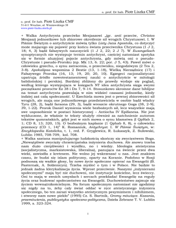 o. prof. Dr hab. Piotr Liszka CMF o. prof. Dr hab. Piotr Liszka CMF 51-611 Wrocław, ul. Wieniawskiego 38 www.piotr-liszka.strefa.pl + Walka Antychrysta przeciwko Mesjaszowi „(gr. anti przeciw, Christos Mesjasz) jednostkowe lub zbiorowe określenie sił wrogich Chrystusowi. I. W Piśmie Świętym o antychryście mówią tylko Listy Jana Apostoła, co dotyczyć może mającego się pojawić przy końcu świata przeciwnika Chrystusa (1 J 2, 18; 4, 3) bądź fałszywych nauczycieli (1 J 2, 22; 2 J 7). W Ewangeliach synoptycznych nie występuje termin antychryst, częściej natomiast spotyka się w formie aluzyjnej pojęcie antychrysta, gdy mówią oni o pseudoChrystusie i pseudo-Proroku (np. Mk 13, 6. 22; por. J 5, 43). Paweł mówi o człowieku grzechu, o synu zatracenia, o przeciwniku, niegodziwym (2 Tes 2, 3-8). Apokalipsa wspomina 2 Bestie (13, 1-18), Wielką Nierządnicę (17) i Fałszywego Proroka (16, 13; 19, 20; 20, 10). Egzegeci racjonalistyczni upatrują źródło nowotestamentowej nauki o antychryście w mitologii babilońskiej i perskiej. Bardziej zbliżony do prawdy wydaje się pogląd, według którego występująca w księgach NT idea antychrysta sięga swymi początkami proroctw Ez 38 i Dn 7, 9-14. Stosunkowo skromne dane biblijne na temat antychrysta pozwalają w nim widzieć czasami jednostkę, kiedy indziej zaś całą społeczność. U Ezechiela mowa jest o pewnej zbiorowości sił wrogich, ale mają one jednostkowego przedstawiciela w osobie bądź władcy Tyru (28, 2), bądź faraona (29, 3), bądź wreszcie okrutnego Goga (38, 2-9); 39, 1-22). Prorok Daniel wymienia wiele bezbożnych sił, lecz wszystkie mają swe usposobienie w postaci historycznej – Antiocha IV Epifanesa. Nie jest wykluczone, że właśnie te teksty służyły również za natchnienie autorom tekstów qumrańskich, gdyż jest w nich mowa o synu kłamstwa (I QpHab 2, 1; CD 8, 13; 320, 15). O bezbożnym kapłanie (1 Qphab 8, 8), o człowieku przemocy (CD 1, 14)” K. Romaniuk, Antychryst. I. W Piśmie Świętym, w: Encyklopedia Katolicka, t. 1, red. F. Gryglewicz, R. Łukaszyk, Z. Sułowski, Lublin 1985, 708-709, kol. 708. + Walka szatana manipulującego ludzkością skończy się zwycięstwem Boga. „Niewątpliwie zwycięży chrześcijańska inżynieria duchowa. Ale znowu trzeba nam dużo cierpliwości i wysiłku, no i wiedzy. Ideologia ateistyczna (socjalistyczna, marksistowska, liberalna), panująca na świecie przez dwa wieki, zawiodła z kretesem. Nie wolno jej wskrzeszać u nas. Jest znakiem czasu, że budzi się islam polityczny, oparty na Koranie. Podobno w Rosji podnoszą się ważkie głosy, by nowe życie społeczne opierać na Ewangelii (B. Pasternak, A. Sołżenicyn). Trzeba myśleć o tym i w Polsce. Nie będzie to jednak żadna klerykalizacja życia. Wprost przeciwnie. Naszymi „inżynierami społecznymi” mają być nie duchowni, nie instytucje kościelne, lecz świeccy. Oni to mają w swoich umysłach i sercach przekładać Ewangelię na reguły życia oraz budować społeczeństwo na Ewangelii. Duchowieństwo zajmuje się życiem wewnątrzkościelnym. Na forum społecznym natomiast nie zgodzimy się nigdy na to, żeby cały świat oddać w ręce ateistycznego inżyniera społecznego, bo ten zarazi wszystko ateistycznym pesymizmem i nihilizmem, i stworzy nam nowe piekło” (1995) Cz. S. Bartnik, Gromy mówiące. Kazania, przemówienia, publicystyka społeczno-polityczna, Dzieła Zebrane T. V. Lublin 1999, s. 323-324. 1 o. prof. Dr hab. Piotr Liszka CMF + Walka szatana manipulującego ludzkością skończy się zwycięstwem Boga. „Niewątpliwie zwycięży chrześcijańska inżynieria duchowa. Ale znowu trzeba nam dużo cierpliwości i wysiłku, no i wiedzy. Ideologia ateistyczna (socjalistyczna, marksistowska, liberalna), panująca na świecie przez dwa wieki, zawiodła z kretesem. Nie wolno jej wskrzeszać u nas. Jest znakiem czasu, że budzi się islam polityczny, oparty na Koranie. Podobno w Rosji podnoszą się ważkie głosy, by nowe życie społeczne opierać na Ewangelii (B. Pasternak, A. Sołżenicyn). Trzeba myśleć o tym i w Polsce. Nie będzie to jednak żadna klerykalizacja życia. Wprost przeciwnie. Naszymi „inżynierami społecznymi” mają być nie duchowni, nie instytucje kościelne, lecz świeccy. Oni to mają w swoich umysłach i sercach przekładać Ewangelię na reguły życia oraz budować społeczeństwo na Ewangelii. Duchowieństwo zajmuje się życiem wewnątrzkościelnym. Na forum społecznym natomiast nie zgodzimy się nigdy na to, żeby cały świat oddać w ręce ateistycznego inżyniera społecznego, bo ten zarazi wszystko ateistycznym pesymizmem i nihilizmem, i stworzy nam nowe piekło” (1995) Cz. S. Bartnik, Gromy mówiące. Kazania, przemówienia, publicystyka społeczno-polityczna, Dzieła Zebrane T. V. Lublin 1999, s. 323-324. + Walka szatana manipulującego ludzkością skończy się zwycięstwem Boga. „Niewątpliwie zwycięży chrześcijańska inżynieria duchowa. Ale znowu trzeba nam dużo cierpliwości i wysiłku, no i wiedzy. Ideologia ateistyczna (socjalistyczna, marksistowska, liberalna), panująca na świecie przez dwa wieki, zawiodła z kretesem. Nie wolno jej wskrzeszać u nas. Jest znakiem czasu, że budzi się islam polityczny, oparty na Koranie. Podobno w Rosji podnoszą się ważkie głosy, by nowe życie społeczne opierać na Ewangelii (B. Pasternak, A. Sołżenicyn). Trzeba myśleć o tym i w Polsce. Nie będzie to jednak żadna klerykalizacja życia. Wprost przeciwnie. Naszymi „inżynierami społecznymi” mają być nie duchowni, nie instytucje kościelne, lecz świeccy. Oni to mają w swoich umysłach i sercach przekładać Ewangelię na reguły życia oraz budować społeczeństwo na Ewangelii. Duchowieństwo zajmuje się życiem wewnątrzkościelnym. Na forum społecznym natomiast nie zgodzimy się nigdy na to, żeby cały świat oddać w ręce ateistycznego inżyniera społecznego, bo ten zarazi wszystko ateis