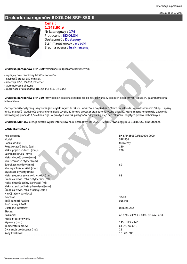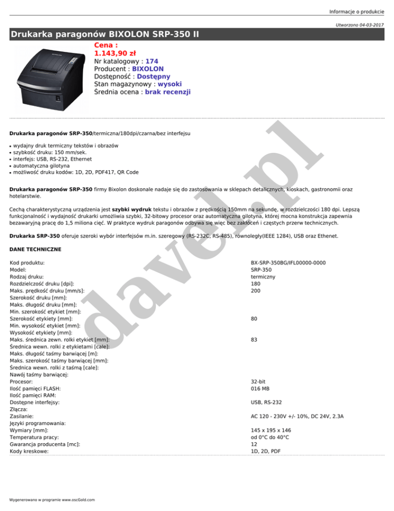 Informacje o produkcie Utworzono 04-03-2017 Drukarka paragonów BIXOLON SRP-350 II Cena : 1.143,90 zł Nr katalogowy : 174 Producent : BIXOLON Dostępność : Dostępny Stan magazynowy : wysoki Średnia ocena : brak recenzji ● ● ● ● wydajny druk termiczny tekstów i obrazów szybkość druku: 150 mm/sek. interfejs: USB, RS-232, Ethernet automatyczna gilotyna możliwość druku kodów: 1D, 2D, PDF417, QR Code .p ● l Drukarka paragonów SRP-350/termiczna/180dpi/czarna/bez interfejsu Drukarka paragonów SRP-350 firmy Bixolon doskonale nadaje się do zastosowania w sklepach detalicznych, kioskach, gastronomii oraz hotelarstwie. ve l Cechą charakterystyczną urządzenia jest szybki wydruk tekstu i obrazów z prędkością 150mm na sekundę, w rozdzielczości 180 dpi. Lepszą funkcjonalność i wydajność drukarki umożliwia szybki, 32-bitowy procesor oraz automatyczna gilotyna, której mocna konstrukcja zapewnia bezawaryjną pracę do 1,5 miliona cięć. W praktyce wydruk paragonów odbywa się więc bez zakłóceń i częstych przerw technicznych. Drukarka SRP-350 oferuje szeroki wybór interfejsów m.in. szeregowy (RS-232C, RS-485), równoległy(IEEE 1284), USB oraz Ethenet. DANE TECHNICZNE da Kod produktu: Model: Rodzaj druku: Rozdzielczość druku [dpi]: Maks. prędkość druku [mm/s]: Szerokość druku [mm]: Maks. długość druku [mm]: Min. szerokość etykiet [mm]: Szerokość etykiety [mm]: Min. wysokość etykiet [mm]: Wysokość etykiety [mm]: Maks. średnica zewn. rolki etykiet [mm]: Średnica wewn. rolki z etykietami [cale]: Maks. długość taśmy barwiącej [m]: Maks. szerokość taśmy barwiącej [mm]: Średnica wewn. rolki z taśmą [cale]: Nawój taśmy barwiącej: Procesor: Ilość pamięci FLASH: Ilość pamięci RAM: Dostępne interfejsy: Złącza: Zasilanie: Języki programowania: Wymiary [mm]: Temperatura pracy: Gwarancja producenta [mc]: Kody kreskowe: Wygenerowano w programie www.oscGold.com BX-SRP-350BG/IFL00000-0000 SRP-350 termiczny 180 200 80 83 32-bit 016 MB USB, RS-232 AC 120 - 230V +/- 10%, DC 24V, 2.3A 145 x 195 x 146 od 0°C do 40°C 12 1D, 2D, PDF