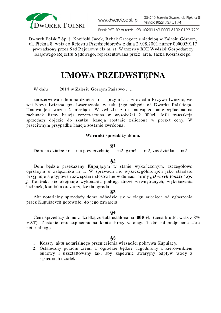 Dworek Polski” Sp. j. Koziński Jacek, Rybak Grzegorz z siedzibą w Zalesiu Górnym, ul. Piękna 8, wpis do Rejestru Przedsiębiorców z dnia 29.08.2001 numer 0000039117 prowadzony przez Sąd Rejonowy dla m. st. Warszawy XXI Wydział Gospodarczy Krajowego Rejestru Sądowego, reprezentowana przez arch. Jacka Kozińskiego. UMOWA PRZEDWSTĘPNA W dniu 2014 w Zalesiu Górnym Państwo ...... zarezerwowali dom na działce nr przy ul...... w osiedlu Krzywa Iwiczna, we wsi Nowa Iwiczna gm. Lesznowola, w celu jego nabycia od Dworku Polskiego. Umowa jest ważna 2 miesiąca. W związku z tą umową zostanie wpłacona na rachunek firmy kaucja rezerwacyjna w wysokości 2 000zł. Jeśli transakcja sprzedaży dojdzie do skutku, kaucja zostanie zaliczona w poczet ceny. W przeciwnym przypadku kaucja zostanie zwrócona. Warunki sprzedaży domu. §1 Dom na działce nr.... ma powierzchnię .... m2, garaż –...m2, zaś działka ... m2. §2 Dom będzie przekazany Kupującym w stanie wykończonym, szczegółowo opisanym w załączniku nr 1. W sprawach nie wyszczególnionych jako standard przyjmuje się typowe rozwiązania stosowane w domach firmy „Dworek Polski” Sp. j. Kontrakt nie obejmuje wykonania podłóg, drzwi wewnętrznych, wykończenia łazienek, kominka oraz urządzenia ogrodu. §3 Akt notarialny sprzedaży domu odbędzie się w ciągu miesiąca od zgłoszenia przez Kupujących gotowości do jego zawarcia. §4 Cena sprzedaży domu z działką została ustalona na 000 zł, (cena brutto, wraz z 8% VAT). Zostanie ona zapłacona na konto firmy w ciągu 7 dni od podpisania aktu notarialnego. §5 1. Koszty aktu notarialnego przeniesienia własności pokrywa Kupujący. 2. Ostateczny poziom ziemi w ogrodzie będzie uzgodniony z kierownikiem budowy i ukształtowany tak, aby zapewnić awaryjny odpływ wody z sąsiednich działek. §6 Dworek Polski udzieli na swoje prace rocznej gwarancji w zakresie prac wykończeniowych, 3 letniej w zakresie tych elementów domu, które mają wpływ na prawidłowe jego funkcjonowanie techniczne i 12 letniej w zakresie konstrukcji. §7 Dworek Polski oświadcza, że: 1. jest właścicielem przedmiotowej działki wpisanym do KW nr WA5M/00428165/2, 2. ustanowiona została służebność gruntowa dla PGE i Gminy Lesznowola, polegająca na poprowadzeniu instalacji w pasie między domem a ulicą; 3. dla inwestycji zostało wydane pozwolenie na budowę nr 500/07 z dnia 23.3.2007 4. tereny sąsiadujące przeznaczone są pod budownictwo jednorodzinne; 5. powierzchnie domów zostały policzone wg PN-ISO 9836 (powierzchnia netto); 6. Dworek Polski sp.j jest członkiem Polskiego Związku Firm Deweloperskich; 7. W akcie notarialnym zostanie ustanowiona służebność dojścia i dojazdu po działce nr 450, co zapewni dostęp do drogi publicznej. §8 Powyższa umowa nie jest „umową deweloperską” w sensie ustawy z dnia 16 września 2011 „o ochronie praw nabywcy lokalu mieszkalnego lub domu jednorodzinnego”. Budowa przedmiotowego domu została ukończona zarówno w wymiarze fizycznym jak i formalno-prawnym, przy czym w procesie inwestycyjnym nie były zaangażowane środki finansowe klienta, co oznacza, że sprzedaż domu nie podlega regulacjom powyższej ustawy, lecz ogólnym przepisom Kodeksu Cywilnego. Kupujący Dworek Polski ZAŁĄCZNIK nr 1 Standardowe wykończenie domu Wnętrze: - podłogi: na parterze – szlichta cementowa, na piętrze - płyta OSB 15mm; w łazience na piętrze – dodatkowa płyta OSB 6mm; schodki wejściowe, taras ogrodowy (12 m2) - płyty z piaskowca Tumlin; - sufity: w części dziennej polakierowane belki, poszycie z płyt gipsowych, pozostałe pomieszczenia - płyty gipsowe malowane na biało (3 razy); - ściany od wnętrza: płyty gipsowe pomalowane farbą emulsyjną (3 razy) ; w pomieszczeniach mokrych na ścianach płyta wodoodporna; - drzwi zewnętrzne – drewniane, trójwarstwowe (2 cm styropianu); - okna drewniane, z okuciami obwiedniowymi, szklone niskoemisyjnymi szybami zespolonymi, na parterze szyby antywłamaniowe; - elementy wykończenia (listwy, lamówki, parapety) drewniane, polakierowane; - schody wewnętrzne – stopnie z klejonego drewna jesionowego, policzki sosnowe, polakierowane; Elewacje zewnętrzne: - pokrycie dachu - gont bitumiczny; rynny - PCV; - ściany od strony zewnętrznej - tynk cementowo-wapienny na zbrojonych siatką płytach wiórowo-cementowych; - ogrody rozdzielone płotem z siatki; Instalacje wewnętrzne: - elektryczna (bez opraw oświetleniowych) przewody miedziane w podwójnej izolacji, prowadzone pod gipsem; norma - 1 punkt na 2.5 m 2 pow. podłogi; osprzęt typu Bingo, bez montażu gniazdek na glazurze; - kanalizacja - rury PCV; - wodna - rury polipropylenowe, bez montażu armatury; - CO – zbiornik ciepła zasilany kominkiem z płaszczem wodnym i dodatkowo elektrycznie, grzejniki wodne (konwekcyjne), rury polipropylenowe; Na parterze, w strefie kuchni, sieni i łazienki dodatkowe elektryczne ogrzewanie podłogowe; - ciepła woda – z wymiennika w zbiorniku ciepła. - Instalacja TV – 1 pkt. Instalacje zewnętrzne: - elektryczna - kanalizacja, sieć gminna; - woda z wodociągu gminnego; Garaż – nie ocieplony, od wnętrza widoczny szkielet; bramy drewniane, rozwierane, z napędem elektrycznym od strony ulicy;
