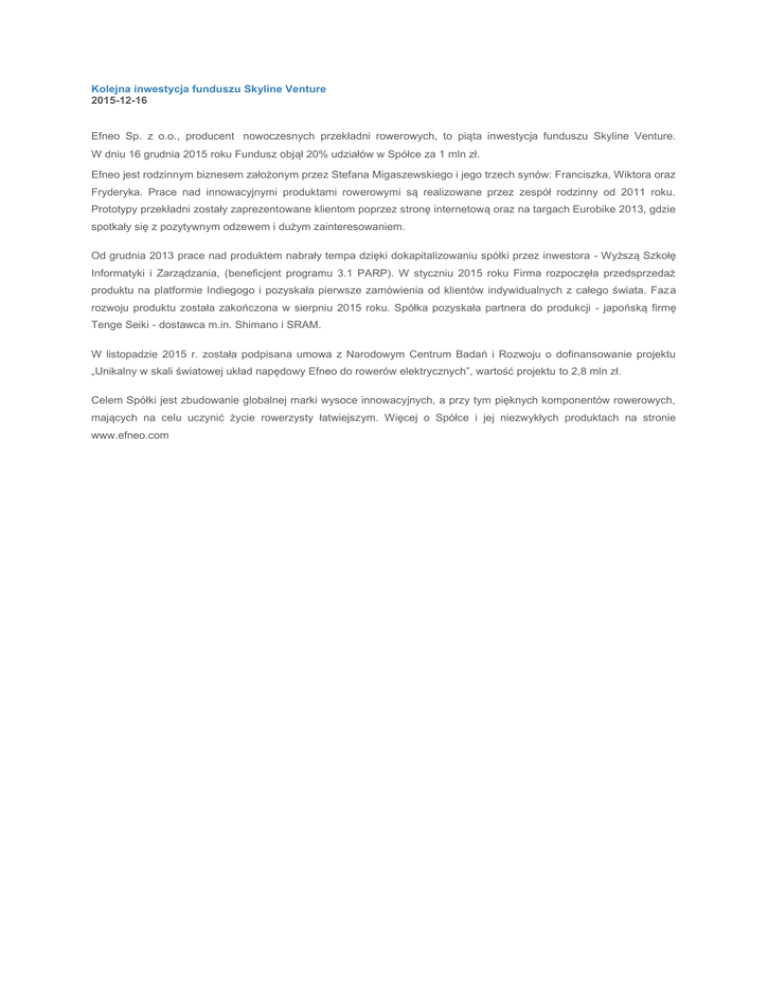 Kolejna inwestycja funduszu Skyline Venture 2015-12-16 Efneo Sp. z o.o., producent nowoczesnych przekładni rowerowych, to piąta inwestycja funduszu Skyline Venture. W dniu 16 grudnia 2015 roku Fundusz objął 20% udziałów w Spółce za 1 mln zł. Efneo jest rodzinnym biznesem założonym przez Stefana Migaszewskiego i jego trzech synów: Franciszka, Wiktora oraz Fryderyka. Prace nad innowacyjnymi produktami rowerowymi są realizowane przez zespół rodzinny od 2011 roku. Prototypy przekładni zostały zaprezentowane klientom poprzez stronę internetową oraz na targach Eurobike 2013, gdzie spotkały się z pozytywnym odzewem i dużym zainteresowaniem. Od grudnia 2013 prace nad produktem nabrały tempa dzięki dokapitalizowaniu spółki przez inwestora - Wyższą Szkołę Informatyki i Zarządzania, (beneficjent programu 3.1 PARP). W styczniu 2015 roku Firma rozpoczęła przedsprzedaż produktu na platformie Indiegogo i pozyskała pierwsze zamówienia od klientów indywidualnych z całego świata. Faza rozwoju produktu została zakończona w sierpniu 2015 roku. Spółka pozyskała partnera do produkcji - japońską firmę Tenge Seiki - dostawca m.in. Shimano i SRAM. W listopadzie 2015 r. została podpisana umowa z Narodowym Centrum Badań i Rozwoju o dofinansowanie projektu „Unikalny w skali światowej układ napędowy Efneo do rowerów elektrycznych”, wartość projektu to 2,8 mln zł. Celem Spółki jest zbudowanie globalnej marki wysoce innowacyjnych, a przy tym pięknych komponentów rowerowych, mających na celu uczynić życie rowerzysty łatwiejszym. Więcej o Spółce i jej niezwykłych produktach na stronie www.efneo.com
