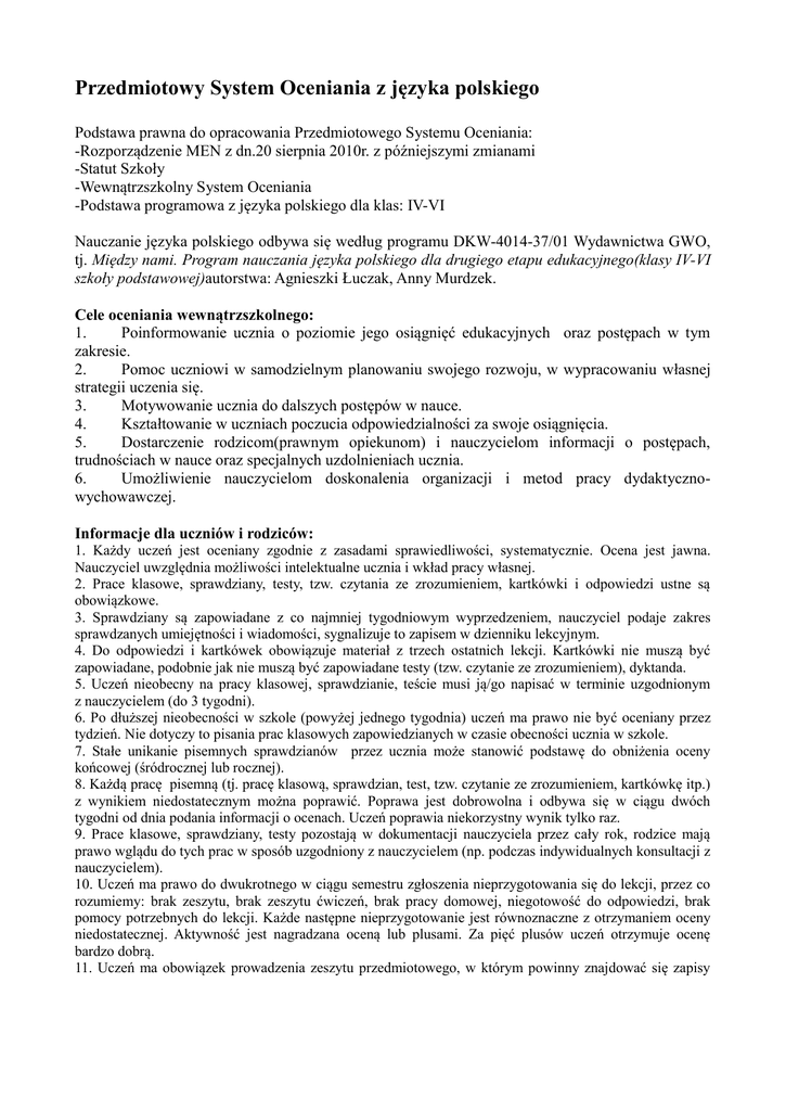 Przedmiotowy System Oceniania z języka polskiego Podstawa prawna do opracowania Przedmiotowego Systemu Oceniania: -Rozporządzenie MEN z dn.20 sierpnia 2010r. z późniejszymi zmianami -Statut Szkoły -Wewnątrzszkolny System Oceniania -Podstawa programowa z języka polskiego dla klas: IV-VI Nauczanie języka polskiego odbywa się według programu DKW-4014-37/01 Wydawnictwa GWO, tj. Między nami. Program nauczania języka polskiego dla drugiego etapu edukacyjnego(klasy IV-VI szkoły podstawowej)autorstwa: Agnieszki Łuczak, Anny Murdzek. Cele oceniania wewnątrzszkolnego: 1. Poinformowanie ucznia o poziomie jego osiągnięć edukacyjnych oraz postępach w tym zakresie. 2. Pomoc uczniowi w samodzielnym planowaniu swojego rozwoju, w wypracowaniu własnej strategii uczenia się. 3. Motywowanie ucznia do dalszych postępów w nauce. 4. Kształtowanie w uczniach poczucia odpowiedzialności za swoje osiągnięcia. 5. Dostarczenie rodzicom(prawnym opiekunom) i nauczycielom informacji o postępach, trudnościach w nauce oraz specjalnych uzdolnieniach ucznia. 6. Umożliwienie nauczycielom doskonalenia organizacji i metod pracy dydaktycznowychowawczej. Informacje dla uczniów i rodziców: 1. Każdy uczeń jest oceniany zgodnie z zasadami sprawiedliwości, systematycznie. Ocena jest jawna. Nauczyciel uwzględnia możliwości intelektualne ucznia i wkład pracy własnej. 2. Prace klasowe, sprawdziany, testy, tzw. czytania ze zrozumieniem, kartkówki i odpowiedzi ustne są obowiązkowe. 3. Sprawdziany są zapowiadane z co najmniej tygodniowym wyprzedzeniem, nauczyciel podaje zakres sprawdzanych umiejętności i wiadomości, sygnalizuje to zapisem w dzienniku lekcyjnym. 4. Do odpowiedzi i kartkówek obowiązuje materiał z trzech ostatnich lekcji. Kartkówki nie muszą być zapowiadane, podobnie jak nie muszą być zapowiadane testy (tzw. czytanie ze zrozumieniem), dyktanda. 5. Uczeń nieobecny na pracy klasowej, sprawdzianie, teście musi ją/go napisać w terminie uzgodnionym z nauczycielem (do 3 tygodni). 6. Po dłuższej nieobecności w szkole (powyżej jednego tygodnia) uczeń ma prawo nie być oceniany przez tydzień. Nie dotyczy to pisania prac klasowych zapowiedzianych w czasie obecności ucznia w szkole. 7. Stałe unikanie pisemnych sprawdzianów przez ucznia może stanowić podstawę do obniżenia oceny końcowej (śródrocznej lub rocznej). 8. Każdą pracę pisemną (tj. pracę klasową, sprawdzian, test, tzw. czytanie ze zrozumieniem, kartkówkę itp.) z wynikiem niedostatecznym można poprawić. Poprawa jest dobrowolna i odbywa się w ciągu dwóch tygodni od dnia podania informacji o ocenach. Uczeń poprawia niekorzystny wynik tylko raz. 9. Prace klasowe, sprawdziany, testy pozostają w dokumentacji nauczyciela przez cały rok, rodzice mają prawo wglądu do tych prac w sposób uzgodniony z nauczycielem (np. podczas indywidualnych konsultacji z nauczycielem). 10. Uczeń ma prawo do dwukrotnego w ciągu semestru zgłoszenia nieprzygotowania się do lekcji, przez co rozumiemy: brak zeszytu, brak zeszytu ćwiczeń, brak pracy domowej, niegotowość do odpowiedzi, brak pomocy potrzebnych do lekcji. Każde następne nieprzygotowanie jest równoznaczne z otrzymaniem oceny niedostatecznej. Aktywność jest nagradzana oceną lub plusami. Za pięć plusów uczeń otrzymuje ocenę bardzo dobrą. 11. Uczeń ma obowiązek prowadzenia zeszytu przedmiotowego, w którym powinny znajdować się zapisy tematów, notatki, zapisy poleceń ustnych lub pisemnych prac domowych. Zeszyt powinien być prowadzony systematycznie i starannie. W przypadku nieobecności uczeń powinien go uzupełnić. 12. Wszelkiego rodzaju prace ucznia(prace klasowe, sprawdziany, testy, tzw. czytania ze zrozumieniem, kartkówki, dłuższe zadania domowe itp.) nauczyciel ma obowiązek oddać sprawdzone w terminie 15 dni roboczych. 13. Uczeń winien zwrócić nauczycielowi prace pisemne w terminie przez niego wyznaczonym. Każde nieoddanie pracy zostanie odnotowane w dokumentacji własnej nauczyciela. 14. Przed zakończeniem klasyfikacji śródrocznej/rocznej nie przewiduje się dodatkowych sprawdzianów zaliczeniowych. 15. Na tydzień przed konferencją klasyfikacyjną nauczyciel informuje uczniów o przewidywanych ocenach z przedmiotu. O prognozowanej ocenie niedostatecznej nauczyciel informuje ucznia, a także jego wychowawcę z miesięcznym wyprzedzeniem. 16. Dopuszcza się przeprowadzenie egzaminu sprawdzającego osiągnięcia ucznia na pisemną prośbę rodziców ucznia. Egzamin taki może sie odbyć po uprzedniej rozmowie nauczyciela uczącego z rodzicami nie później niż 3 dni przed planowanym posiedzeniem rady pedagogicznej. Na lekcjach kontroli i ocenianiu podlegać będą: - odpowiedzi ustne, - aktywność i zaangażowanie ucznia(częste zgłaszanie się do odpowiedzi, samodzielne wyrażanie opinii na dany temat, umiejętność pracy w grupie), udział w debatach, - technika czytania i rozumienie tekstu, - analiza i interpretacja tekstów (wypowiedzi pisemne i ustne, czytanie na poziomie semantycznym, krytyczno- twórczym), - świadomość językowa ucznia (wypowiedzi ustne i pisemne oraz praktyczne wykorzystanie w nich wiedzy o języku), - pisemne wypowiedzi w tym sprawdziany (gramatyczne, leksykalne, dyktanda, wypracowania na dany temat, wypracowania z lektury, sprawdziany znajomości lektury; testy, tzw. czytanie ze zrozumieniem), - recytacja tekstów, - prace domowe odrabiane na bieżąco, w tym prace długoterminowe, - umiejętność pracy w grupie* (słuchanie i szanowanie poglądów innych, zabieranie głosu, pomoc w podejmowaniu decyzji, stopień zaangażowania w pracę zespołu, podejmowanie różnych ról w grupie, odpowiedzialność za wykonanie zadania). *Oceny za pracę w grupie wystawiane są po uwzględnieniu samooceny ucznia oraz oceny jego pracy przez innych członków grupy. Inne formy aktywności to: - samodzielne przygotowanie i prezentacja referatów, - wykonywanie komiksów, minisłownsików, album