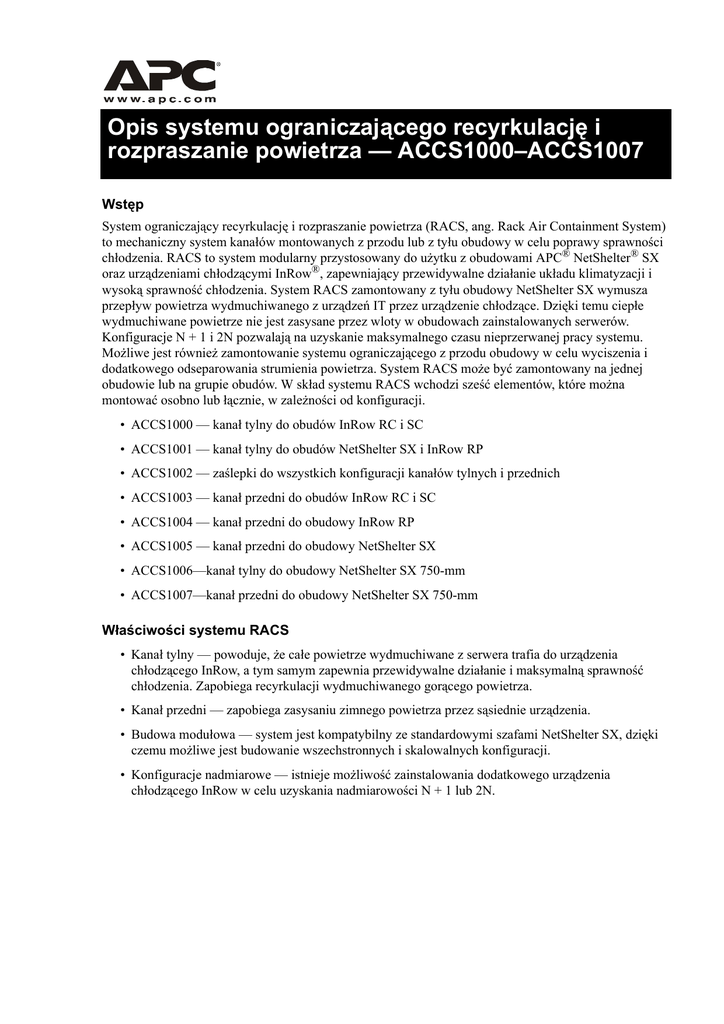 Opis systemu ograniczającego recyrkulację i rozpraszanie powietrza — ACCS1000–ACCS1007 Wstęp System ograniczający recyrkulację i rozpraszanie powietrza (RACS, ang. Rack Air Containment System) to mechaniczny system kanałów montowanych z przodu lub z tyłu obudowy w celu poprawy sprawności chłodzenia. RACS to system modularny przystosowany do użytku z obudowami APC® NetShelter® SX oraz urządzeniami chłodzącymi InRow®, zapewniający przewidywalne działanie układu klimatyzacji i wysoką sprawność chłodzenia. System RACS zamontowany z tyłu obudowy NetShelter SX wymusza przepływ powietrza wydmuchiwanego z urządzeń IT przez urządzenie chłodzące. Dzięki temu ciepłe wydmuchiwane powietrze nie jest zasysane przez wloty w obudowach zainstalowanych serwerów. Konfiguracje N + 1 i 2N pozwalają na uzyskanie maksymalnego czasu nieprzerwanej pracy systemu. Możliwe jest również zamontowanie systemu ograniczającego z przodu obudowy w celu wyciszenia i dodatkowego odseparowania strumienia powietrza. System RACS może być zamontowany na jednej obudowie lub na grupie obudów. W skład systemu RACS wchodzi sześć elementów, które można montować osobno lub łącznie, w zależności od konfiguracji. • ACCS1000 — kanał tylny do obudów InRow RC i SC • ACCS1001 — kanał tylny do obudów NetShelter SX i InRow RP • ACCS1002 — zaślepki do wszystkich konfiguracji kanałów tylnych i przednich • ACCS1003 — kanał przedni do obudów InRow RC i SC • ACCS1004 — kanał przedni do obudowy InRow RP • ACCS1005 — kanał przedni do obudowy NetShelter SX • ACCS1006—kanał tylny do obudowy NetShelter SX 750-mm • ACCS1007—kanał przedni do obudowy NetShelter SX 750-mm Właściwości systemu RACS • Kanał tylny — powoduje, że całe powietrze wydmuchiwane z serwera trafia do urządzenia chłodzącego InRow, a tym samym zapewnia przewidywalne działanie i maksymalną sprawność chłodzenia. Zapobiega recyrkulacji wydmuchiwanego gorącego powietrza. • Kanał przedni — zapobiega zasysaniu zimnego powietrza przez sąsiednie urządzenia. • Budowa modułowa — system jest kompatybilny ze standardowymi szafami NetShelter SX, dzięki czemu możliwe jest budowanie wszechstronnych i skalowalnych konfiguracji. • Konfiguracje nadmiarowe — istnieje możliwość zainstalowania dodatkowego urządzenia chłodzącego InRow w celu uzyskania nadmiarowości N + 1 lub 2N. Opis systemu ograniczającego recyrkulację i rozpraszanie powietrza — ACCS1000–ACCS1007 • Przezroczyste poliwęglanowe panele w drzwiach — stanowią barierę dla strumienia powietrza, a jednocześnie pozwalają na obserwację urządzeń IT i poprawiają estetykę pomieszczenia, nadając wszystkim szafom jednolity wygląd. • Drzwi zamykane na klucz — chronią zawartość obudowy. • Wyciszenie — kanały ograniczające recyrkulację i rozpraszania powietrza zamontowane z przodu i z tyłu obudowy tłumią hałas wytwarzany przez zainstalowane urządzenia. Kompatybilność System RACS można zainstalować na jednej lub kilku obudowach NetShelter SX w następujących konfiguracjach: • powrót powietrza przez kanał i pobieranie zimnego powietrza z otwartej przestrzeni; • powrót powietrza przez kanał i pobieranie zimnego powietrza przez kanał (konfiguracja zalecana w środowiskach niekontrolowanych). Poniższe konfiguracje umożliwiają odbiór gorącego powietrza i są zoptymalizowane albo pod kątem nadmiarowości, albo wydajności. 2 Liczba szaf NetShelter SX Racks Liczba urządzeń chłodzących InRow RC lub SC Liczba urządzeń chłodzących InRow RP 1 1 lub 2 1 2 2, 3 lub 4 1 lub 2 Opis systemu ograniczającego recyrkulację i rozpraszanie powietrza — ACCS1000–ACCS1007 RC RC InRow RC lub SC InfraStruXure InRow RC or SC SX Rack RC SX Rack RC RC SX Rack SX Rack 2+2 RC RC RC SX Rack SX Rack 2+3 RC RP RC RC SX Rack RP SX Rack SX Rack RC SX Rack RP 2+1 SX Rack 2+2 RP SX Rack InRow RP InfraStruXure InRow RP 2+4 RC SX Rack RP na2207a SX Rack SX Rack 3 Opis systemu ograniczającego recyrkulację i rozpraszanie powietrza — ACCS1000–ACCS1007 Symbole odsyłaczy Jeśli w celu zamontowania systemu RACS konieczne jest wymontowanie i ponowne zamontowanie innych urządzeń, należy skorzystać z instrukcji zamieszczonych w dokumentacji tych urządzeń. Ten symbol w instrukcji montażu systemu RACS oznacza odesłanie do instrukcji montażu urządzenia, która zawiera szczegółowe informacje. Ten symbol w instrukcji montażu systemu RACS informuje o konieczności przeczytania Opisu systemu RACS ACCS1000–ACCS1007 przed kontynuowaniem montażu urządzeń. Ten krótki dokument jest umieszczony w opakowaniu zaślepek systemu ograniczającego recyrkulację i rozpraszanie powietrza (ACCS1002). Potrzebne narzędzia Śrubokręt krzyżakowy (rozmiar 2) Śrubokręt T30 Torx® Klucz 10 mm Bezpieczeństwo i zasady postępowania System RACS jest przeznaczony do użytku wyłącznie z obudowami APC NetShelter SX. Uwaga Po zainstalowaniu systemu RACS konieczna jest zmiana konfiguracji oprogramowania firmware systemu chłodzenia. Odpowiednie instrukcje zawiera Instrukcja instalacji systemu chłodzenia, z którym współpracuje to urządzenie. Wydajność klimatyzatorów wchodzących w skład systemu musi być większa od obciążenia cieplnego szaf. Jeśli obciążenie cieplne przekroczy wydajność chłodniczą, temperatury Ostrożnie Caution wzrosną powyżej bezpiecznych wartości. Ostrożnie Caution 4 Nie należy instalować systemu RACS w środowiskach, w których punkt rosy (temperatura, w której zaczyna dochodzić do kondensacji) może przekroczyć 18,3°C (65°F). Konserwacja Czyszczenie przezroczystych poliwęglanowych paneli drzwiowych 1. Opłukać panel drzwiowy w ciepłej wodzie. Delikatnie umyć panel drzwiowy miękką ściereczką lub gąbką, ciepłą wodą i łagodnym mydłem lub innym detergentem. Ostrożnie Caution Nie należy szorować poliwęglanowych wkładek drzwiowyc