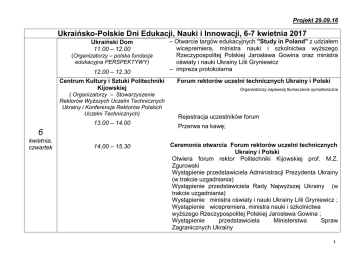 Projekt 29.09.16 Ukraińsko-Polskie Dni Edukacji, Nauki i Innowacji, 6-7 kwietnia 2017 Ukraiński Dom 11.00 – 12.00 (Оrganizatorzy – polska fundacja edukacyjna PERSPEKTYWY) 12.00 – 12.30 Centrum Kultury i Sztuki Politechniki Kijowskiej ( Оrganizatorzy – Stowarzyszenie Rektorów Wyższych Uczelni Technicznych Ukrainy i Konferencja Rektorów Polskich Uczelni Technicznych) 13.00 – 14.00 6 kwietnia, czwartek 14.00 – 15.30 – Otwarcie targów edukacyjnych "Study in Poland" z udziałem wicepremiera, ministra nauki i szkolnictwa wyższego Rzeczypospolitej Polskiej Jarosława Gowina oraz ministra oświaty i nauki Ukrainy Lilii Gryniewicz – impreza protokolarna Forum rektorów uczelni technicznych Ukrainy i Polski Organizatorzy zapewnią tłumaczenie symultaniczne Rejestracja uczestników forum Przerwa na kawę; Ceremonia otwarcia Forum rektorów uczelni technicznych Ukrainy i Polski Otwiera forum rektor Politechniki Kijowskiej prof. M.Z. Zgurowski Wystąpienie przedstawiciela Administracji Prezydenta Ukrainy (w trakcie uzgadniania) Wystąpienie przedstawiciela Rady Najwyższej Ukrainy (w trakcie uzgadniania) Wystąpienie ministra oświaty i nauki Ukrainy Lilii Gryniewicz ; Wystąpienie wicepremiera, ministra nauki i szkolnictwa wyższego Rzeczypospolitej Polskiej Jarosława Gowina ; Wystąpienie przedstawiciela Ministerstwa Spraw Zagranicznych Ukrainy 1 15.30 – 15.45 15.45 – 16.30 16.30 – 18.00 (w trakcie uzgadniania) Wystąpienie Ambasadora RP w na Ukrainie Jana Piekły Wystąpienie przedstawiciela władz państwowych; Wystąpienie przedstawiciela Narodowej Akademii Nauk Ukrainy; Wystąpienie przedstawiciela Polskiej Akademii Nauk; Wystąpienie przedstawiciela społeczności akademickiej i studenckiej Ukrainy i Polski Ceremonia podpisania „Ukraińsko-Polskiej Wspierania i Rozwoju Wiedzy Technicznej” Deklaracji Przerwa na kawę; Pierwsze posiedzenie plenarne Przewodniczą: prof. M.Z. Zgurowski, prof. T. Smółka Referaty rektorów uczelni technicznych Ukrainy i Polski dotyczące aktualnych kwestii europejskiego wektora rozwoju nauki, internacjonalizacji edukacji i współpracy międzynarodowej środowisk innowacyjnych; Propozycje dotyczące osób występujących: Prof. Tadeusz Smółka, przewodniczący Konferencji Rektórów Polskich Uczelni Technicznych, rektor AGH w Krakowie; Prof. Gennadij Piwniak, wiceprzewodniczący Rady Stowarzyszenia Rektorów Wyższych Uczelni Technicznych Ukrainy, rektor Narodowego Uniwersytetu Górniczego w Dniepropietrowsku; 2 ; Prof. Jewgenij Sokoł, rektor Politechniki Charkowskiej; Prof. Jan Schmidt, przewodniczący Konferencji Rektorów Polskich Uczelni Akademickich, rektor Politechniki Warszawskiej; Zygmunt Krasiński, dyrektor Narodowego Punktu Kontaktowego programu HORYZONT 2020 w Polsce; Prof. Tomasz Lodwigowski, zastępca przewodniczącego Konferencji Rektorów Polskich Uczelni Technicznych, rektor Politechniki Poznańskiej; 18.00 – 19.30 7 kwietnia, piątek Aula Senatu Politechniki Kijowskiej 09.30. – 09.50 09.50 -10.00 Sale wykładowe Politechniki Kijowskiej 10.00 – 12.00 Waldemar Siwiński, prezes Polskiej Fundacji Edukacyjnej "PERSPEKTYWY", prezes IREG; – impreza protokolarna organizowana w imieniu Konferencji Rektorów Polskich Uczelni Technicznych. Drugie posiedzenie plenarne. Przewodniczy: W. Siwiński Omówienie podstawowych zadań (warsztaty, seminaria, dyskusje panelowe) z różnych dziedzin (rozmieszczenie, struktura zarządzania: przewodniczący, zastępca przewodniczącego, sekretarz). Przejście na miejsce, gdzie będą odbywać się warsztaty, seminaria i dyskusje panelowe z różnych dziedzin Warsztaty, seminaria, dyskusje panelowe z różnych dziedzin : 3 1 Współpraca gospodarcz az zagranicą jako czynnik umiędzynar odowienia systemu szkolnictwa wyższego na Ukrainie 2 ? 3 4 5 6 7 «Opracowa nie systemu oceniania programów inżynierskic h» „Europejsk a akredytacj a programó w inżynierski ch” Dyskusja panelowa „Połączenie edukacji, nauki i innowacji – droga ku integracji Ukrainy i Polski do europejskie go systemu wyższego szkolnictwa techniczneg o” Tworzenie konsorcjów naukowców z Polski i z Ukrainy w celu uczestnictwa w programie UE ERASMUS+ 8 Strategiczne Dyskusja kierunki panelowa na współpracy temat: naukowej i „Podwójne tworzenia dyplomy konsorcjów (dyplomy naukowców Polski dwóch uczelni i z Ukrainy w celu partnerskich) uczestnictwa w programie UE HORIZON 2020 9 10 «Tworzenie europejskich sieci szkół startupów» (I. G. Maliukowa) W centrum przedsiębiorcz ości innowacyjnej – dyskusja panelowa na temat "Współdziałani e międzynarodo wych środowisk innowacyjnych ” 12.00 –12.30 – przerwa na lunch w klubie dla profesorów i wykładowców Alma Mater, 12.30 – 12.45 – Przejście uczestników do Centrum Kultury i Sztuki Politechniki Kijowskiej . Centrum Kultury i Sztuki Politechniki Kijowskiej 12.45 –13.15 – Końcowe posiedzenie plenarne Przewodniczą: prof. M.Z. Zgurowski, prof. T. Smółka Wystąpienie ministra oświaty i nauki Ukrainy Lilii Gryniewicz; Wystąpienie wicepremiera, ministra nauki i szkolnictwa wyższego Rzeczypospolitej Polskiej Jarosława Gowina; 4 13.15 –16.00 16.00 – 18.00 Wystąpienie przewodniczącego Rady Stowarzyszenia Rektorów Wyższych Uczelni Technicznych Ukrainy, rektora Politechniki Kijowskiej prof. Michaiła Z. Zgurowskiego Wystąpienie przewodniczącego Konferencji Rektorów Polskich Uczelni Technicznych prof. Tadeusza Smółki; Wystąpienie przewodniczącego Konferencji Rektorów Polskich Uczelni Akademickich, rektora Politechniki Warszawskiej prof. Jana Schmidta; Wystąpienie, prezesa Polskiej Fundacji Edukacyjnej "PERSPEKTYWY", prezesa IREG Waldemara Siwińskiego . Wnioski i zalecenia sformułowane w ramach przeprowadzonych warsztatów (seminariów, dyskusji panelowych). Przyjęcie wniosków i zaleceń. Zamknięcie. Wspólne zdjęcia. Konferencja prasowa. Wystąpienia młodzieży, która studiowała i robiła karierę w
