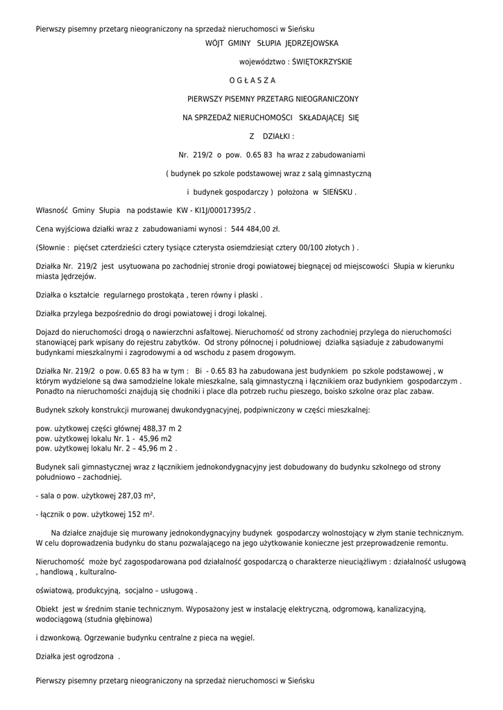 Pierwszy pisemny przetarg nieograniczony na sprzedaż nieruchomosci w Sieńsku WÓJT GMINY SŁUPIA JĘDRZEJOWSKA województwo : ŚWIĘTOKRZYSKIE OGŁASZA PIERWSZY PISEMNY PRZETARG NIEOGRANICZONY NA SPRZEDAŻ NIERUCHOMOŚCI SKŁADAJĄCEJ SIĘ Z DZIAŁKI : Nr. 219/2 o pow. 0.65 83 ha wraz z zabudowaniami ( budynek po szkole podstawowej wraz z salą gimnastyczną i budynek gospodarczy ) położona w SIEŃSKU . Własność Gminy Słupia na podstawie KW - KI1J/00017395/2 . Cena wyjściowa działki wraz z zabudowaniami wynosi : 544 484,00 zł. (Słownie : pięćset czterdzieści cztery tysiące czterysta osiemdziesiąt cztery 00/100 złotych ) . Działka Nr. 219/2 jest usytuowana po zachodniej stronie drogi powiatowej biegnącej od miejscowości Słupia w kierunku miasta Jędrzejów. Działka o kształcie regularnego prostokąta , teren równy i płaski . Działka przylega bezpośrednio do drogi powiatowej i drogi lokalnej. Dojazd do nieruchomości drogą o nawierzchni asfaltowej. Nieruchomość od strony zachodniej przylega do nieruchomości stanowiącej park wpisany do rejestru zabytków. Od strony północnej i południowej działka sąsiaduje z zabudowanymi budynkami mieszkalnymi i zagrodowymi a od wschodu z pasem drogowym. Działka Nr. 219/2 o pow. 0.65 83 ha w tym : Bi - 0.65 83 ha zabudowana jest budynkiem po szkole podstawowej , w którym wydzielone są dwa samodzielne lokale mieszkalne, salą gimnastyczną i łącznikiem oraz budynkiem gospodarczym . Ponadto na nieruchomości znajdują się chodniki i place dla potrzeb ruchu pieszego, boisko szkolne oraz plac zabaw. Budynek szkoły konstrukcji murowanej dwukondygnacyjnej, podpiwniczony w części mieszkalnej: pow. użytkowej części głównej 488,37 m 2 pow. użytkowej lokalu Nr. 1 - 45,96 m2 pow. użytkowej lokalu Nr. 2 – 45,96 m 2 . Budynek sali gimnastycznej wraz z łącznikiem jednokondygnacyjny jest dobudowany do budynku szkolnego od strony południowo – zachodniej. - sala o pow. użytkowej 287,03 m², - łącznik o pow. użytkowej 152 m². Na działce znajduje się murowany jednokondygnacyjny budynek gospodarczy wolnostojący w złym stanie technicznym. W celu doprowadzenia budynku do stanu pozwalającego na jego użytkowanie konieczne jest przeprowadzenie remontu. Nieruchomość może być zagospodarowana pod działalność gospodarczą o charakterze nieuciążliwym : działalność usługową , handlową , kulturalnooświatową, produkcyjną, socjalno – usługową . Obiekt jest w średnim stanie technicznym. Wyposażony jest w instalację elektryczną, odgromową, kanalizacyjną, wodociągową (studnia głębinowa) i dzwonkową. Ogrzewanie budynku centralne z pieca na węgiel. Działka jest ogrodzona . Pierwszy pisemny przetarg nieograniczony na sprzedaż nieruchomosci w Sieńsku Pierwszy pisemny przetarg nieograniczony na sprzedaż nieruchomosci w Sieńsku Koszty poniesione przez Gminę związane ze sprzedażą ponosi nabywca . Gmina Słupia posiada aktualny miejscowy plan przestrzennego Zagospodarowania Gminy . Zarządzeniem Nr. 73./2014 z dnia 06.10.2014 r Wójt Gminy wyznaczył termin przeprowadzenia pierwszego przetargu pisemnego nieograniczonego. Pierwszy pisemny przetarg nieograniczony odbędzie się w Urzędzie Gminy w Słupi w dniu 8 grudnia 2014 r (poniedziałek) –pokój Nr.10 - godz. 10 00 . Warunkiem przystąpienia do przetargu jest wpłacone Wadium w wysokości 10% ceny wyjściowej ( w formie pieniężnej ) w Kasie Urzędu Gminy w Słupi do dnia 3 grudnia 2014 r do godz. 1300 lub na konto Urzędu Gminy w Słupi Nr. 98 8513 1011 2001 0000 0013 0001 BS Sędziszów Oddział w Słupi Oferty należy składać w terminie do dnia 3 grudnia 2014 r do godz. 1300 w Sekretariacie Urzędu Gminy. Oferta z dołączoną kserokopią dowodu wpłaty Wadium na zakup działki winna być składana w osobnej kopercie wewnętrznej i zewnętrznej. Oferta powinna zawierać : imię i nazwisko oferenta, dokładny adres, datę sporządzenia oferty , proponowaną cenę , numer działki ,sposób zagospodarowania nieruchomości, Oświadczenie o zapoznaniu się z warunkami przetargu . W kopercie zewnętrznej zalakowanej z napisem „ Przetarg na zakup działki w Sieńsku ” a na wewnętrznej kopercie imię i nazwisko oferenta, dokładny adres oraz numer działki. Koszty związane ze sprzedażą działki ponosi nabywca. Osoby biorące udział w przetargu powinny zapoznać się ze stanem prawnym , granicami nieruchomości będące przedmiotem przetargu . W przypadku uchylenia się od zawarcia umowy wpłacone Wadium nie podlega zwrotowi, a jeżeli osoba ustalona na nabywcę nie stawi się w oznaczonym dniu u Notariusza właściciel może odstąpić od zawarcia Umowy Notarialnej. Organizatorowi przetargu przysługuje prawo odstąpienia od przeprowadzenia przetargu pisemnego nieograniczonego bez podania przyczyny. Bliższe informacje w Urzędzie Gminy w Słupi Jędrzejowskiej pokój Nr. 7 Tel. 041 38 16 024 lub 041 38 16 288 . Słupia dnia 06.10.2014 r Wójt Gminy Słupia Jędrzejowska Krzysztof Nowak Pierwszy pisemny przetarg nieograniczony na sprzedaż nieruchomosci w Sieńsku
