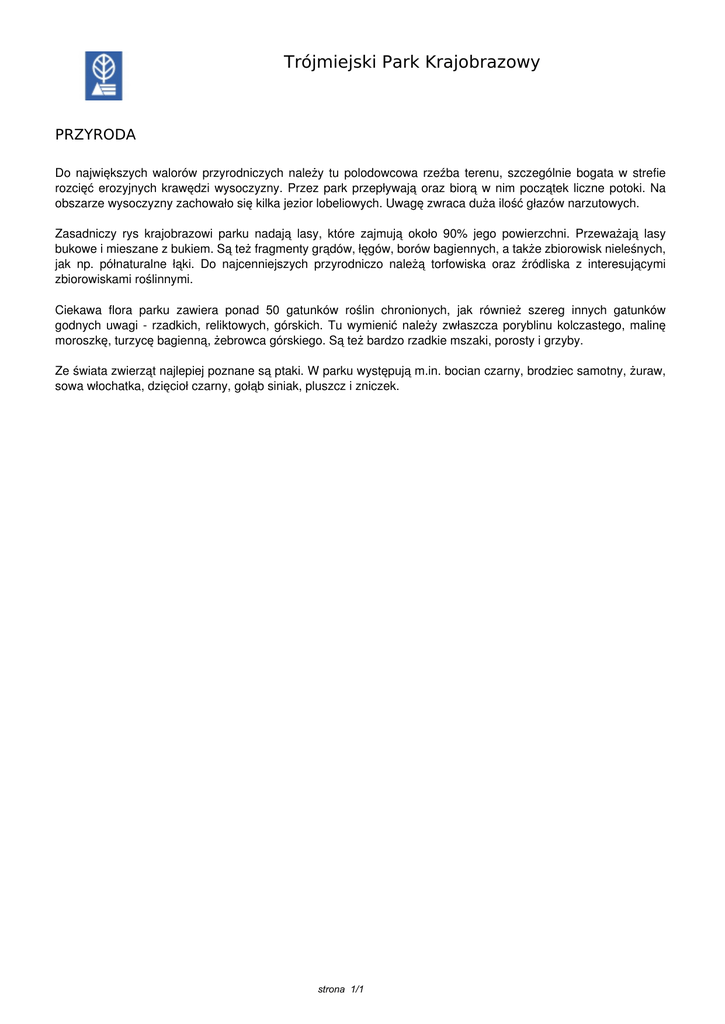 Trójmiejski Park Krajobrazowy PRZYRODA Do największych walorów przyrodniczych należy tu polodowcowa rzeźba terenu, szczególnie bogata w strefie rozcięć erozyjnych krawędzi wysoczyzny. Przez park przepływają oraz biorą w nim początek liczne potoki. Na obszarze wysoczyzny zachowało się kilka jezior lobeliowych. Uwagę zwraca duża ilość głazów narzutowych. Zasadniczy rys krajobrazowi parku nadają lasy, które zajmują około 90% jego powierzchni. Przeważają lasy bukowe i mieszane z bukiem. Są też fragmenty grądów, łęgów, borów bagiennych, a także zbiorowisk nieleśnych, jak np. półnaturalne łąki. Do najcenniejszych przyrodniczo należą torfowiska oraz źródliska z interesującymi zbiorowiskami roślinnymi. Ciekawa flora parku zawiera ponad 50 gatunków roślin chronionych, jak również szereg innych gatunków godnych uwagi - rzadkich, reliktowych, górskich. Tu wymienić należy zwłaszcza poryblinu kolczastego, malinę moroszkę, turzycę bagienną, żebrowca górskiego. Są też bardzo rzadkie mszaki, porosty i grzyby. Ze świata zwierząt najlepiej poznane są ptaki. W parku występują m.in. bocian czarny, brodziec samotny, żuraw, sowa włochatka, dzięcioł czarny, gołąb siniak, pluszcz i zniczek. strona 1/1 Powered by TCPDF (www.tcpdf.org)