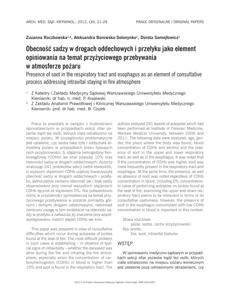 ARCH. MED. SĄD. KRYMINOL., 2012, LXII, 21-29 PRACE ORYGINALNE / ORIGINAL PAPERS Zuzanna Raczkowska1,2, Aleksandra Borowska-Solonynko1, Dorota Samojłowicz1 Obecność sadzy w drogach oddechowych i przełyku jako element opiniowania na temat przyżyciowego przebywania w atmosferze pożaru Presence of soot in the respiratory tract and esophagus as an element of consultative process addressing intravital staying in fire atmosphere 1 2 Z Katedry i Zakładu Medycyny Sądowej Warszawskiego Uniwersytetu Medycznego Kierownik: dr hab. n. med. P. Krajewski Z Zakładu Anatomii Prawidłowej i Klinicznej Warszawskiego Uniwersytetu Medycznego Kierownik: prof. dr hab. med. B. Ciszek Praca ta powstała w związku z trudnościami opiniodawczymi w przypadkach sekcji ofiar pożarów bądź też osób, których ciała odnaleziono na miejscu pożaru. W szczególności problematyczne jest ustalenie, czy osoba taka żyła i oddychała atmosferą pożaru w przypadkach braku typowych cech przyżyciowości, tj. stężenia hemoglobiny tlenkowęglowej (COHb) we krwi powyżej 10% oraz obecności sadzy w drogach oddechowych. Autorzy analizując 241 protokołów sekcji zwłok stwierdzili, iż wyższym stężeniom COHb częściej towarzyszyła obecność sadzy w drogach oddechowych i przełyku, jednocześnie zarówno obecność jak i brak sadzy obserwowano przy niemal wszystkich stężeniach COHb łącznie ze stężeniem 0%. Nie potwierdzono różnic w przydatności opiniodawczej na temat przyżyciowego przebywania w pożarze pomiędzy górnymi i dolnymi drogami oddechowymi, natomiast zwrócono uwagę w tym kontekście na obecność sadzy w przełyku a zwłaszcza jej znaczenie przy współwystępowaniu niskich stężeń COHb we krwi. This paper was prepared in view of consultative difficulties which occur during autopsies of bodies found at the seat of fire. The most difficult problem in such cases is establishing – in absence of typical signs of intravitality – whether the deceased was alive during the fire and inhaling the fire atmosphere; especially when the concentration of carboxyhemoglobin (COHb) in blood is higher than 10% and soot is found in the respiratory tract. The authors analyzed 241 reports of autopsies which had been performed at Institute of Forensic Medicine, Warsaw Medical University, between 2006 and 2011. The following data were analyzed: age, gender, the place where the body was found, blood concentration of COHb and alcohol and the presence of soot in the upper and lower respiratory tract, as well as in the esophagus. It was noted that if the concentration of COHb was higher, soot was more frequently present in the respiratory tract and esophagus. At the same time, the presence, as well as absence of soot was noted regardless of COHb concentration in blood, including 0% concentration. In cases of performing autopsies on bodies found at the seat of fire, examining the upper and down respiratory tract seems to be irrelevant in terms of its consultative usefulness; however, the presence of soot in the esophagus concomitant with low COHb concentration in blood is important in this context. Słowa kluczowe: pożar, sadza, cechy przyżyciowości Key words: fire, soot, intravital features WSTĘP W opiniowaniu medyczno-sądowym w przypadkach sekcji ofiar pożarów bądź też osób, których ciała odnaleziono na miejscu pożaru koniecznym jest ustalenie poza odniesionymi obrażeniami, czy 2012 © by Polskie Towarzystwo Medycyny Sądowej i Kryminologii, ISSN 0324-8267 22 Nr 1 Zuzanna Raczkowska, Aleksandra Borowska-Solonynko, Dorota Samojłowicz osoba ta żyła i oddychała atmosferą pożaru. Przypadki, w których stwierdzono wysokie stężenia hemoglobiny tlenkowęglowej oraz obecność sadzy w drogach oddechowych wydają się być oczywistymi. Problematyczne są przypadki w których stwierdzamy niskie stężenia COHb i jednocześnie nie obserwujemy sadzy w drogach oddechowych. Autorzy pracy podjęli próbę poszukiwań wzajemnych korelacji między tymi zmiennymi i ewentualnych innych czynników dających możliwość ustalenia, czy osoba zmarła żyła i oddychała atmosferą pożaru. MATERIAŁ I METODY WYNIKI Wśród analizowanych przypadków było 180 mężczyzn i 41 kobiet. Średni wiek ofiar to 52,6 lat (min. – 8 miesięcy, max. – 97 lat), przy czym średni wiek kobiet był nieco wyższy niż mężczyzn (60,4 v 50,2 lata). Rozkład wiekowy w całej grupie badanej przedstawia ryc. 1. 60 50 Liczba obs. / Number of persons Materiał do pracy stanowiło 241 protokołów sekcji zwłok osób, które zginęły w wyniku pożaru lub ich zwłoki zostały ujawnione w miejscu pożaru. Wstępnie z analizy wykluczono wszystkie przypadki ofiar pożaru hospitalizowanych ponad 24 godziny. Sądowo-lekarskie oględziny i sekcje zwłok wykonano w latach 2006-2011 w Katedrze i Zakładzie Medycyny Sądowej w Warszawie i zostały poszerzone dodatkowo o badania stężenia tlenku węgla we krwi metodą Wolffa oraz w większości przypadków o badania stężenia alkoholu etylowego we krwi metodą chromatografii gazowej. Analizie poddano następujące dane: wiek i płeć ofiar, miejsce ujawnienia zwłok, stężenie COHb (hemoglobiny tlenkowęglowej) we krwi oraz stężenie alkoholu etylowego we krwi, przy czym w zależności od jego stężenia całą grupę badaną podzielono na dwie podgrupy (trzeźwi do 0,5‰ i osoby nietrzeźwe > 0,5‰). W przypadkach osób hospitalizowanych do badań wykorzystano wyniki analiz stężenia COHb we krwi pobranej podczas sekcji zwłok. Jednocześnie wyniki te porównano z poziomami COHb stwierdzanymi w badaniach szpitalnych, nie stwierdzając istotnych różnic, co zapewne wynikało z krótkiego okresu hospitalizacji. Dodatkowo brano pod uwagę obecność lub brak: sadzy w górnych lub/i dolnych drogach oddechowych oraz sadzy w przełyku. Dokonano także analizy w podgrupach w zależności od stężeń COHb we krwi: grupa bez obecności COHb lub z jego niskimi stężeniami w zakr